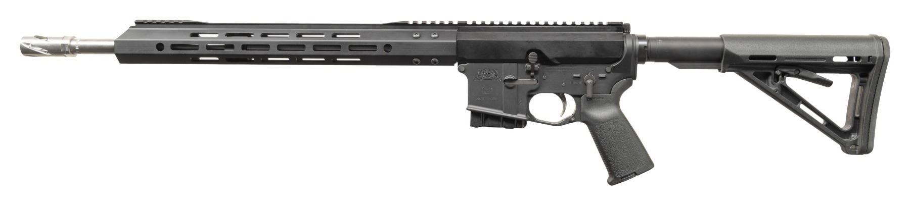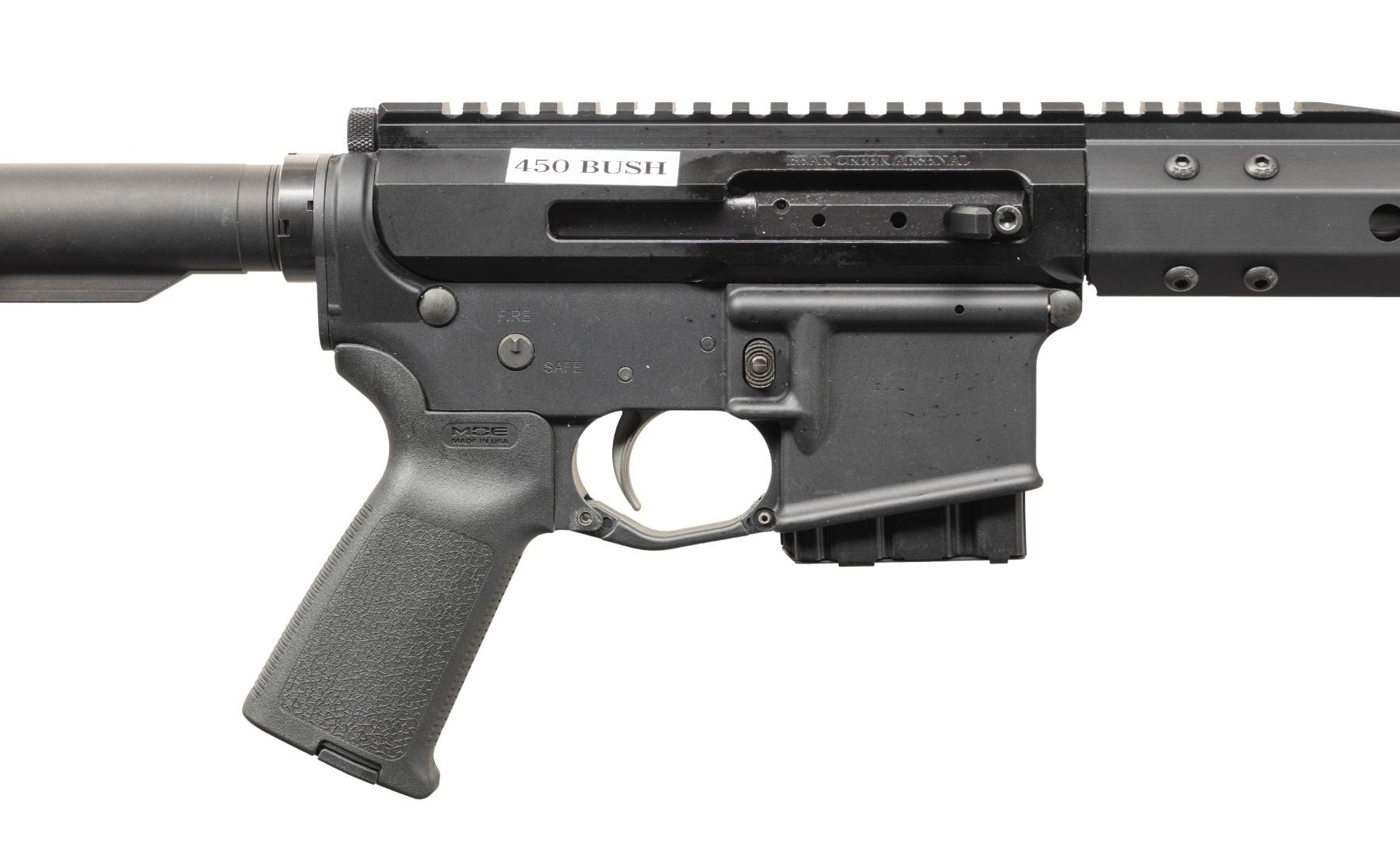 Cal. 450 Bushmaster. S# SCB715049. Bbl. 18". Stainless Steel 1:24 barrel terminated w/ spiral muzzle brake. 15" free floating handguard. Flat top, right-side charging upper receiver. 6 position carbine buffer tube w/ Magpul MOE collapsible shoulder stock. MAGS: 1 aluminum 5 rd. CONDITION: All aspects indicate very little use, if any. Mirror bright bore w/ strong rifling. Fire control mechanism appears to function correctly when cycled by hand. (25-6103/JZ). MODERN. $600-900.