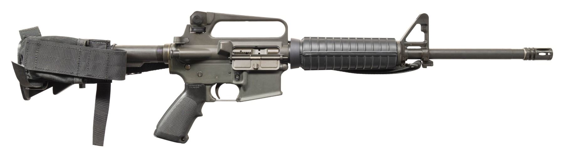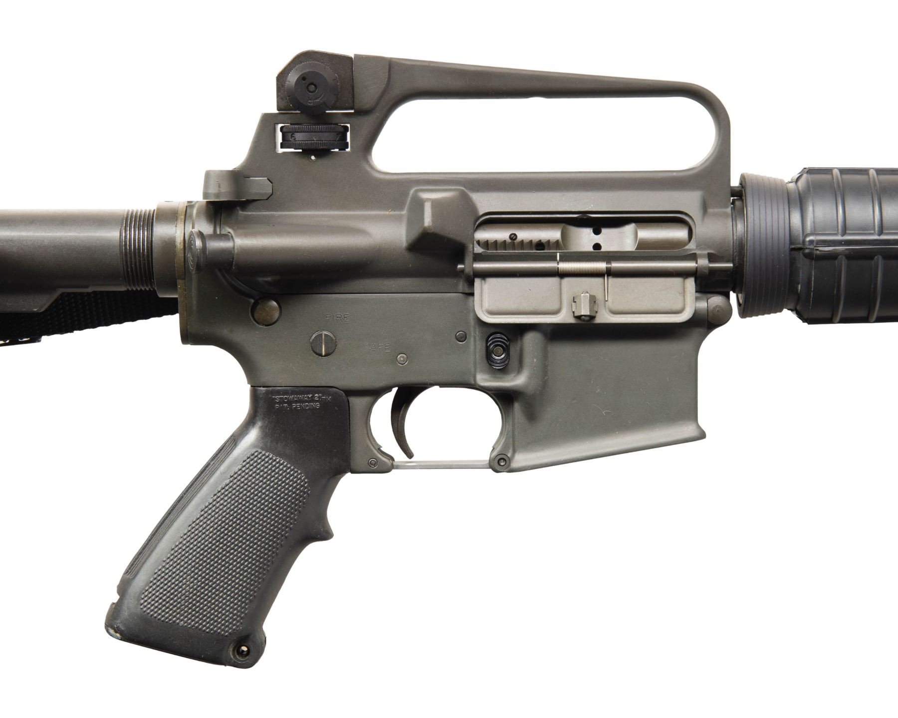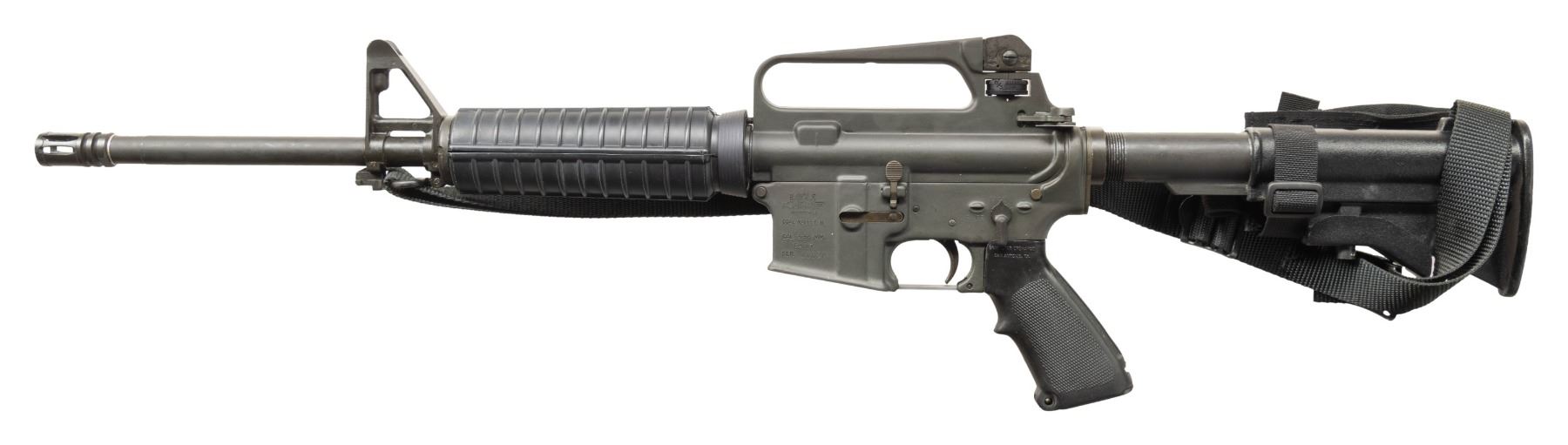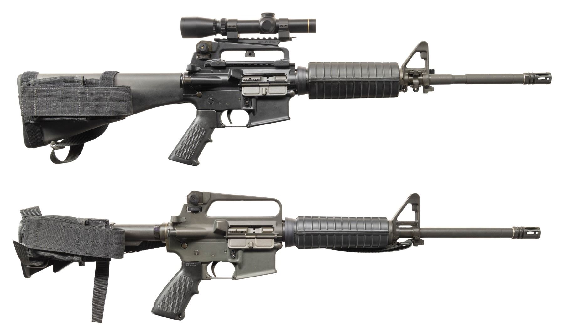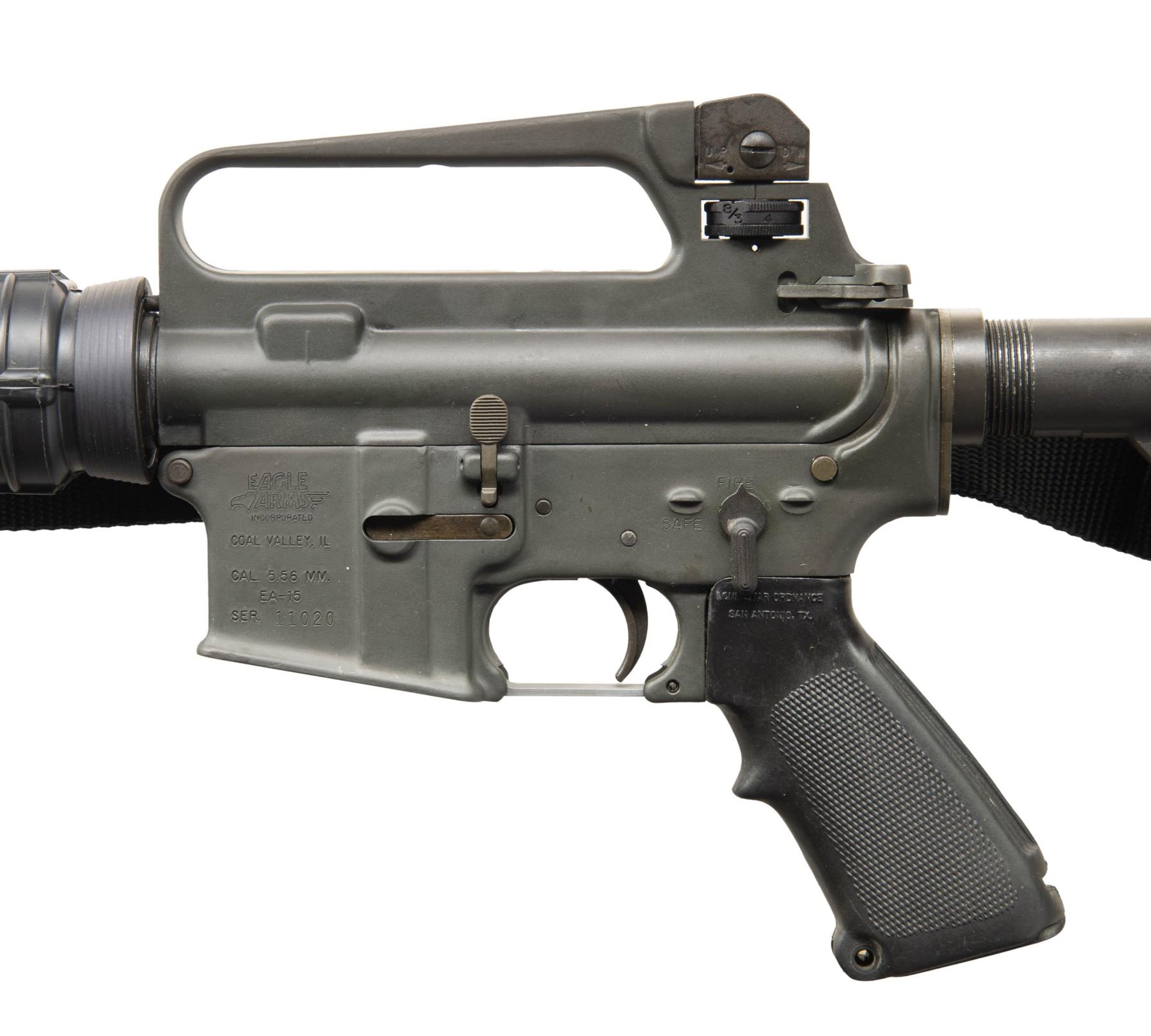 2) Eagle Arms, Model EA-15 Carbine. Cal. 5.56mm. S# 11020. Bbl. 16". Barrel terminated w/ A2 flash hider. Protected post front sight / gas block / bayonet lug. A2 style, carbine length handguards retained by tapered delta ring. Carry handle upper receiver w/ round forward assist & brass deflector. Adjustable, dual aperture rear sight. SP1 profile bolt carrier. 3 position buffer tube w/ aluminum shoulder stock. Black, nylon sling. CONDITION: finish complete & consistent w/ little sign of prior use. Broken buffer retaining pin. Bright bore w/ strong rifling. Fire control mechanism appears to function correctly when cycled by hand. (25-4726/JZ). MODERN. $800-1,200.