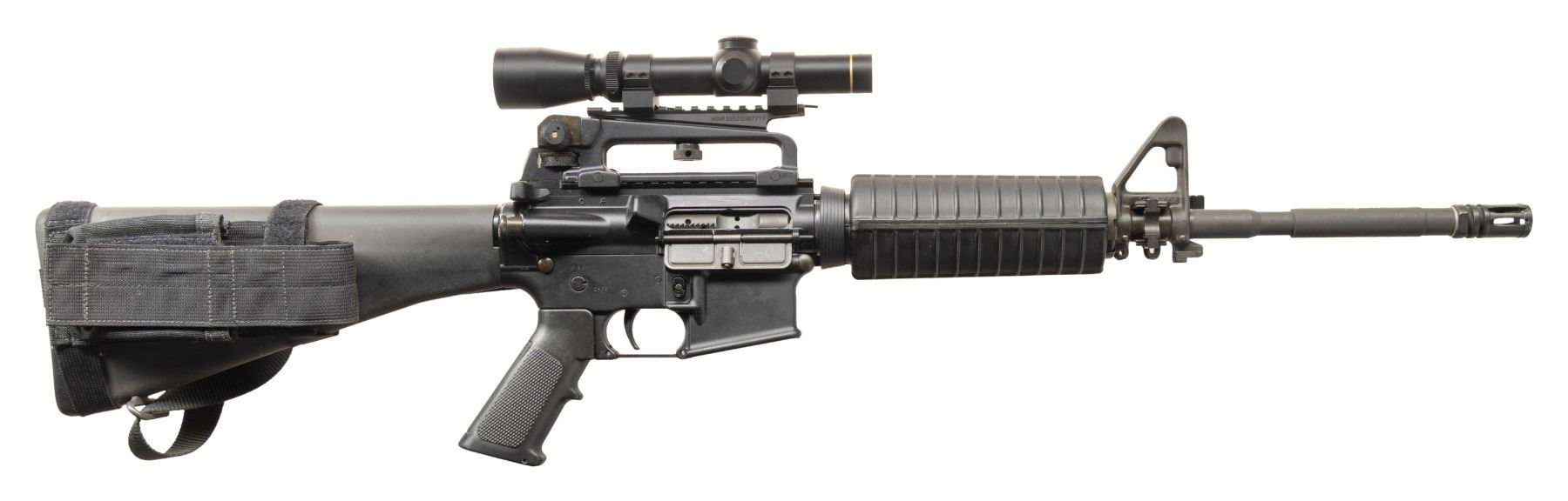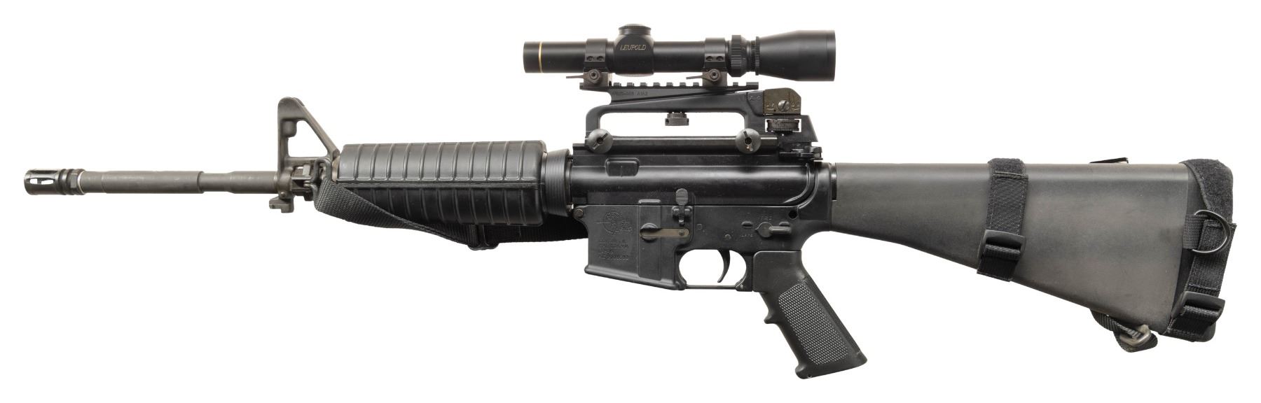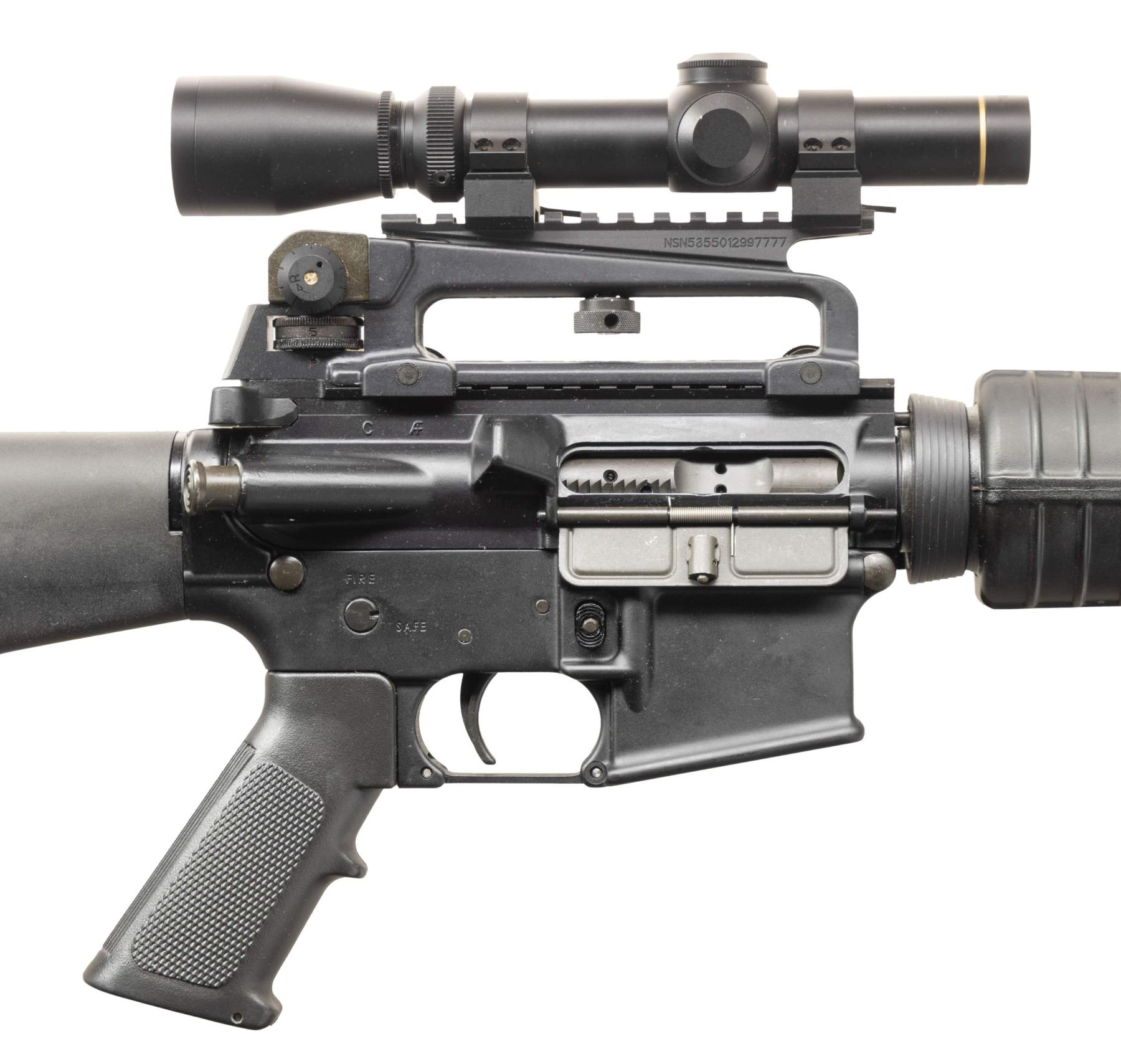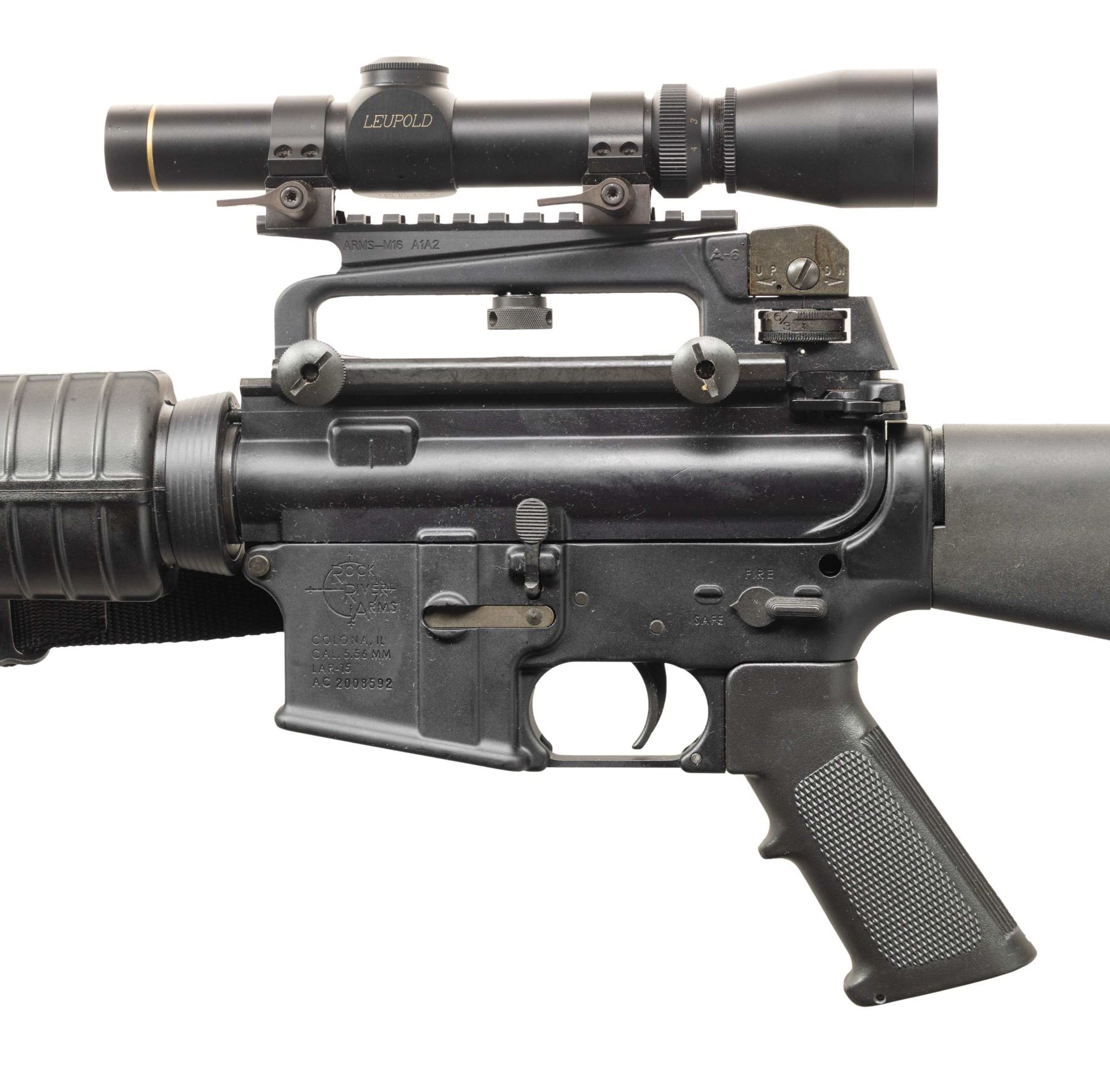 1) Rock River Arms, Model LAR15 Carbine. Cal. 5.56mm. S# AC2008592. Bbl. 16". M4 style barrel terminated w/ A2 flash hider. Protected post front sight / gas block / bayonet lug. A2 style, carbine length handguards retained by tapered delta ring. Flat top upper receiver w/ round forward assist & brass deflector. Currently sporting removable carry handle & adjustable, dual aperture rear sight. ARMS mount w/ Leupold 1-4x scope w/ duplex reticle. SP1 profile bolt carrier. Full length rifle shoulder stock. Black, nylon sling. CONDITION: finish complete & consistent w/ little sign of prior use. Bright bore w/ strong rifling. Fire control mechanism appears to function correctly when cycled by hand. (25-4626/JZ). MODERN.