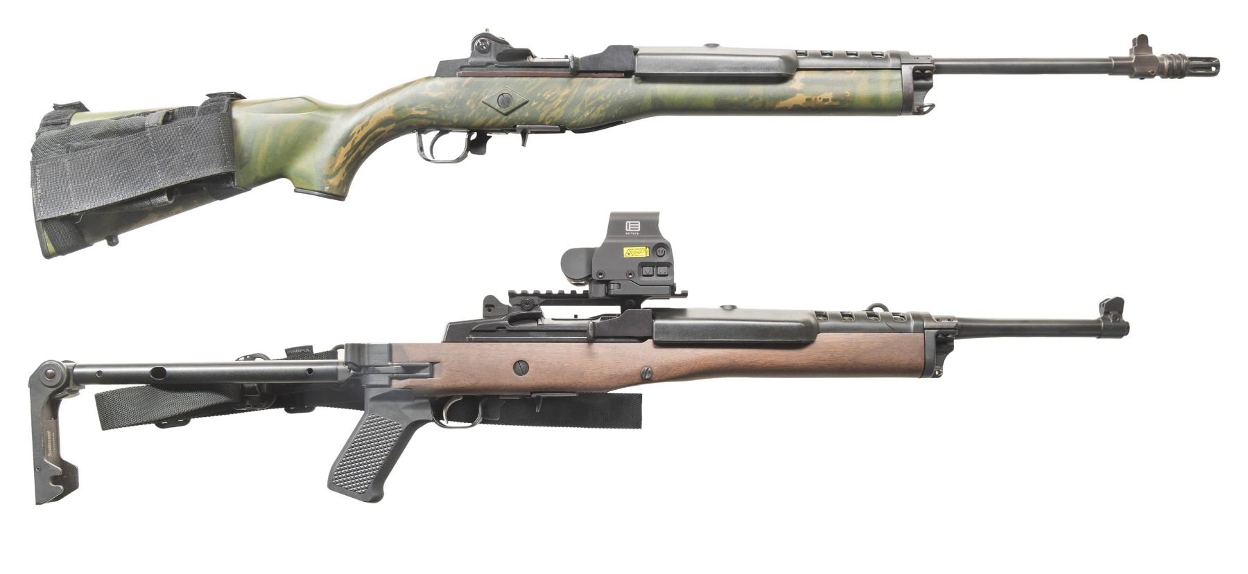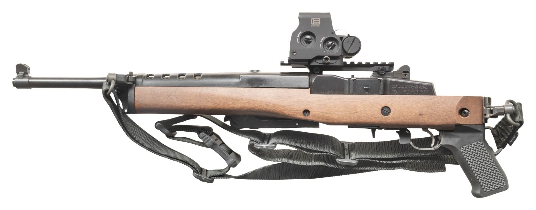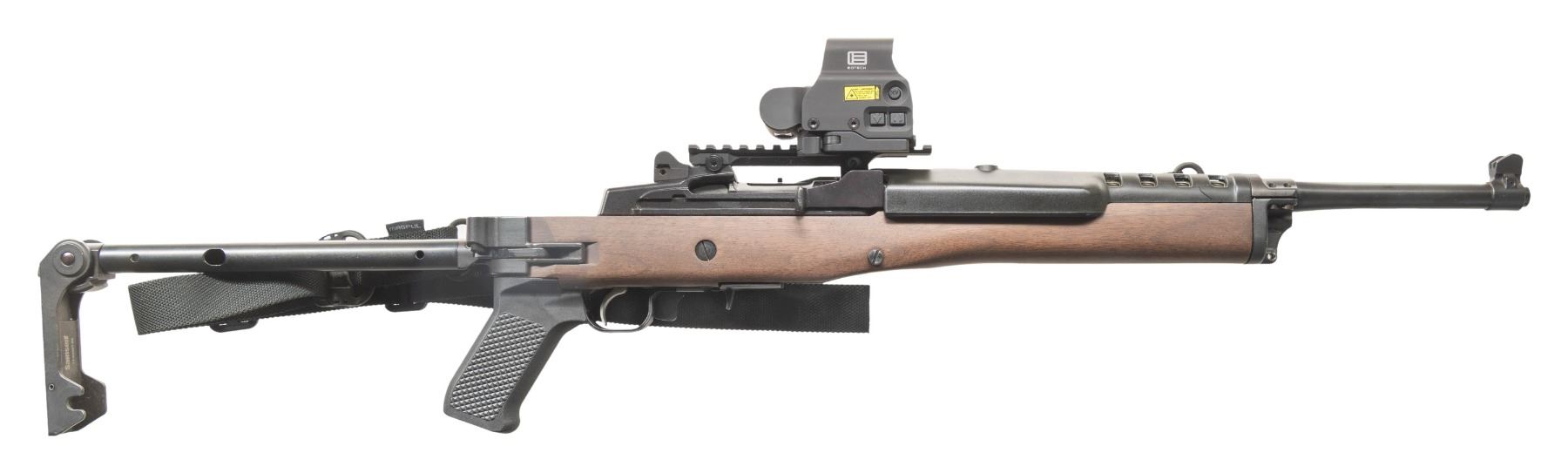 2) RANCH RIFLE. Cal. 223 Rem. S# NRA805165. Bbl. 16 1/8" heavy profile with banded serrated blade front sight having protective wings; factory ghost ring receiver mounted rear sight. Receiver milled for Ruger scope rings; has Picatinny adapter base installed holding EOTECH reflex sight having lever release base and Night Vision capability (late variant using cross loaded CR123 battery). Mfg. 2008 as special edition under direction of CEO Stephen Sanetti to benefit NRA-ILA (Institute for Legislative Action) that was established 1975. Originally issued as Model 05835 with Hogue OverMolded stock and its present Ruger black fiberglass handguard. Retro fitted with Samson folding stock and Samson upper gas block allowing detachable Uncle Mike style sling swivels on left side (also at rear by pistol grip) like original Ruger folding stocks that were made by Samson. Stock is walnut rather than walnut stained birch of the originals. In place of UM detachable swivels are Samson adapters that utilize modern military style push button release swivels plus a black nylon web sling by MAGPUL. Top quality (pricey!) additions to the basic NRA-ILA Edition. MAGS: NONE. Readily available from commercial sources and Ruger. CONDITION: all aspects near excellent with unused appearance to include bore and operable EOTECH. (25-4630/NW). BOTH MODERN. $1,000-1,500.