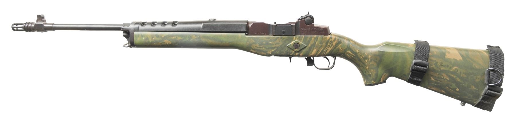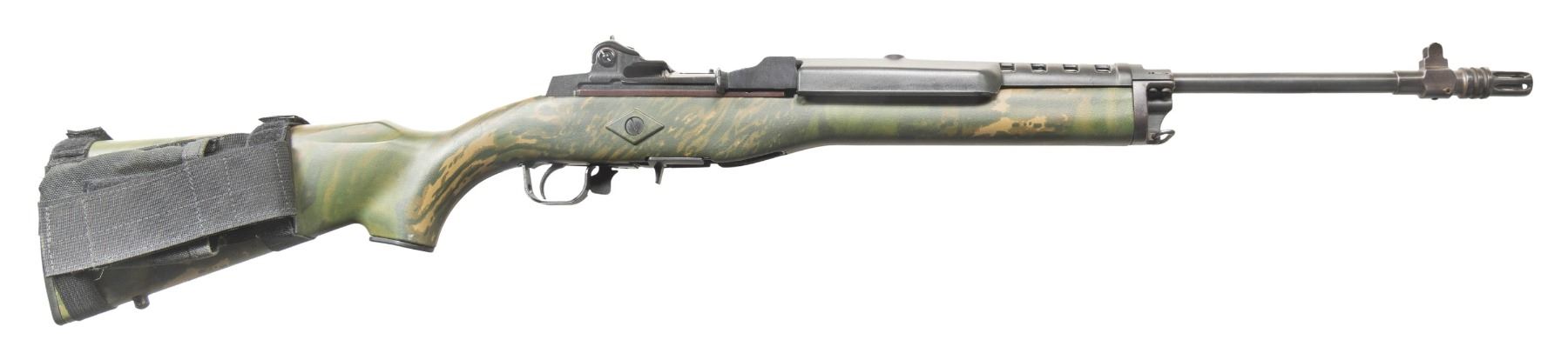 1) MINI-14. Cal. 223 Rem. S# 186-70865. Bbl. 18 1/2" with "CT" marked aftermarket flash hider / blade front sight with protective ears; factory rear receiver sight. Mfg. 1998 (1974 to date for all Mini's) as Model 01801 with walnut stained birch carbine stock set. Fitted with Ram-Line RealTree camo stock plus factory black fiberglass handguard and sling stud; factory swivel on gas block. Tactical Tailor black nylon mag pouch attached to butt. MAGS: NONE. Readily available from commercial sources and Ruger. CONDITION: stock has very light handling marks. Receiver is plum colored from rebluing with some edge & handling wear. Other metal parts retain over 85% reblue with some edge wear & slight patina. Action functions properly when hand cycled. Bright near excellent bore. (25-4629/MJC).