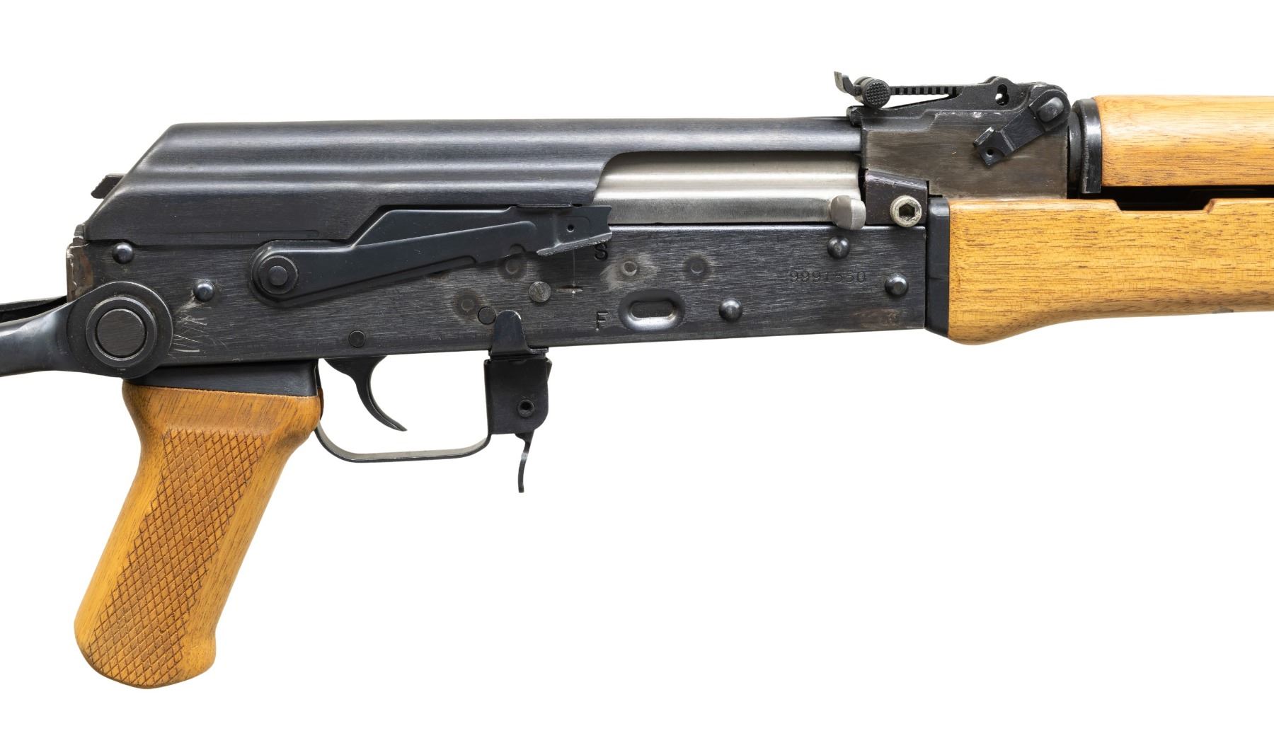 Cal. 7.62x39mm. S# 9991550. Bbl. 16 1/4". AK47S semi-automatic rifle mfg. by B-West of Tucson, AZ. Left side of the receiver is marked with B-West's mfg. information above the model and cal. designations, as well as "MADE IN USA", with the S# marked on the right. Rear flat of receiver is marked "*NMSAMA*/ NM SA MA. SAUGUS MA. EXP. SAMPLE". Metal components exhibit a blue finish overall, save for on the bolt, which exhibits a dull gray finish. Plain wood forearm and handguard, with checkered wood pistol grip and steel under-folding buttstock. Open top AK pattern post front sight with U-notch rear sight marked "D" (at lowest position) and graduated 1-8. Chrome lined bore with threaded AKM pattern slant brake. Trunnion is retained via a threaded screw and hex nut. Left side of the receiver exhibits 2 drilled holes, likely for an optic rail. Complete with gray/green leather sling. Stock does not lock in the folded position. Mag. is absent. CONDITION: metal components retain the majority of their original factory blue finish, exhibiting some scattered superficial handling marks, with a couple of areas of wear present on the bbl. and left side of the receiver, presumably from mfg./assembly. Mirror chrome lined bore, retaining well defined rifling throughout. Proper manual mechanics. Wood furniture shows a few scattered handling marks, with 2 impressions present on the underside of the forearm from the under-folding stock. (25-2958/MLW). MODERN. $800-1,200.