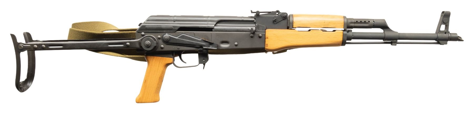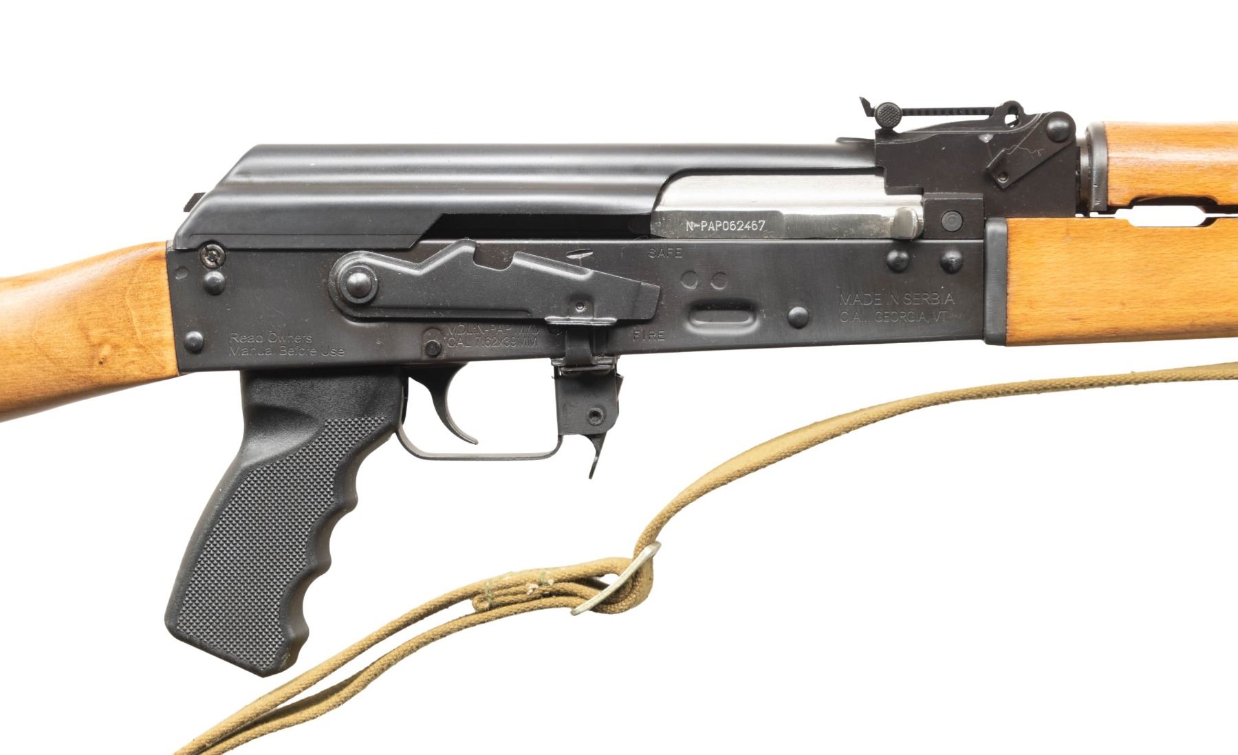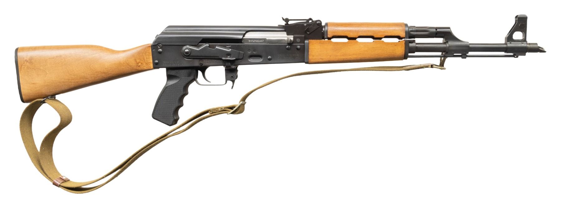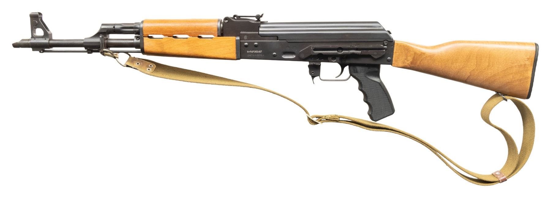 1) Zastava, model N-PAP M70 Carbine. Cal. 7.62X39. S# N-PAP062467. Bbl. 16". Barrel terminated w/ slant muzzle brake. Matte black finish on all exposed surfaces. Protected post front sight. Onboard cleaning rod below gas block. No bayonet lug. Blond forend w/ matching, full length shoulder stock. Elevation adjustable rear sight. Right side safety / selector. Black plastic pistol grip. Scope mount integral to left side of receiver. Green canvas sling. CONDITION: All aspects indicate very little prior use, if any. Bright bore w/ strong rifling. Fire control mechanism appears to function correctly when cycled by hand. (25-4637/JZ). MODERN.