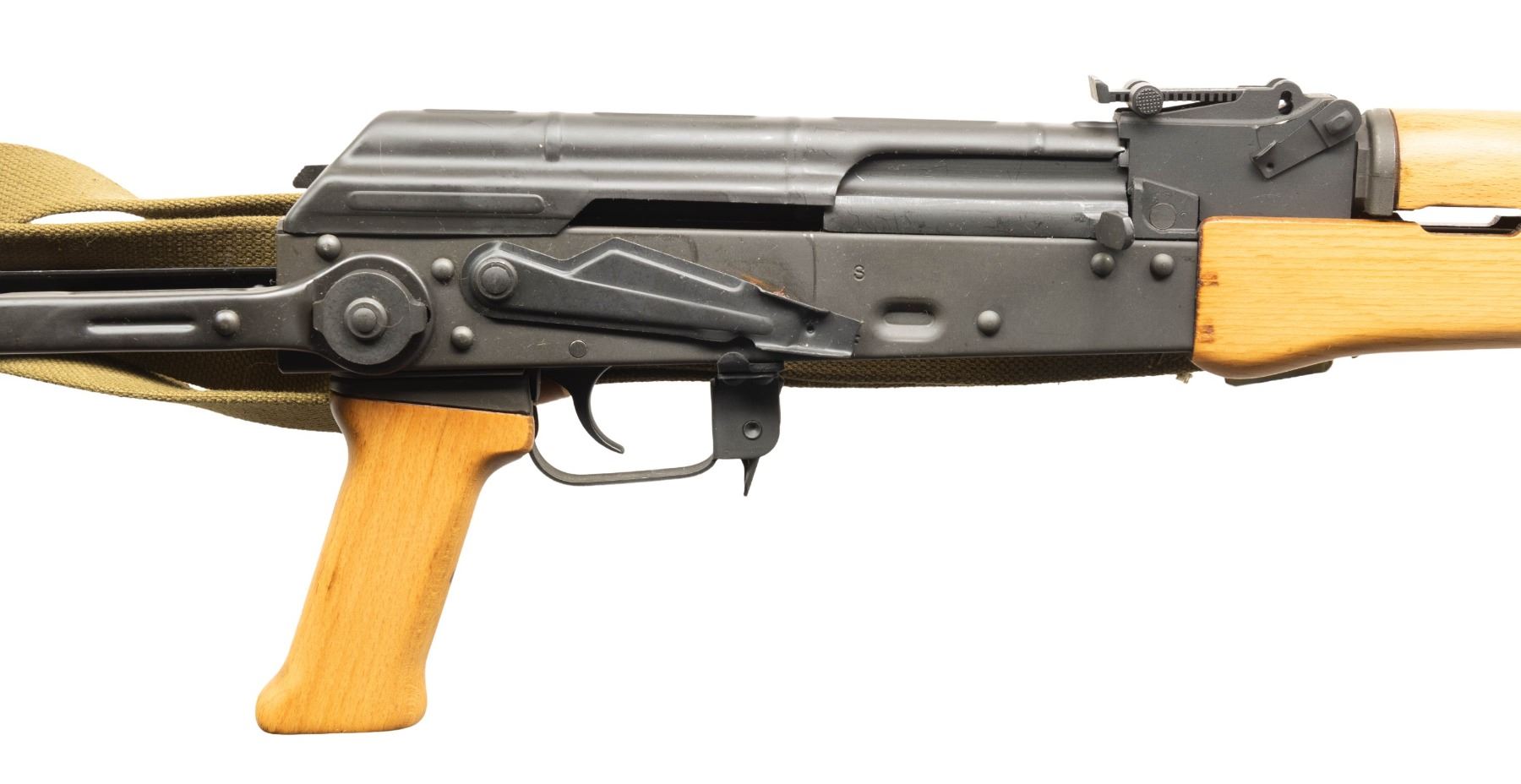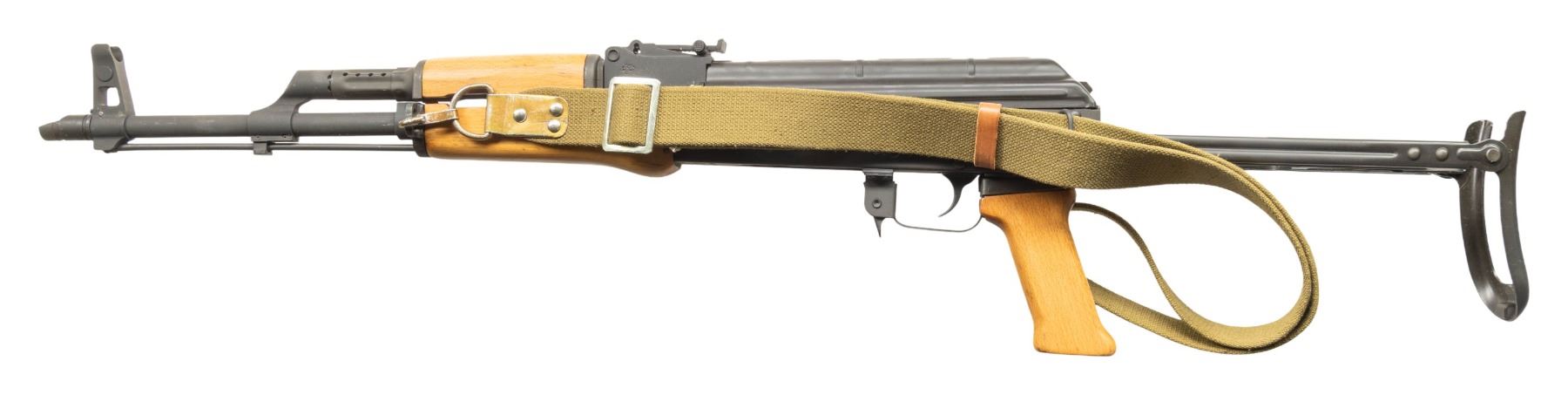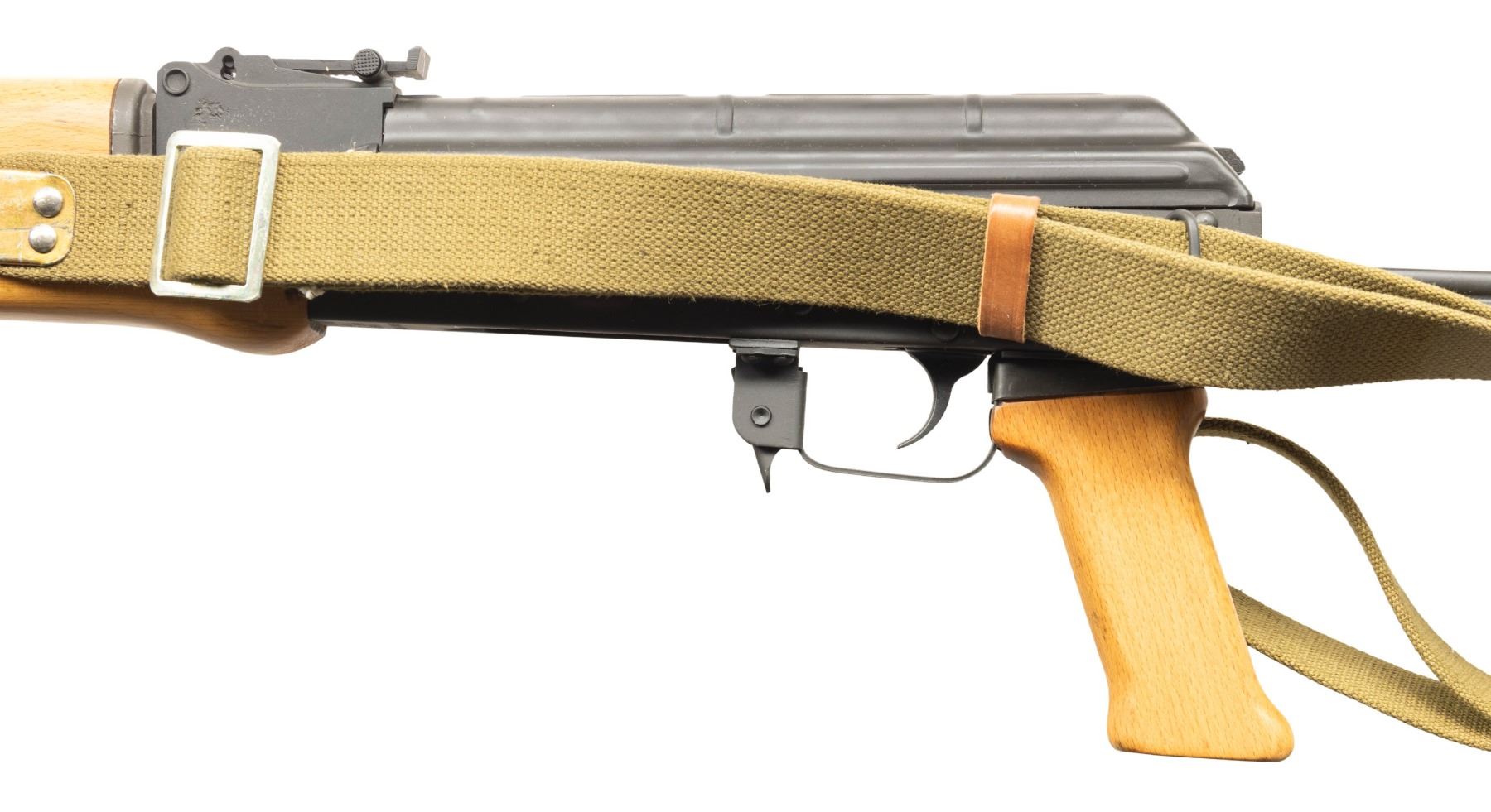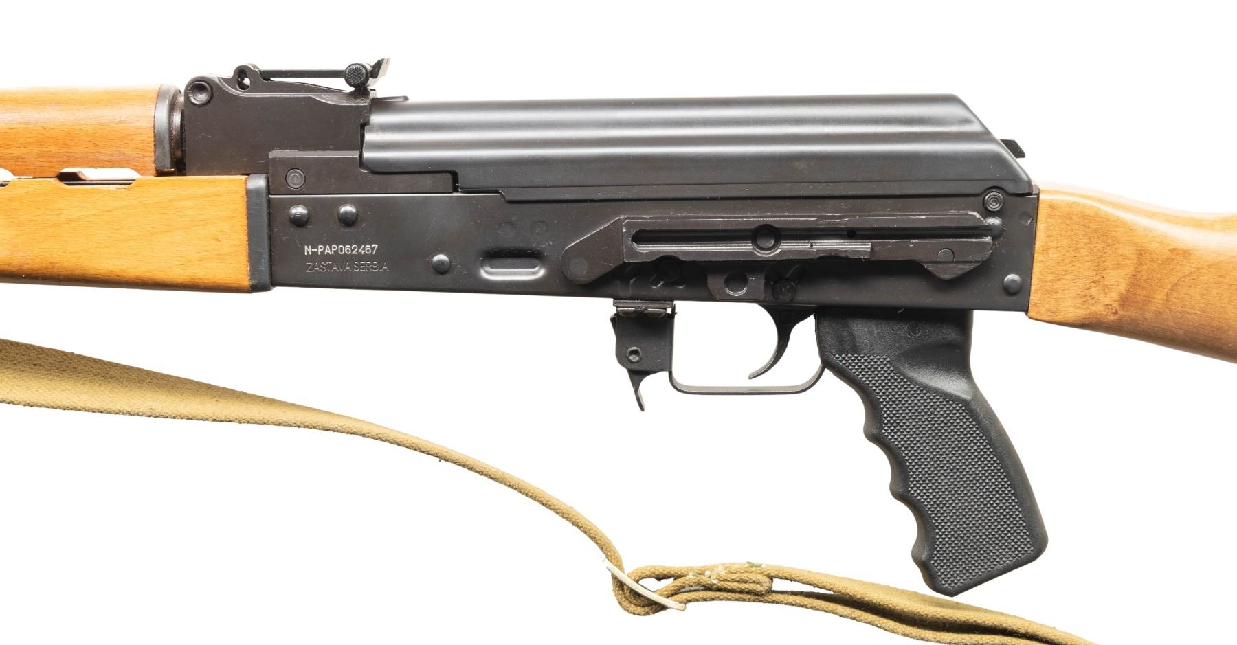1) Zastava, model N-PAP M70 Carbine. Cal. 7.62X39. S# N-PAP062467. Bbl. 16". Barrel terminated w/ slant muzzle brake. Matte black finish on all exposed surfaces. Protected post front sight. Onboard cleaning rod below gas block. No bayonet lug. Blond forend w/ matching, full length shoulder stock. Elevation adjustable rear sight. Right side safety / selector. Black plastic pistol grip. Scope mount integral to left side of receiver. Green canvas sling. CONDITION: All aspects indicate very little prior use, if any. Bright bore w/ strong rifling. Fire control mechanism appears to function correctly when cycled by hand. (25-4637/JZ). MODERN.
