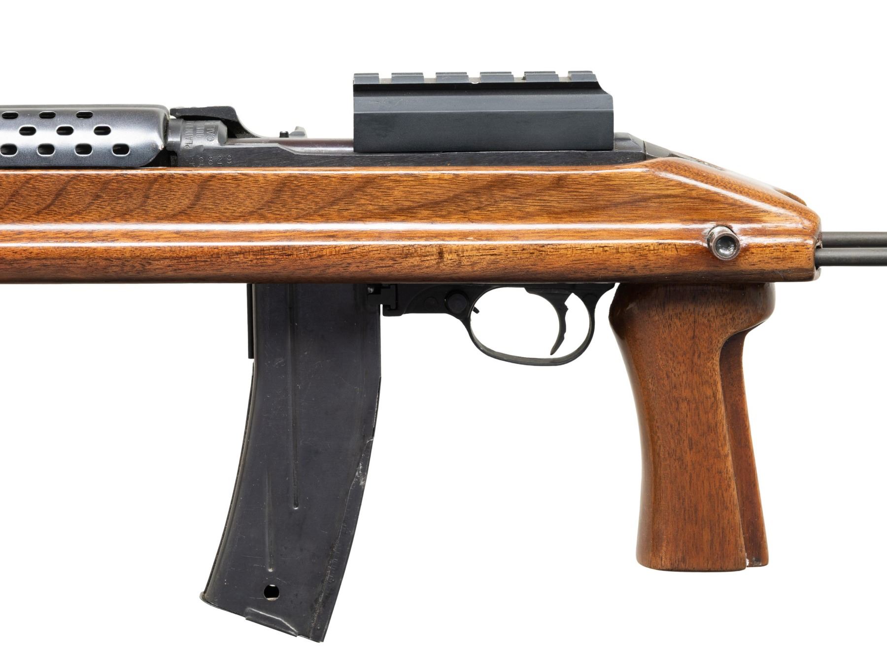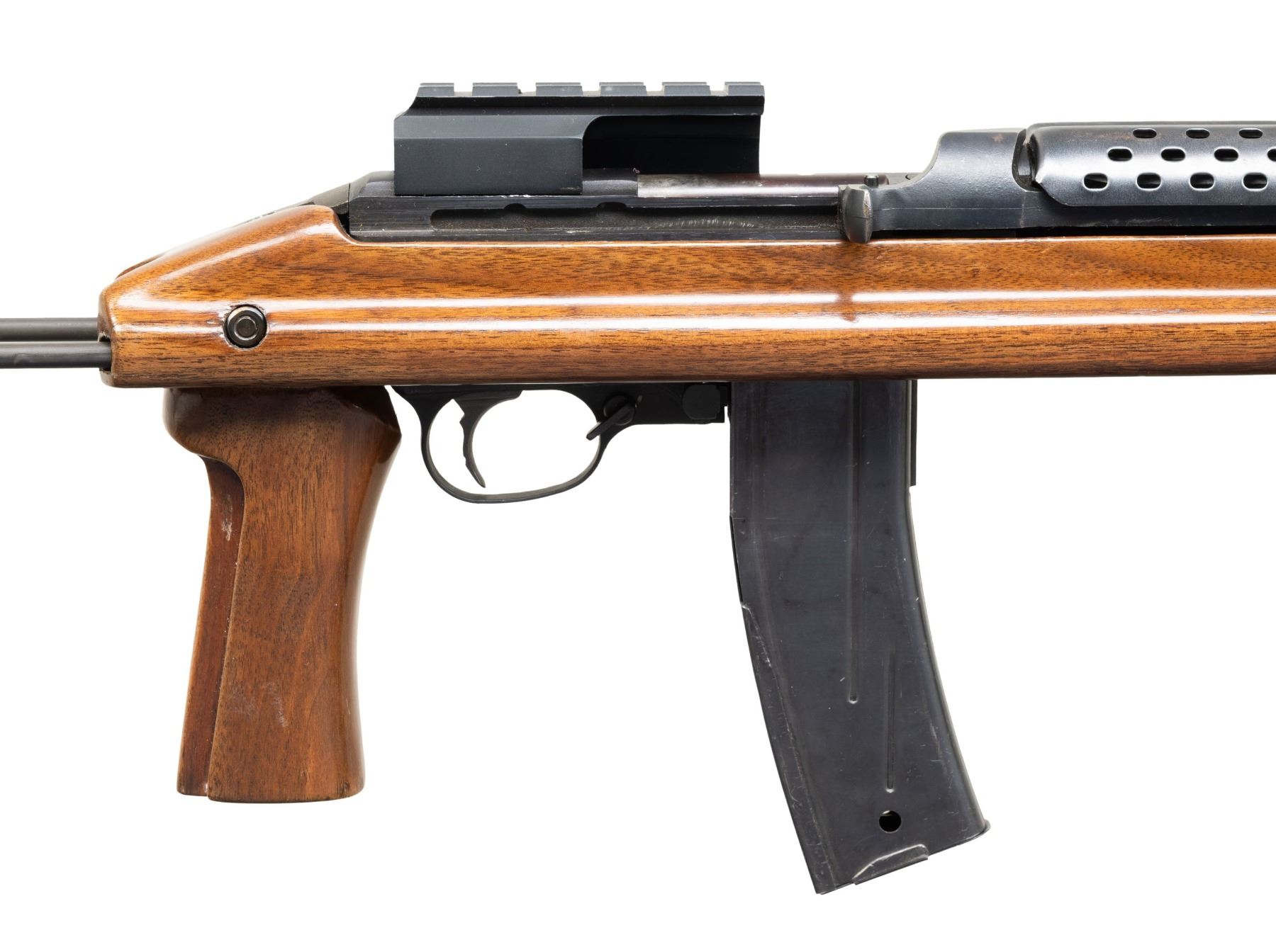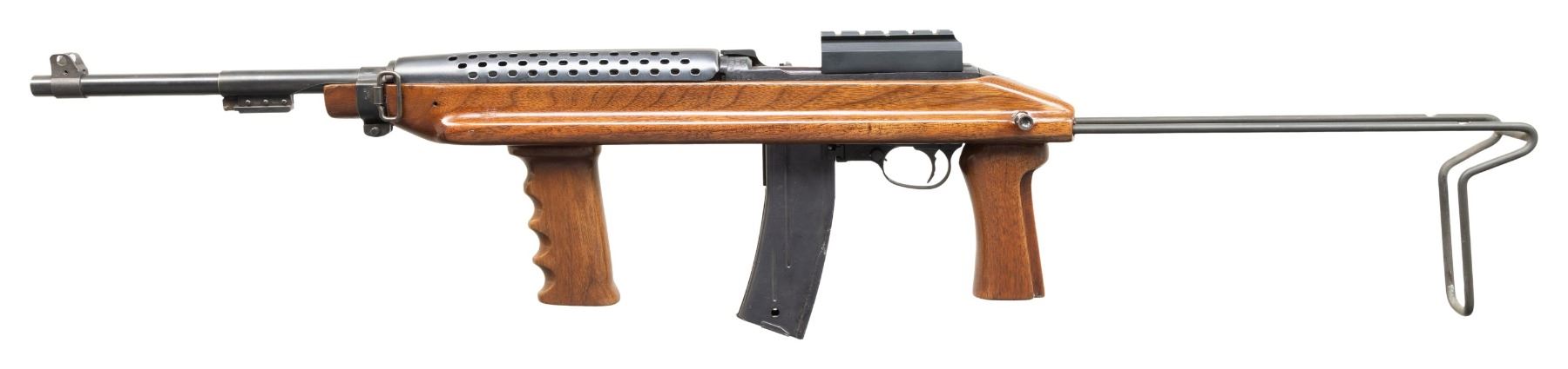 AUTO CARBINE. Cal. 30 Carbine. S# 42829. Bbl. 18". These carbines were manufactured by Plainfield from 1962 to 1978 using both GI & newly manufactured parts. This carbine features vertical hand grips as well as a sliding wire stock, making a very compact & handy design. Original rear sight has been removed & carbine has been fitted w/ a picatinny rail mount over the bridge area. Blade front sight w/ protective ears. Bbl. band carries bayonet lug. Ventilated metal handguard. Walnut stock & hand grips. Sliding wire buttstock locks in both collapsed & extended positions. Stock has panels on right and left added at time of manufacture to form recesses for the sliding buttstock. Alloy trigger housing. MAGS: 1 detachable 30 rd. marked "AYP". CONDITION: stock & hand grips have light wear & scattered handling marks over factory gloss finish. Metal retains 90% original blue finish w/ light wear. Very good shiny bore. (25-5152/RW). MODERN. $300-500.