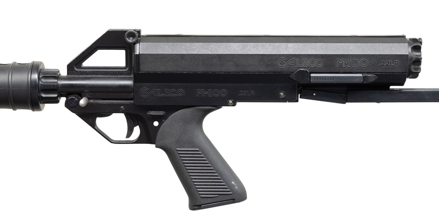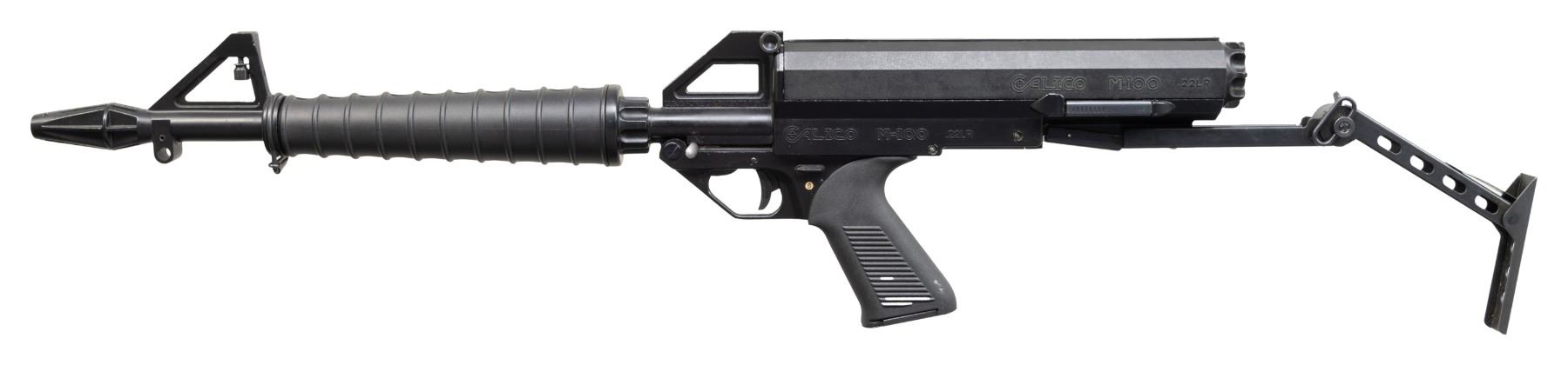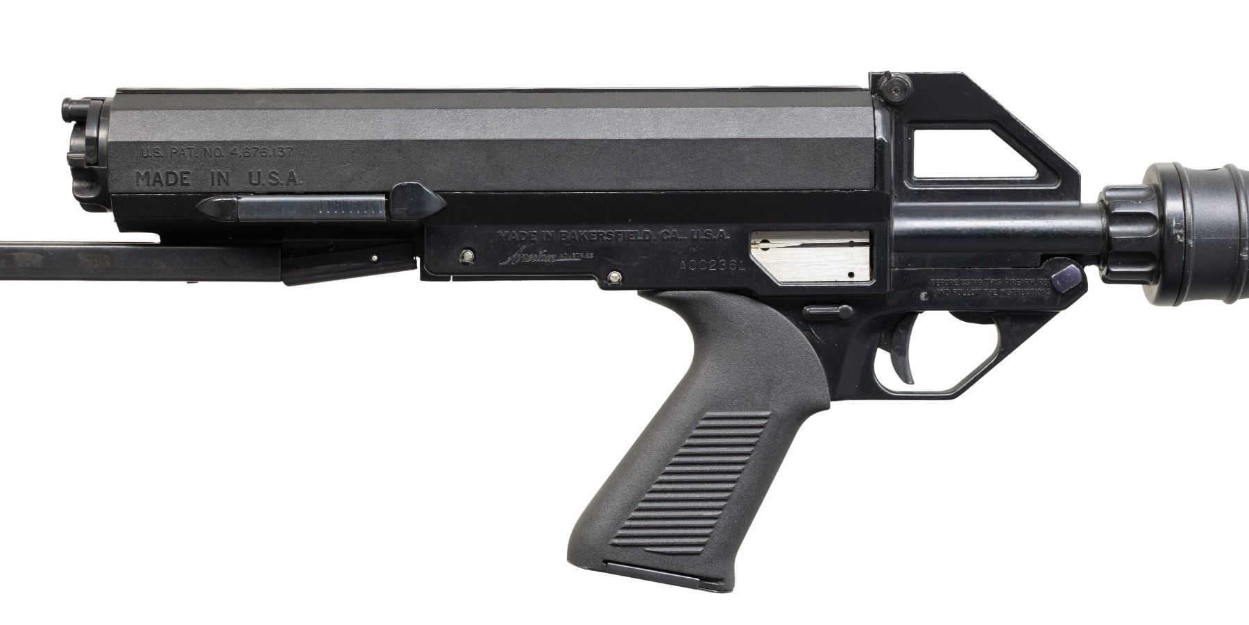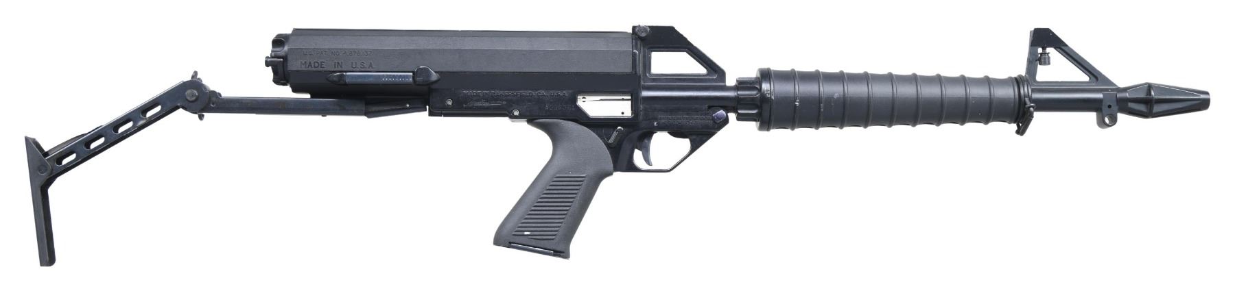 SEMI AUTO RIFLE WITH MATCHING FACTORY BOX. Cal. 22 LR. S# A002361. Mfg. 1986-1994 in Bakersfield, CA. Chrome-Moly 16.1" bbl. w/ protective shroud that includes muzzle brake, protected post front sight & notch rear sight. Matte black finish. Blowback action w/ ambidextrous safety. Black composite ribbed handguard & grooved pistol grip. Telescopic folding stock. MAGS: 1 helical 100 rd. Mag; spring is broken & has numerous marks. UNATTACHED ACCESSORIES: matching factory box w/ shipping sleeve. CONDITION: rifle has very good original matte black metal finish showing scattered light handling wear. Very good bore. Appears to function correctly when cycled by hand. (25-5154/MD). MODERN. $300-400.
