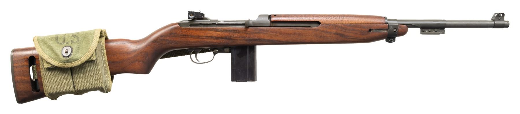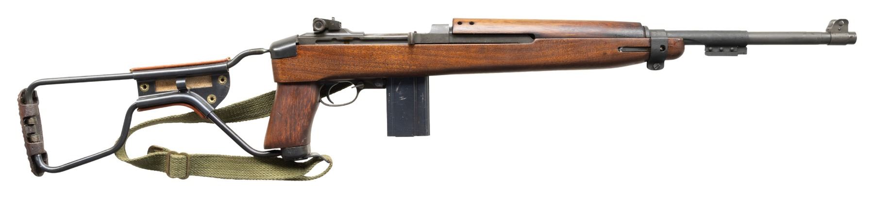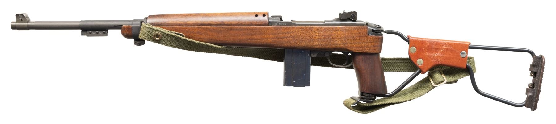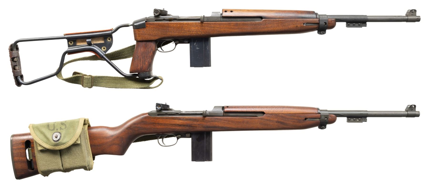 ONE FOLDING PARATROOPER. No.1: M1 Carbine Paratrooper. Cal. 30 Carbine. S# M888R203267. Bbl. 18". These carbines were manufactured by Israel Arms International in Houston Texas in the late 1990s and early 2000s and were made with a mix of newly manufactured and original GI parts. The receivers are marked "HOU IX / USA / IAI". The barrels, sourced from Douglas, are unmarked. Milled adjustable aperture rear sight. Blade front sight with protective ears. Barrel band with bayonet lug. Carbine is equipped with a modern made folding stock to replicate the M1A1 Paratroop rifles of WWII. Rifle equipped with newly manufactured walnut stock, pistol grip and handguard. Green web sling. MAGS: one 15 round GI detachable. CONDITION: entire carbine including stock set and metalwork are in very good to near excellent condition with small handling marks. Very good shiny bore. (25-4736/RW). / No.2: M1 Carbine Standard. Cal. 30 Carbine. S# M888R203073. Bbl. 18". This carbine also manufactured by Israel Arms International, has the standard features of a standard M1 Carbine. The receiver carries IAI markings. Adjustable aperture rear sight. Blade front sight with protective ears. Sight blade has been ground to reduce height. Barrel band with bayonet lug. Newly manufactured walnut stock and handguard. Stock is unmarked. Carbine is equipped with vintage green web sling and 1943 dated two pocket slip-on magazine pouch. MAGS: three 15 round GI detachables. CONDITION: all aspects of wood and metal are very good to near excellent. Very good shiny bore. Hold-open pin does not engage correctly. (25-4737/RW). BOTH MODERN. $900-1,200.