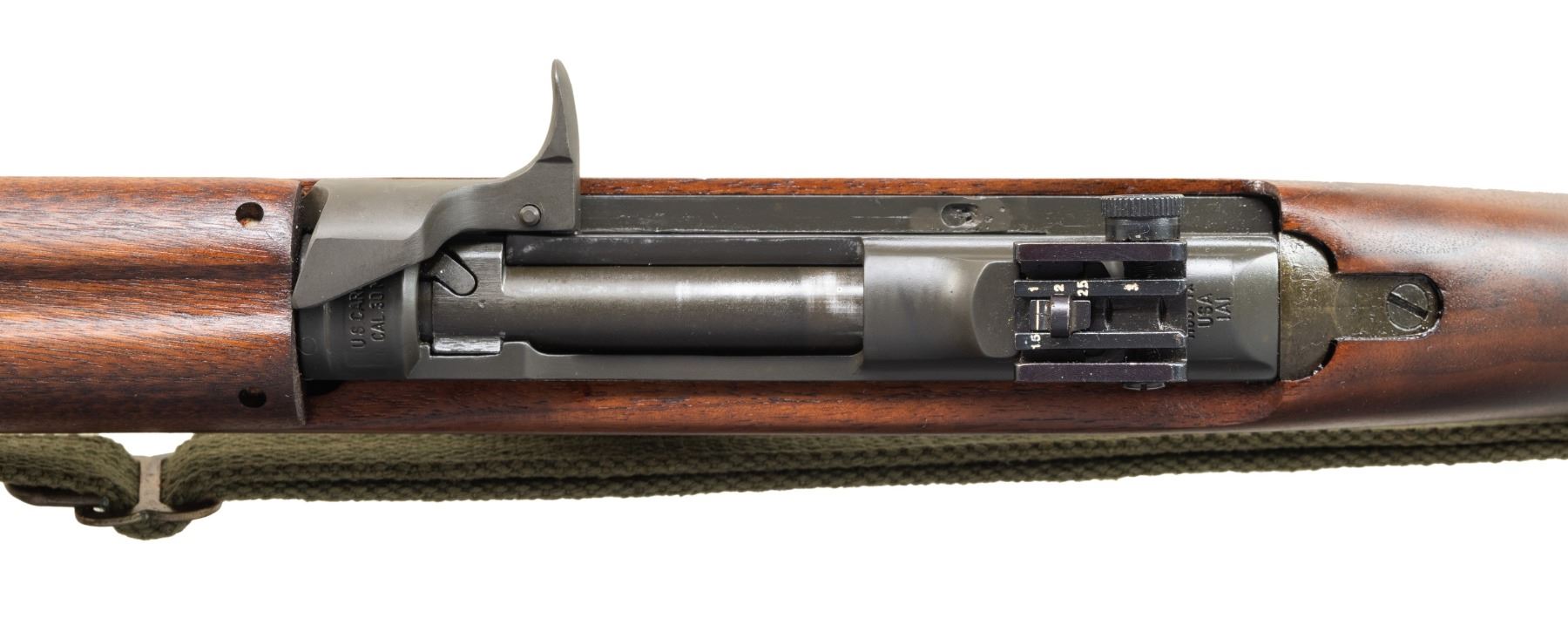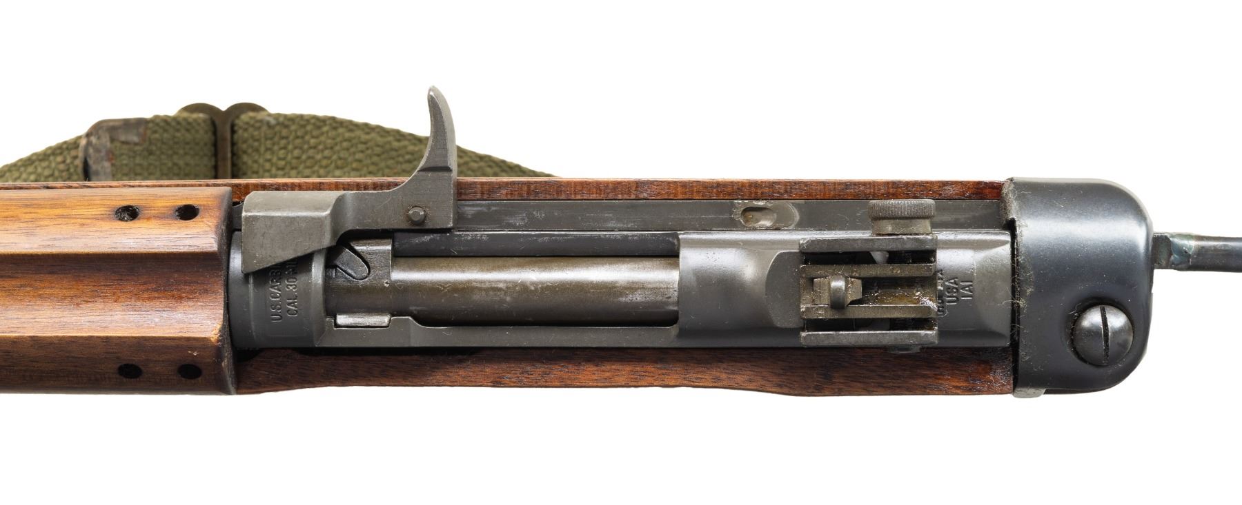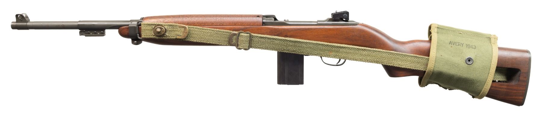 ONE FOLDING PARATROOPER. No.1: M1 Carbine Paratrooper. Cal. 30 Carbine. S# M888R203267. Bbl. 18". These carbines were manufactured by Israel Arms International in Houston Texas in the late 1990s and early 2000s and were made with a mix of newly manufactured and original GI parts. The receivers are marked "HOU IX / USA / IAI". The barrels, sourced from Douglas, are unmarked. Milled adjustable aperture rear sight. Blade front sight with protective ears. Barrel band with bayonet lug. Carbine is equipped with a modern made folding stock to replicate the M1A1 Paratroop rifles of WWII. Rifle equipped with newly manufactured walnut stock, pistol grip and handguard. Green web sling. MAGS: one 15 round GI detachable. CONDITION: entire carbine including stock set and metalwork are in very good to near excellent condition with small handling marks. Very good shiny bore. (25-4736/RW). / No.2: M1 Carbine Standard. Cal. 30 Carbine. S# M888R203073. Bbl. 18". This carbine also manufactured by Israel Arms International, has the standard features of a standard M1 Carbine. The receiver carries IAI markings. Adjustable aperture rear sight. Blade front sight with protective ears. Sight blade has been ground to reduce height. Barrel band with bayonet lug. Newly manufactured walnut stock and handguard. Stock is unmarked. Carbine is equipped with vintage green web sling and 1943 dated two pocket slip-on magazine pouch. MAGS: three 15 round GI detachables. CONDITION: all aspects of wood and metal are very good to near excellent. Very good shiny bore. Hold-open pin does not engage correctly. (25-4737/RW). BOTH MODERN. $900-1,200.