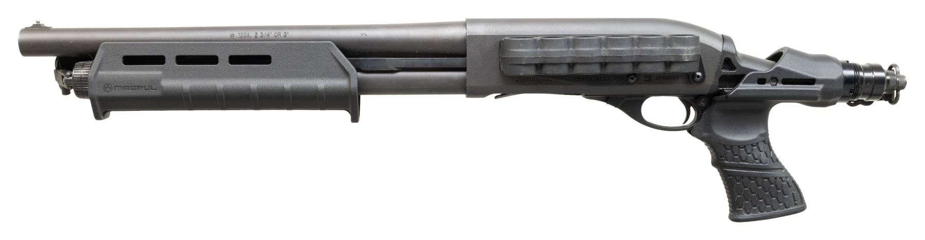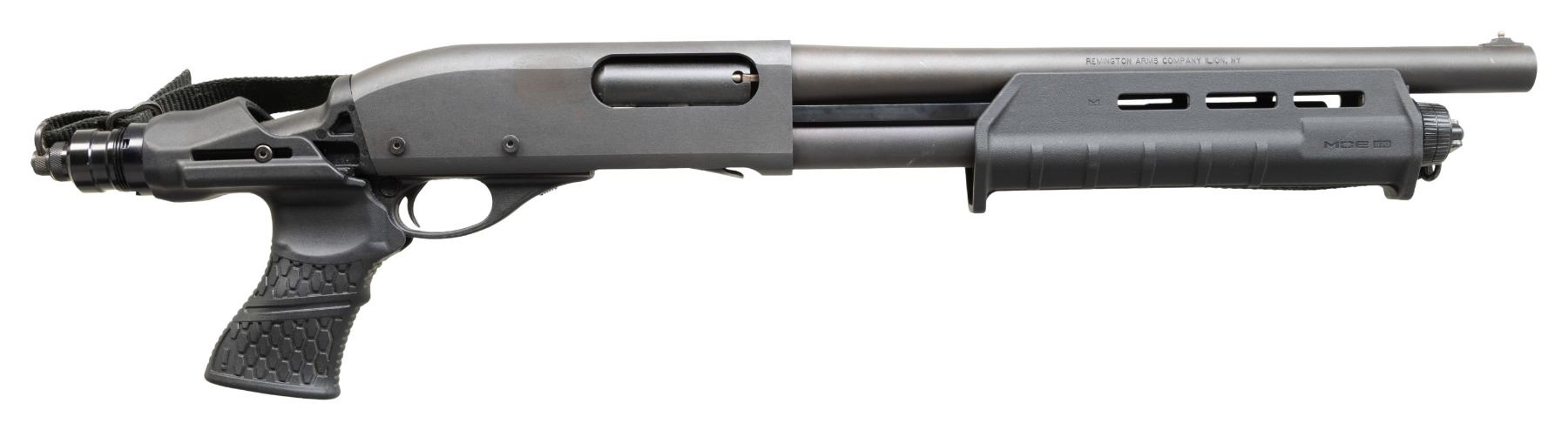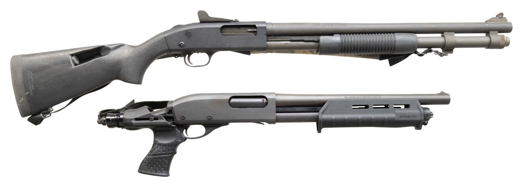 2) VERY NICE 12 GAUGE REMINGTOM MODEL 870 FIREARM. S# RF14069A. Bbl. 14". A 12 Ga. Firearm w/ an overall length of 27", built on a Remington Model 870 dual action bar, pump receiver. Remington recoil absorbing pistol grip. Matte black finish. 6 shot side saddle mounted on left side of receiver. Sling swivels, front & rear, currently wearing black nylon sling. Black plastic furniture. Silver colored front bead. CONDITION: All aspects indicate very little use. Finish coverage complete & consistent. Fire control mechanism appears to function correctly when cycled by hand. (25-4709/JZ). BOTH MODERN. $700-1,100 for lot.