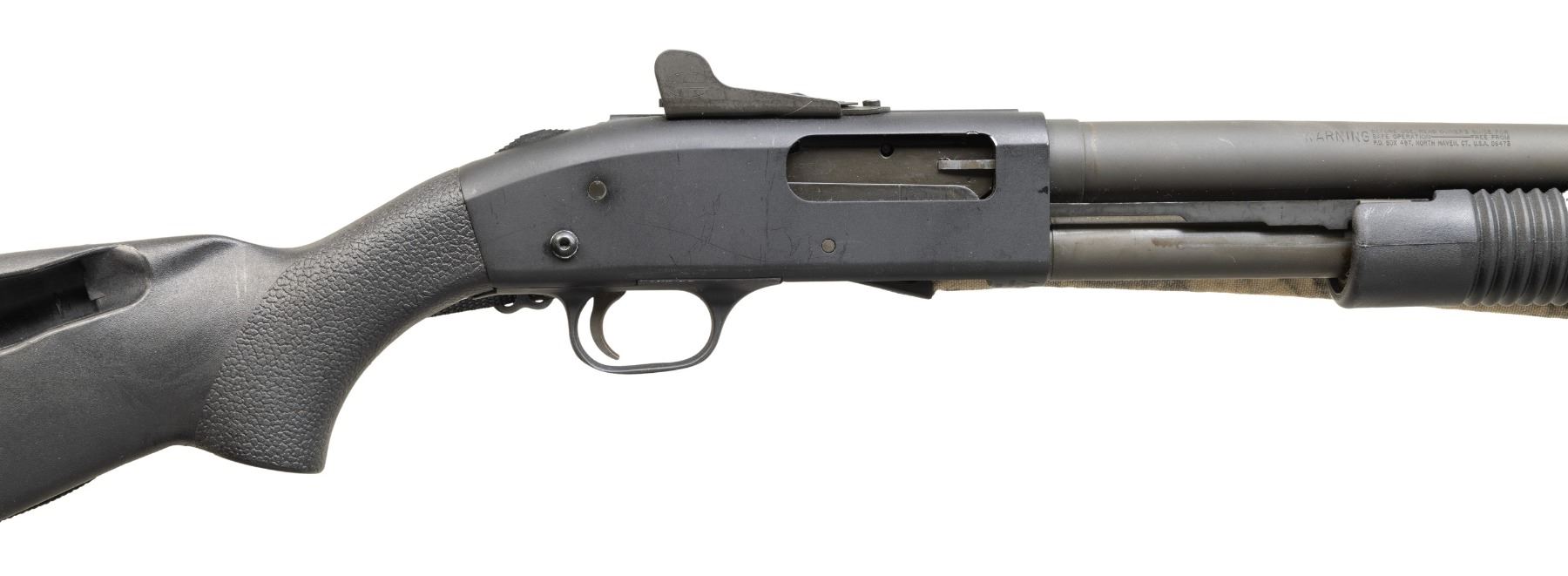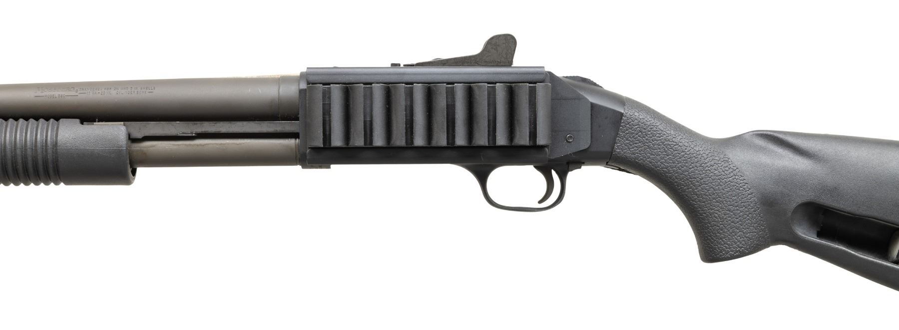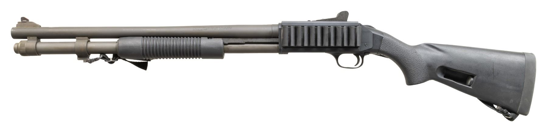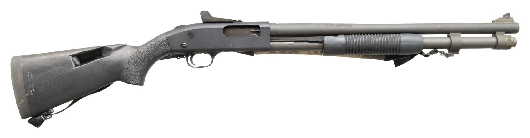 1) . MOSSBERG 590 PUMP ACTION SHOTGUN. S# P627952.Bbl. 20". Ramped blade front sight with orange insert. Adjustable Mossberg ghost ring rear sight. Parkerized finish. 6-shot side saddle on left side of receiver. Davis Speedfeed stock & grooved forend. Bottom mounted sling swivels with camo sling. CONDITION: stock set shows scattered handling marks & some scuffs. Metal retains 92% original parkerized finish with scattered light scratches, handling, edge & operational wear. Action functions properly when hand cycled. Very good bore. (25-4625/MJC).
