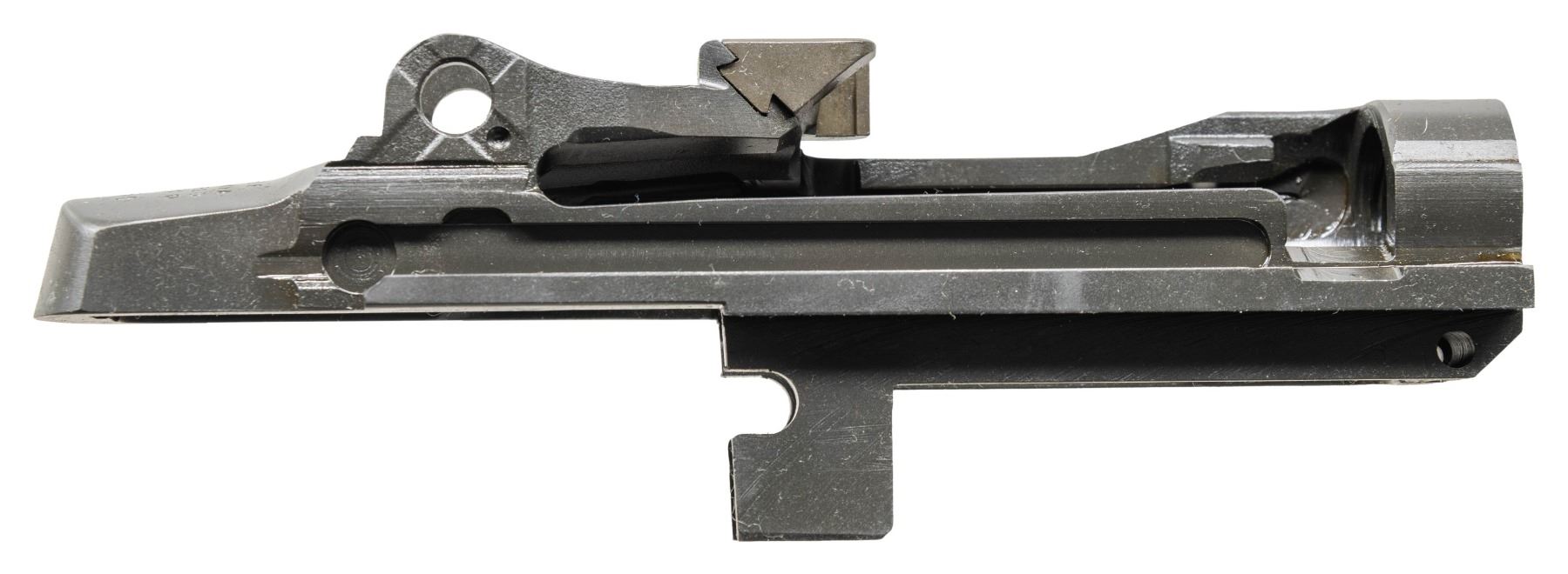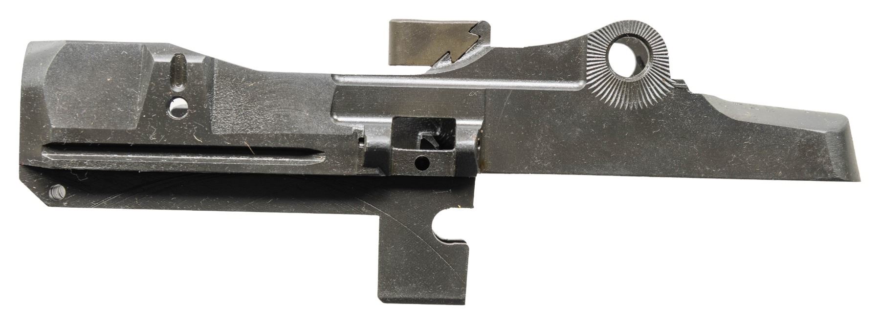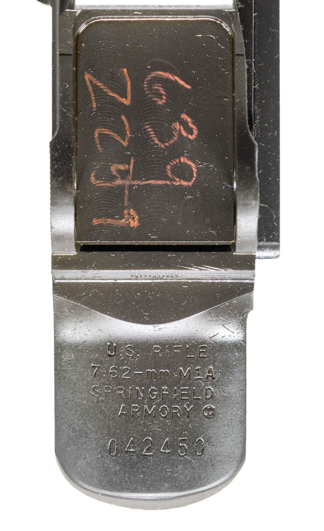 S# 042450. Receiver manufactured in the late 1980s is marked at heel "U.S. RIFLE / 7.62-mm M1A / SPRINGFIELD / ARMORY / serial number". Receiver has inventory number in red at rear sight base. Clip guide is fitted, no other parts are present. CONDITION: unfitted receiver appears near new. (25-2940/RW). MODERN. $300-500.