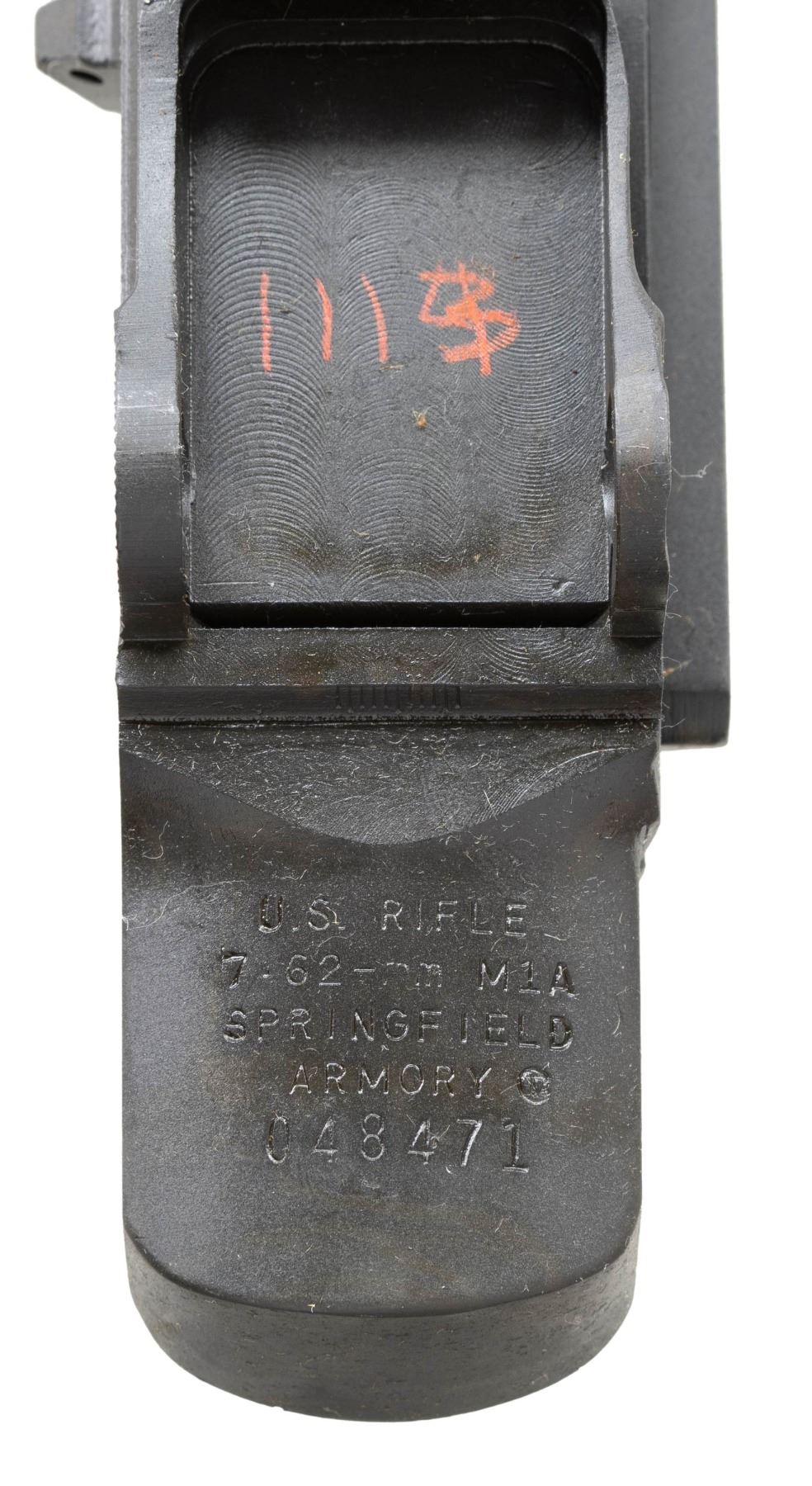 S# 048471. Receiver manufactured in the late 1980s is marked at heel "U.S. RIFLE / 7.62-mm M1A / SPRINGFIELD / ARMORY / serial number". Receiver has inventory number in red at rear sight base. Bare receiver, no additional parts are present. CONDITION: unfitted receiver appears near new. (25-2941/RW). MODERN. $300-500.