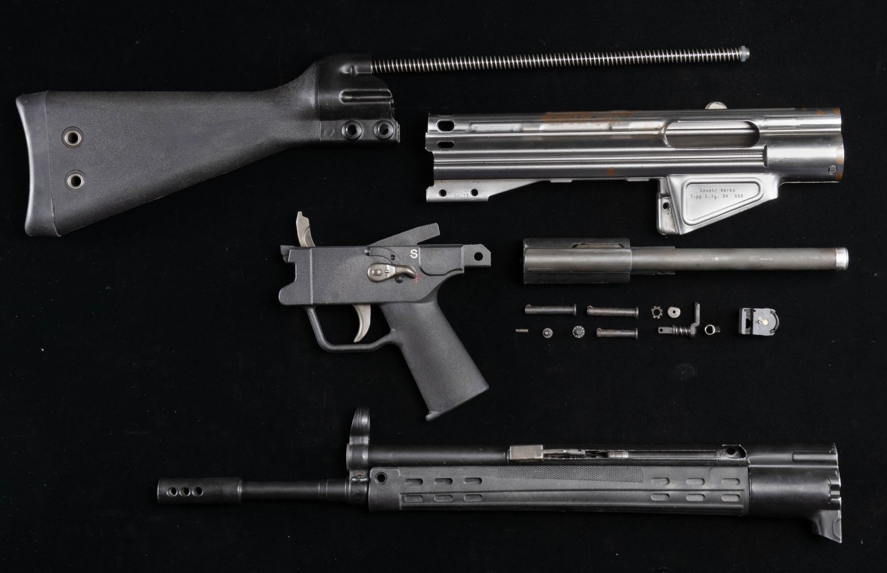 Gew. 91 receiver mfg. by Gewehr Works of Tipp City, OH. Left side of the receiver is marked "Gew. 91", followed by the S#, above the cal. designation, with Gewehr Works' mfg. information marked on the right. Receiver is folded, but unwelded and not finished. Saw cut forward section of receiver (bbl. assembly) and buttstock socket exhibit a black enamel finish. Bolt carrier exhibits a phosphate finish. Forward saw cut section of receiver consists of the bbl., brake, front sight assembly, charging handle assembly, and a black synthetic forearm. Aftermarket black synthetic buttstock and buttplate. Black synthetic trigger pack housing is marked "S" and "F". 2-piece blue anodized aftermarket trigger pack. Receiver is complete with a drum rear sight assembly, 3 furniture push pins, and several assorted small parts. CONDITION: receiver is very good, as unfinished, exhibiting scattered spots and patches of discoloration from previously cleaned oxidation and some superficial handling marks. Black enamel finished parts retain the majority of their finish, showing some superficial handling marks overall. Bore is relatively bright, exhibiting a consistent scattering of mild to moderate pitting, while retaining strong rifling throughout. (25-6716/MLW). MODERN. $600-800.