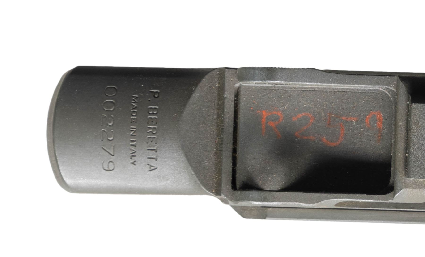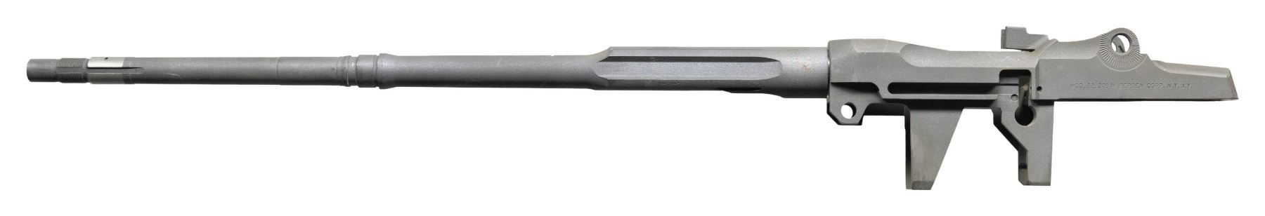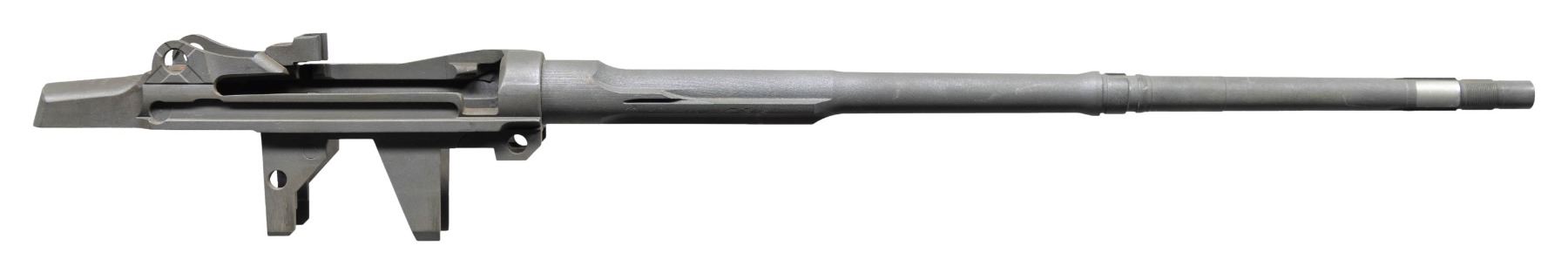 Cal. 308 WIn. S# 002279. Bbl. 17 1/2". Stripped receiver & bbl. for Beretta BM-62 rifle. No other parts present. Receiver heel marked "P.BERETTA" made in Italy. Rear sight groove has "R259" in orange paint. Left side of receiver has Berben Co. NY, NY import marking. Parkerized finish. CONDITION: metal shows some light edge & operational wear with a couple small spots of light oxidation. Very good bore with strong rifling. (25-3154/MJC). MODERN. $100-200.
