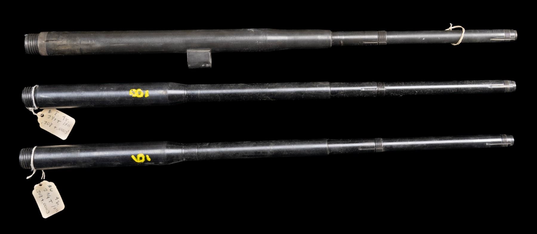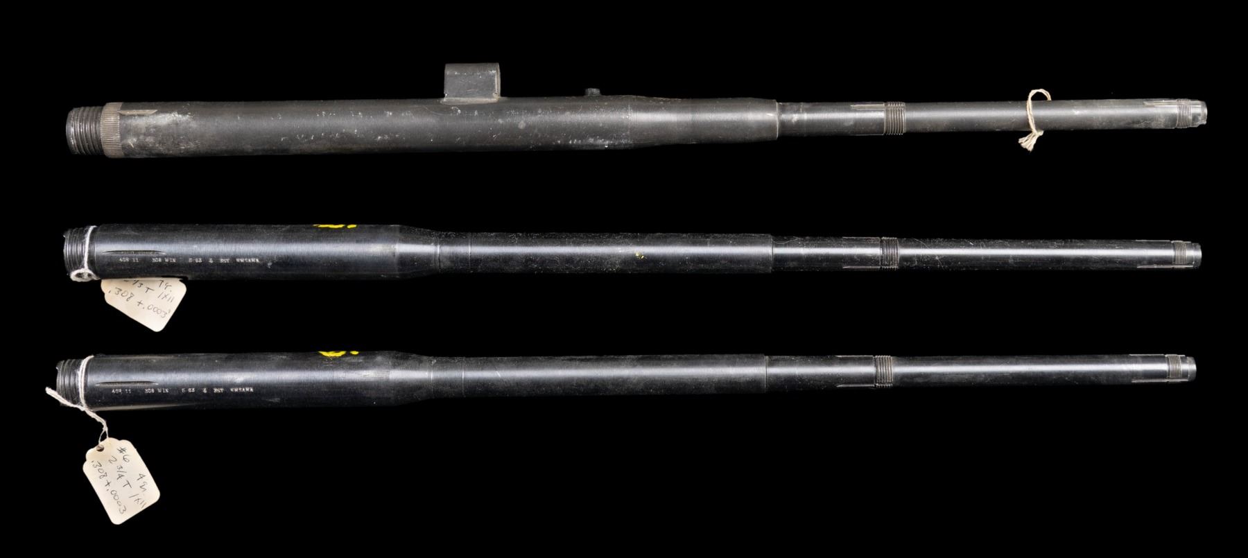 This lot consists of the following 22" M14/M1A barrels: 1) Heavy profile bbl. marked only 1-12" for twist. Guide for op rod present. CONDITION: underside shows a large patch of moderate pitting, a couple other spots of pitting, scattered finish wear, fading & oxidation. Bore has some rifling wear but is shiny. 2) Noah's Motor's made bbl. dated 5-93 & marked "4GR 11". 1x11 twist. CONDITION: finish shows scattered wear & light oxidation. Bright near excellent bore. 3) Noah's Motor's made bbl. dated 6-93 & marked "4GR 11". 1x11 twist. CONDITION: finish shows scattered wear & light oxidation. Bright near excellent bore. (02-24590-56/MJC). NON-GUN. $200-400.