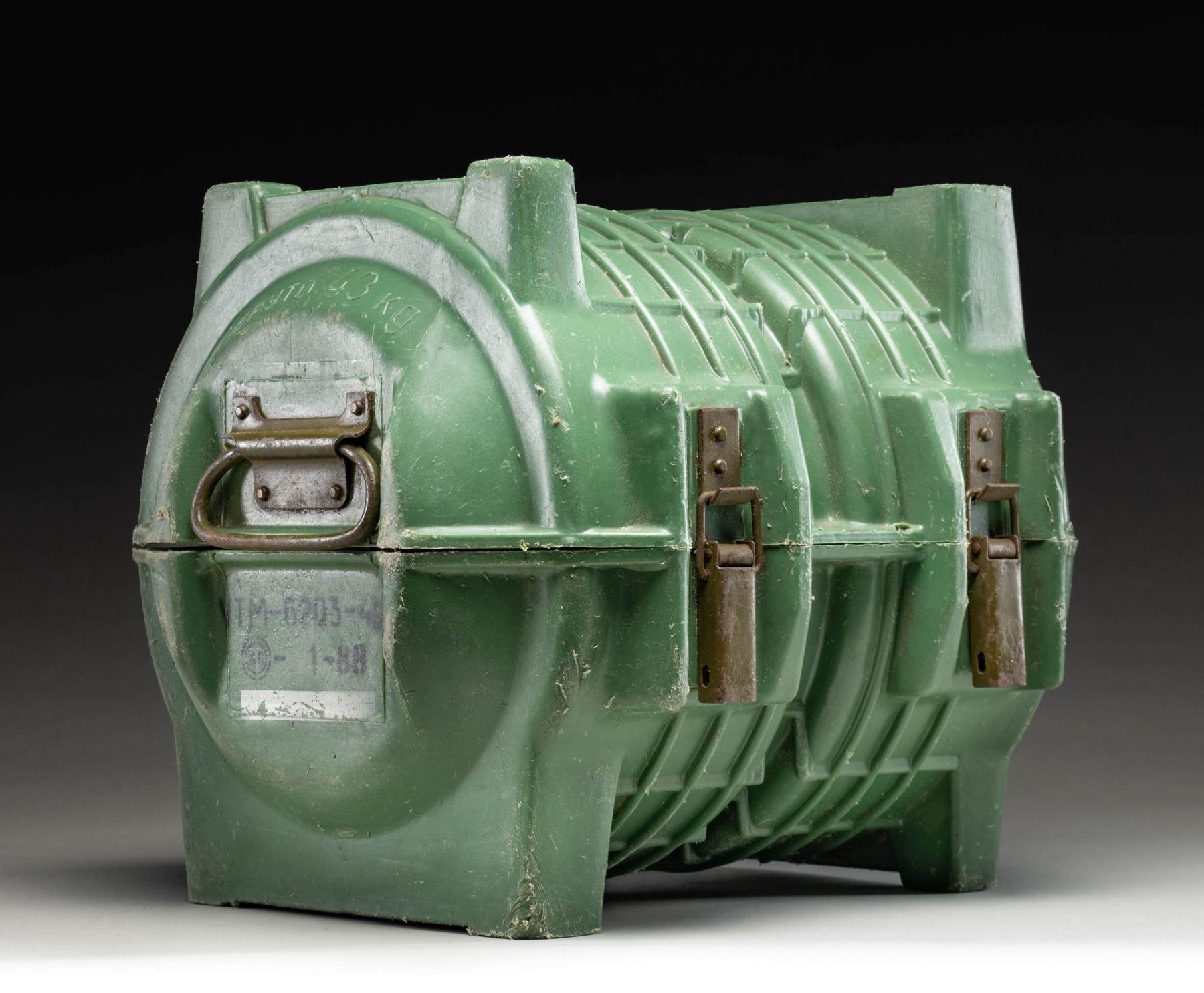 This lot consists of two inert Soviet TM-62 anti tank practice mines with a 1-88 dated green plastic case. CONDITION: mines show scattered oxidation, paint & age wear. Plastic case shows scattered scuffing & age wear. (02-26093/MJC). $200-300.