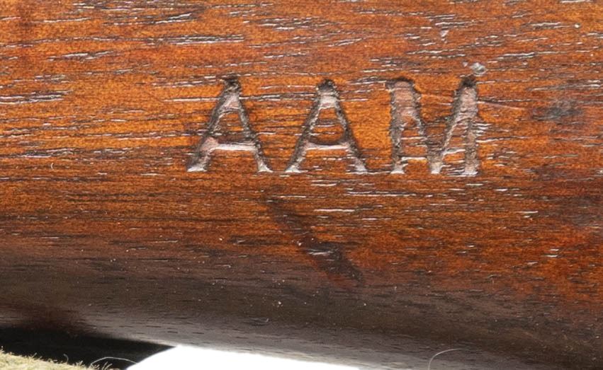 Cal. 30 Carbine. S# 5071494. Bbl. 18". Barrel markings behind front sight are very faint, but appear as "INLAND MFG. DIV. / GENERAL MOTORS / 3-44". Milled adjustable rear sight. Marked only with faint "crossed cannons". Blade front sight with protective ears. Barrel band with bayonet lug marked "C". Straight cut slide marked "N". Round bolt marked ".U.". Milled trigger guard marked "INLAND". Rotary safety. Straight cut hammer marked "LT-Q". Low wood oval cut walnut stock marked "HI" in sling slot. "Crossed cannons" on right side of butt. "P" proof under grip. Marked on left side with "AAM" indicating overhaul at Augusta Arsenal. Four rivet handguard marked "LJ". Green web sling. CONDITION: stock set with its arsenal rework finish has moderate wear and handling marks throughout. Metal retains 80% of its arsenal rework parkerized finish with light wear. Receiver has been drilled and tapped on left side for scope mount. Very good shiny bore. PROVENANCE: Estate Collection of John "Jack" Dhooghe. (25-5550/RW). CURIO. $500-800.