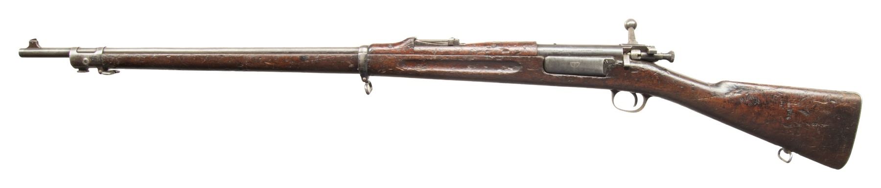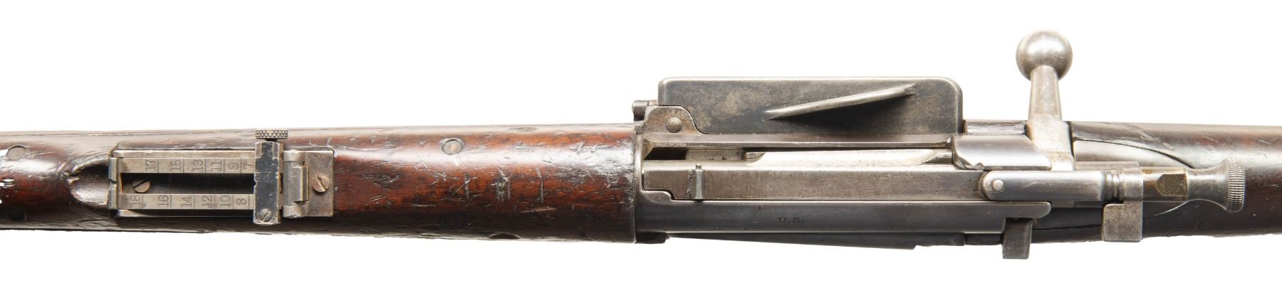 Cal. 30-40 Krag. S# 143253. Bbl. 30". Rifle has an unusual electro-penciled mark on the sideplate. Replacement rear sight with carbine sight protector handguard. Blade front sight. Walnut stock set. Buttstock has faint boxed "JSA 1900". Encircled script "P" proof under grip. Buttstock marked on both sides with "S". Trap buttplate. Left side of buttstock has "bored soldier" marking, "MURE/MLU". CONDITION: stock set has extensive wear, dents and scratches with large partially repaired crack in buttstock, extending to both sides. Worn metal turning gray with traces of original blue. Dark worn pitted bore. PROVENANCE: From the PMRB Collection. (25-5972/RW). CURIO. $400-600.
