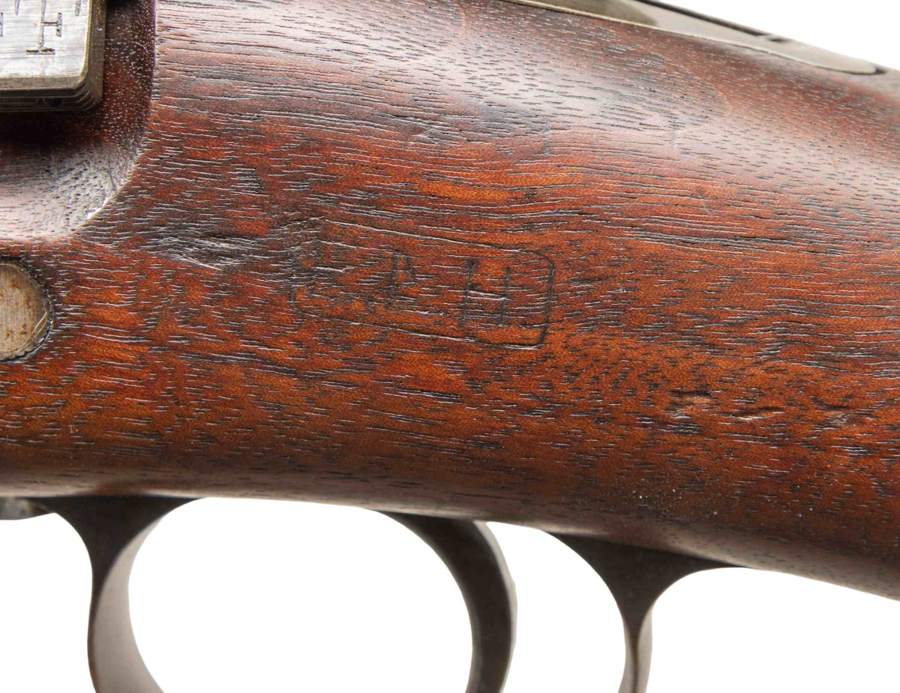 ACTION MILITARY RIFLE. Cal. 30-06. S# 350379. Bbl. 24". Barrel marked behind front sight "SA / flaming bomb / 6-08". Rifle manufactured in 1908. Ladder rear sight graduated to 2,850 yards with volley notch. Grooved and dished windage and elevation knobs. Blade front sight. Straight down bolt handle. Bolt is marked at bottom of handle "BS". All milled furniture including smooth trap buttplate. Receiver without Hatcher hole. Walnut stock set. "S" type straight grip stock with single recoil bolt. Stock is marked on left side with boxed "EAH" acceptance mark and marked under grip with faint encircled "P" proof. Stock is additionally marked with "X" and "H" in cutoff recess. Stock tip is marked "S". Handguard appears to be a replacement. UNATTACHED ACCESSORIES: nickel-plated oiler in butt. CONDITION: buttstock has been lightly cleaned, resulting in a slight softening of edges. Butt has a good appearance with light wear and scattered handling marks. Handguard in very good condition with light wear. Metal has turned mostly gray with patina and spots of peppery oxidation. Small amount of original blue in protected areas. Middle band has an arsenal rework blue. Bore is shiny with lightly worn lands and a slightly frosted appearance in grooves. (25-6292/RW). CURIO. $600-900.
