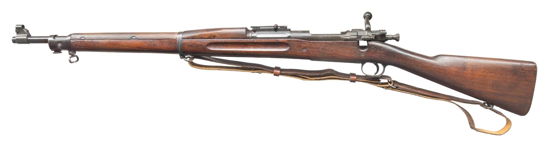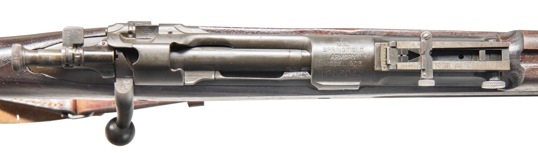 RIFLE. Cal. 30-06. S# 1213041. Bbl. 24". Barrel marked behind front sight "SA / flaming bomb / 1-21". Receiver is also produced in 1921. Ladder rear sight without volley notch with flat windage and elevation knobs. Blade front sight. Front sight has unmarked sheet metal protector. Bolt with swept handle is marked "WL3" on top and punch proof underneath. Gas hole in extractor. Receiver without Hatcher hole. All milled furniture including smooth trap buttplate. Walnut stock set. Buttstock marked on left side with boxed "DAL" acceptance mark. Marked in cutoff recess with "O". Encircled "P" proof under grip. Handguard is likely a replacement and shows an area of hand fitting around the lower band, but is not "duffel cut". Brown leather military style sling. CONDITION: buttstock has lightly worn original finish with scattered handling marks. Handguard, except as noted, has period finish with light wear. Metal parts retain 80% of their original finish with light wear. Metal parts in this era would typically contain a mix of blue and black parkerized finishes. Very good shiny bore with sharp lands. (25-6880/RW). CURIO. $600-900.