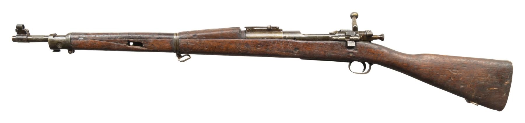 RIFLE. Cal. 30-06. S# 3206736. Import marked at bottom of barrel. Bbl. 24". Barrel marked behind front sight "RA / flaming bomb / 7-42". Ladder rear sight graduated to 2,850 yards. Blade front sight with protective sight cover. Bolt with swept handle is marked "R". All milled furniture including smooth trap buttplate. Stacking swivel is not present. Walnut stock set. "S" type straight grip buttstock with two reinforcing bolts. Stock marked only with very faint encircled "P" proof under grip. CONDITION: stock set has extensive wear, staining, dents and scratches. Notable crack extends from receiver tang to nose area. Forend has two transverse holes at midpoint and large missing chip on left side, gouge underneath right side and extensive cracks underneath both sides. Handguard has nearly full length crack on top. Metal turning gray and patina with extensive wear and handling marks. Lower band is distorted. Dark worn bore. (25-6271/RW). CURIO. $300-500.