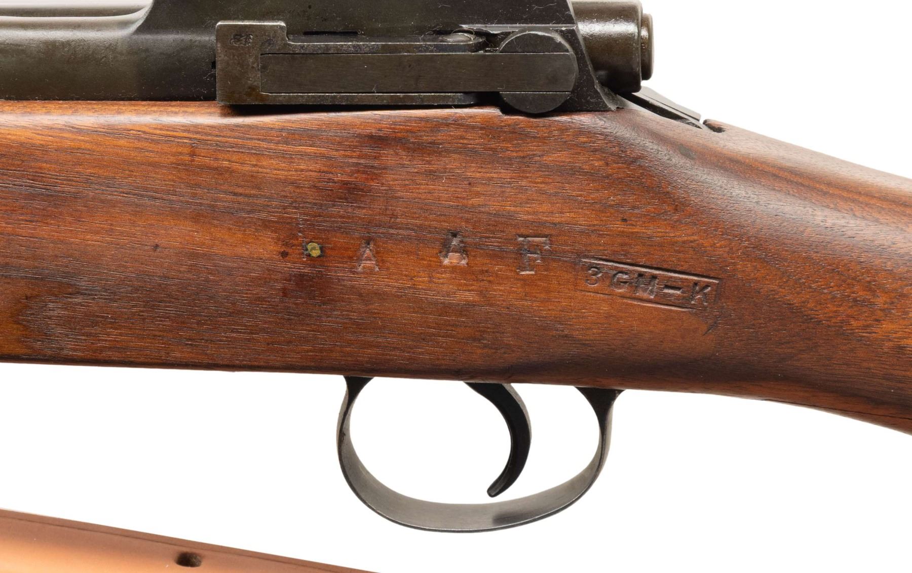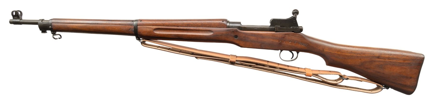 RIFLE. Cal. 30-06. S# 513061. Bbl. 26". Replacement barrel is marked "HS" indicating manufacture by High Standard. Barrel also marked with "flaming bomb" and "P" proof. Aperture rear sight graduated to 1,600 yards. Blade front sight with protective ears. Bolt handle is marked "R" underneath with flaming bomb on top. Cocking piece marked "W". Sight ladder and safety marked "E". Walnut stock set. Stock marked "E" at tip and has two arsenal rebuild marks on left side including ambiguous boxed "3GM-K". High quality tan leather military style sling marked with added "RIA 1941". CONDITION: stock set has lightly worn arsenal rework finish with small scattered handling marks. Buttstock has notable crack extending rearward from trigger guard tang to left mid point of butt. 2" crack on right side of trigger guard tang extending into grip area. Metal retains 90% of its black arsenal rework parkerization with very light wear. Good shiny bore with sharp lands and hint of frosting. (25-4715). CURIO. $400-600.