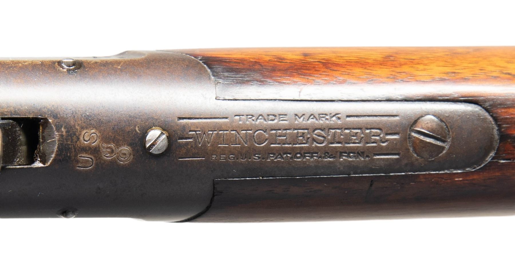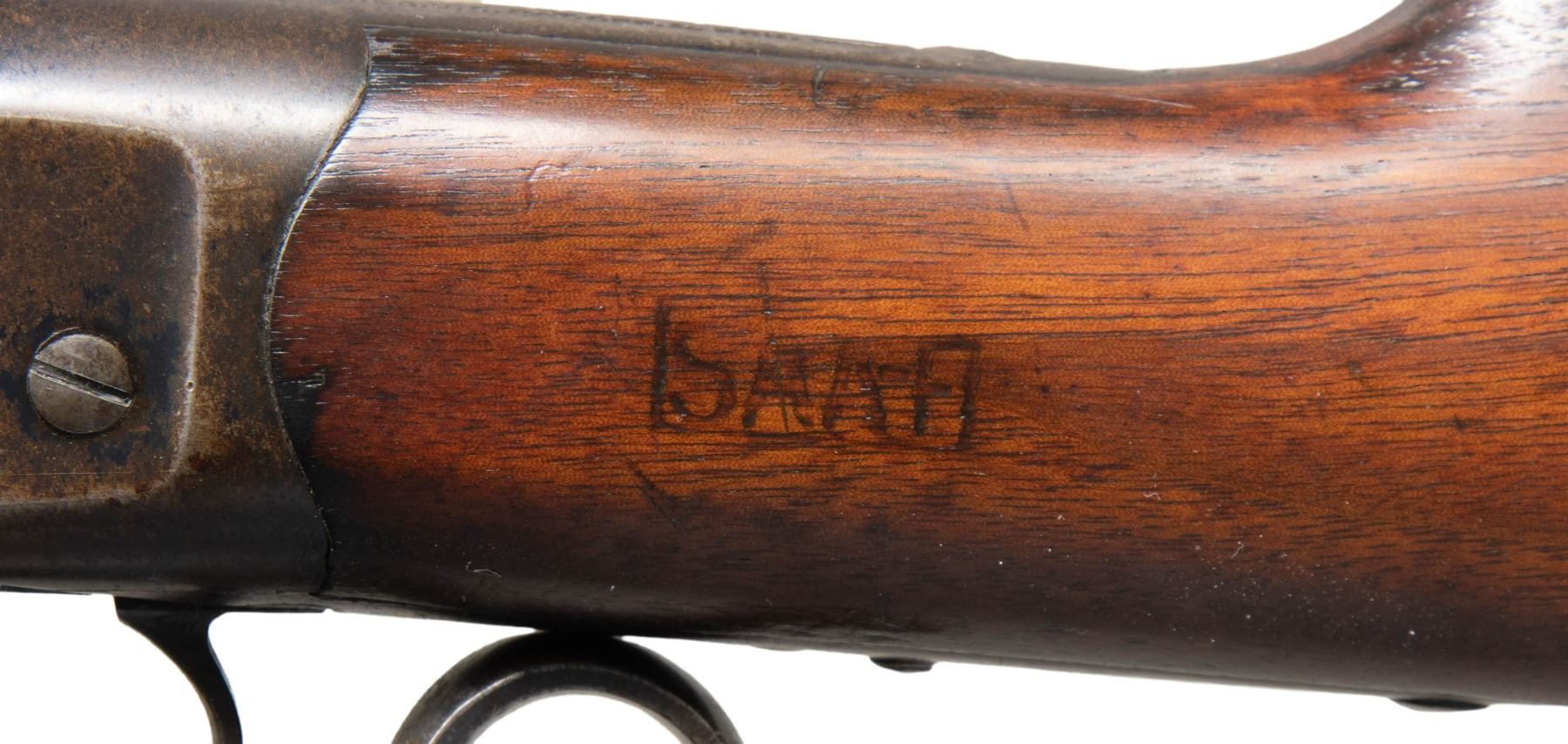 Cal. 22 Short. S# 128221. Mfg 1918. Bbl. 28" rd with dovetailed custom brass post front sight. Lyman 53 Winder musket receiver sight. Ordnance bomb located behind the hammer. Plain trigger. Boxed "SAAF" cartouche on the left wrist of the stock. Standard winder musket stock set and smooth steel buttplate. CONDITION: bbl finish has faded to approx 20% coverage with a mostly even greyish patina. Receiver finish remains in the protected areas with exposed metal surfaces showing a grey/brown patina. Stock set has been lightly refinished. Bright shiny bore with nice rifling. PROVENANCE: The Esteemed Norm Greenberg Collection. (25-4216/ZAL). CURIO. $600-900.
