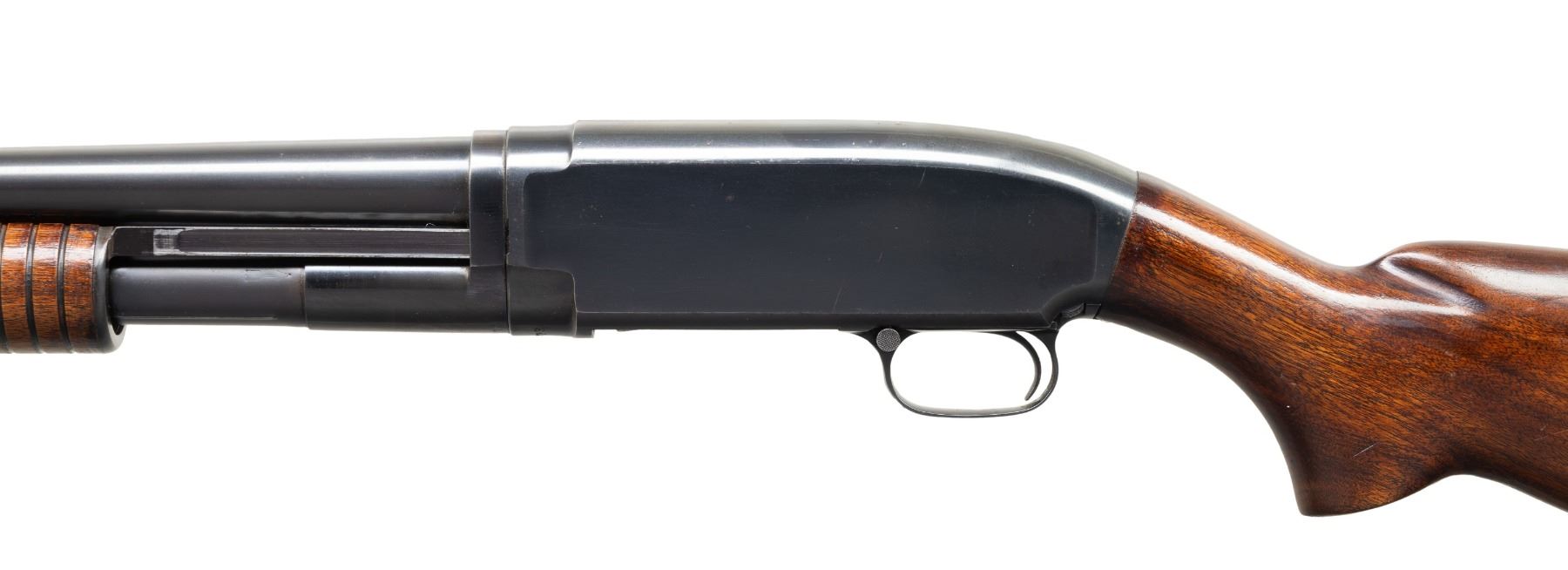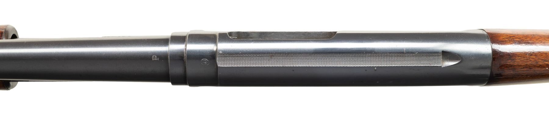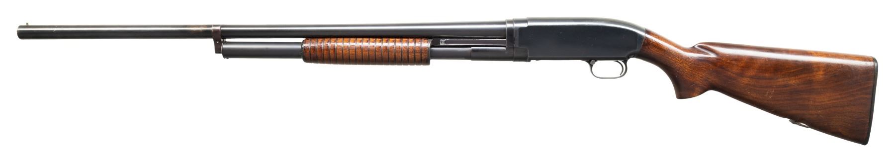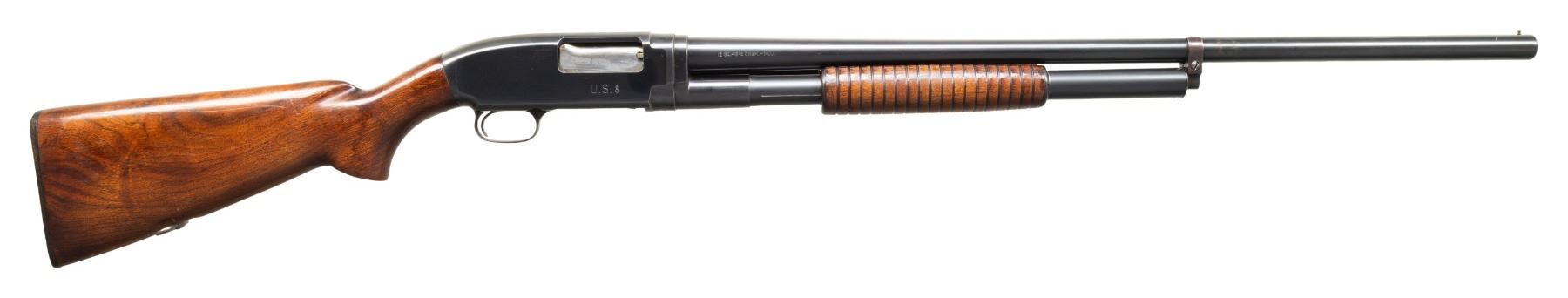 SHOTGUN. Cal. 12 GA, 2 3/4". S# 1013973. Bbl. 28". Model 12 pump action shotgun mfg. by Winchester in 1946 under contract for the U.S. military. Right side of the bbl. is marked with the cal. designation, followed by a "MOD." choke marking, with a "P" stamped over the top of the bbl. towards the breech. Right side of the receiver is marked "U.S." followed by a flaming ordnance bomb. Metal components exhibit a blue finish overall, save for on the bolt assembly and carrier, which are polished in-the-white. Right side of receiver exhibits a proper area of discoloration at lower right corner of ejection port, which is also present at and around the upper left corner of the ejection port. Grooved wood pump and plain pistol grip buttstock with Winchester checkered black synthetic buttplate have been lightly sanded and revarnished. Buttstock is marked with a mostly visible boxed "GHD" cartouche above an extremely faint crossed cannons ordnance escutcheon. Toeline of stock is inletted with a blued steel sling swivel. Brass bead front sight. Takedown action with non-takedown mag. tube pin/screw. Matching numbers are present on the receiver and receiver extension. CONDITION: metal components retain the majority of their original factory blue finish, exhibiting some light edge wear, scattered superficial handling marks, as well as some scattered spots of light surface oxidation and pitting. Bbl. exhibits an area of wear and thinning fading to gray patina forward of the mag. tube band, with 2 streaks of pitting present in the corresponding area. In-the-white parts exhibit scattered spots and patches of age related discoloration and light pitting. Proper manual mechanics. Wood furniture shows some scattered marks and impressions from handling and storage (predominately on the buttstock), but otherwise remains sturdy and serviceable. (25-5500/MLW). CURIO. $700-1,100.