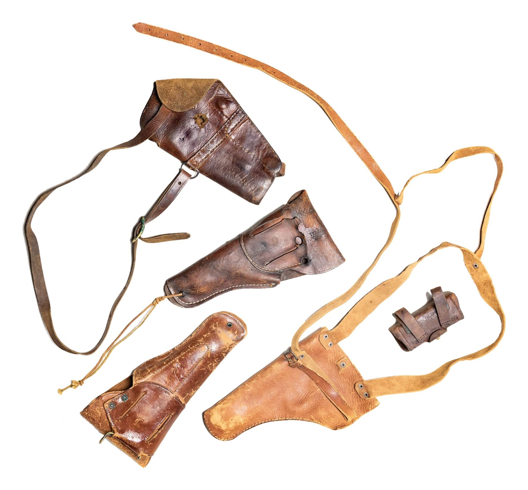 Lot of assorted U.S. M1911 holsters, including: 1) U.S. Model of 1916 M1911 holster mfg. by Clinton. Rear of belt loop is faintly marked "CLINTON" above an indiscernible year of mfg. and inspector initials "C.C.". Closure flap is embossed with "US" within an oval. Brown leather construction with brass rivets, drain/thong hole, stud, and hanger. CONDITION: leather remains malleable, exhibiting scattered marks from handling and storage, as well as varying degrees of age related cracking and crazing overall. 2) U.S. Model of 1916 M1911 holster produced by an unknown mfg. Closure flap is embossed "US" within an oval. No mfg. markings remaining. CONDITION: leather remains malleable, exhibiting moderate age related cracking and areas with varying degrees of crazing. Top of belt loop is torn, with hanger absent. Brass rivets have torn free. 3) U.S. M3 style shoulder holster. Front of body is stamped "U S". Brown leather construction with steel fittings. Rear of holster is marked "57775". CONDITION: leather remains malleable, exhibiting scattered areas of age related cracking and crazing. 4) U.S. M3 black leather shoulder holster mfg. by Western Mfg. Co. Rear is marked "WESTERN MFG. CO./ S.F. CALIF. 7791527". CONDITION: leather remains malleable, exhibiting scattered marks from handling and storage, with soem age related cracking and crazing. 5) Unmarked period custom holster appearing to be for the M1911 platform. Brown leather construction with steel fittings. CONDITION: leather remains malleable, exhibiting varying degrees of age related cracking and crazing overall. 6) U.S. 1896 Pattern .38 caliber revolver cartridge box mfg. by Rock Island Arsenal prior to 1903 (indicated the lack of a year of mfg. marking). Closure flap is embossed with "US" within an oval on the front, with "A15677" stamped on the top, and "69" stamped below the closure flatp stud slot. Rear of body is stamped "ROCK ISLAND/ ARSENAL" above "H.E.K.". Complete with poplar wood 12-rd. cartridge block, stamped "RIA 1903" on one side. CONDITION: leather remains malleable, showing scattered handling marks, light age related cracking, and varying degrees of crazing overall. Stitching on bottom of belt loops has torn free. Brass fittings show areas of verdigris. (02-25799/MLW). NON-GUN. $300-500.