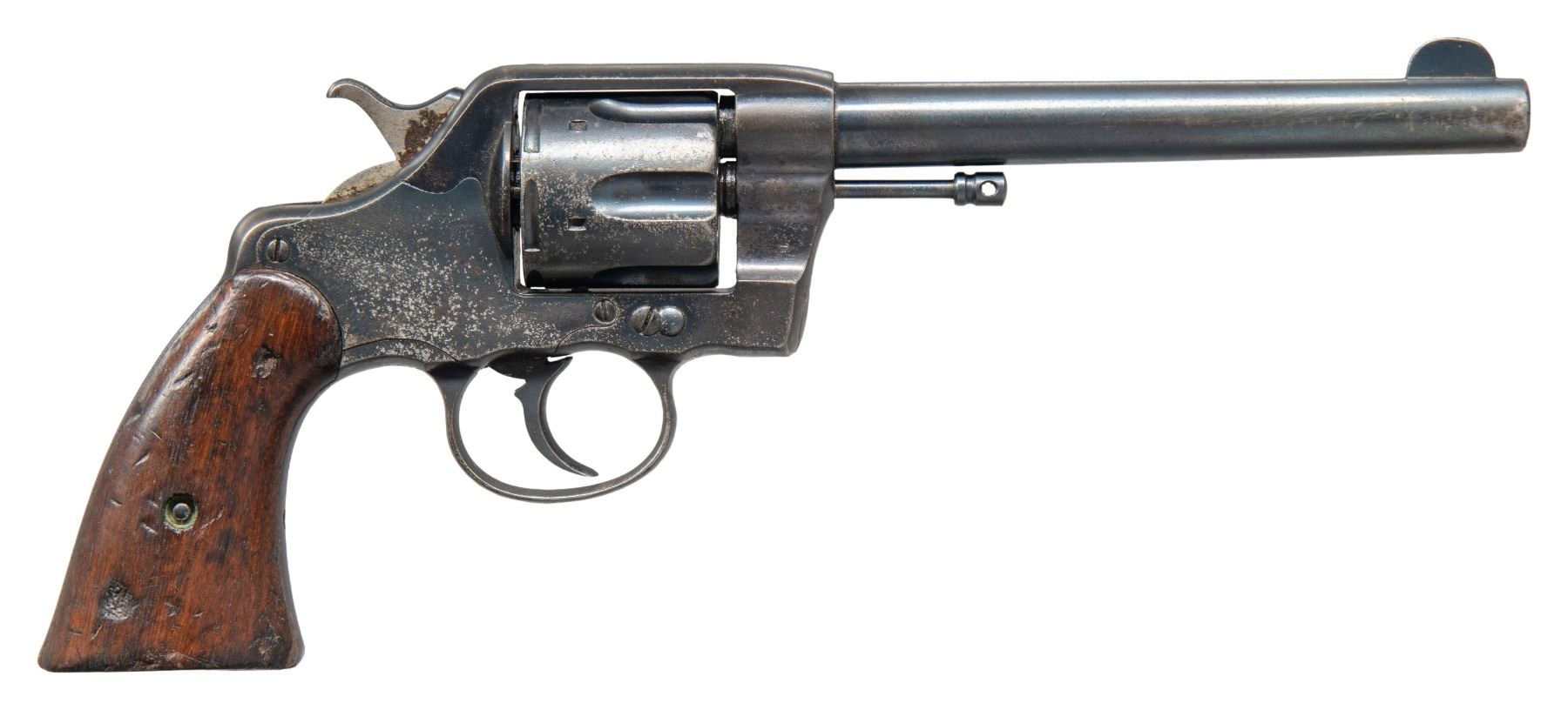 REVOLVER. Cal. 38 LC. S# 61054. Bbl. 6" U.S. Army Model of 1894 double action revolver mfg. by Colt in 1895. Left side of the bbl. is marked "COLT D.A. 38", with Colt's 2-line mfg. and patent information marked across the top. Left side of the frame is marked "R.A.C." (Rinaldo A. Carr) and is repeated on the underside of the bbl., rear of the cyl., and butt of the left grip panel. Butt is marked "U.S./ ARMY/ MODEL/ 1894/ No/ 61/ 054". Metal components exhibit a reapplied blue finish overall. Sides of the hammer are polished in-the-white. Frame is mounted with 2-piece plain wood grips. Standard fixed half-moon blade front sight and frame notched rear sight. Matching assembly # "1054" is present on the frame, cyl. crane, cyl., and cyl. latch. Mainspring tension screw is absent. CONDITION: metal components retain large amounts of their reapplied blue finish, exhibiting areas of wear and thinning fading to gray patina, areas of oxidative finish loss, as well as light pitting beneath the finish overall. Grip straps exhibit consistent light surface oxidation. Mirror bore, exhibiting a couple of small scattered spots of light pitting, while retaining strong rifling throughout. Proper manual mechanics. Grips show scattered marks and impressions from handling and storage, but otherwise remain sound. (01-26692/MLW). ANTIQUE. $300-500.