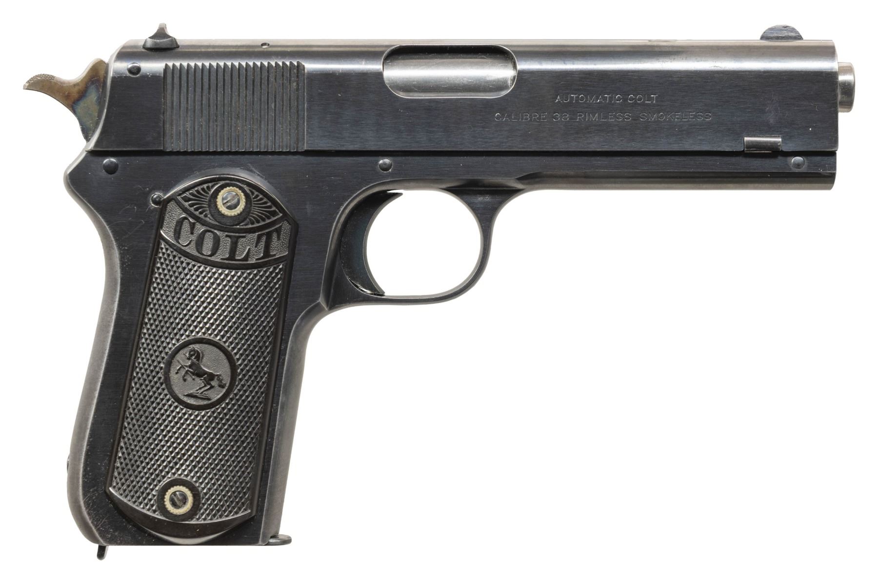 SEMI-AUTOMATIC PISTOL. Cal. 38 Rimless. S# 40590. Bbl. 4 1/2". Model 1903 Pocket Hammer semi-automatic pistol mfg. by Colt in 1919.Left side of the slide is marked with Colt's patent and mfg. information, followed by the Rampant Colt logo, with "AUTOMATIC COLT/ CALIBRE 38 RIMLESS SMOKELESS" marked on the right. Left side of the forward trigger guard is stamped "1" above Colt's "VP" proof, with "93" stamped on the obverse. Metal components exhibit a polished blue finish overall, save for on the muzzle and chamber areas of the bbl., which are polished in-the-white. Hammer exhibits a case colored finish. Frame is mounted with 2-piece "COLT" checkered brown hard rubber grips. Standard fixed half-moon blade front sight and dovetailed U-notch rear sight. Slide matches the frame via the full S# on the interior. MAGS: x1 blued steel 7-rd. CONDITION: metal components retain the vast majority of their original factory blue finish, exhibiting some spots of light edge wear, as well as some superficial handling marks and spots of light surface oxidation. Front grip strap exhibits a few spots of mild wear and thinning fading to gray patina, with the rear grip strap having largely faded to gray and showing scattered spots of light surface oxidation. Hammer retains the majority of its original case colored finish, showing some spots of light surface oxidation. Very bright bore, exhibiting a scattering of small spots of light to mild pitting, while retaining well defined rifling throughout. Proper manual mechanics. Grips show some light smoothing to the diamonds, as well as a few superficial marks from handling and storage, but otherwise remain very good overall. An attractive Colt Model 1903 Pocket Hammer semi-automatic pistol. (25-5433/MLW). CURIO. $800-1,400.