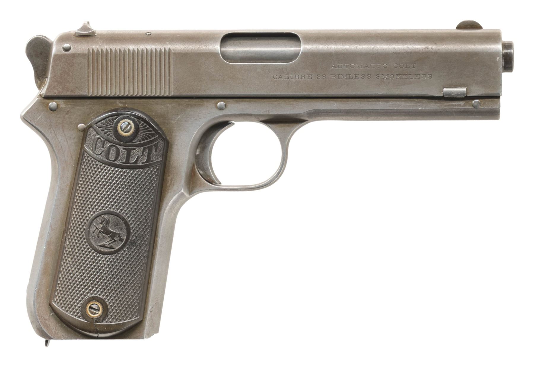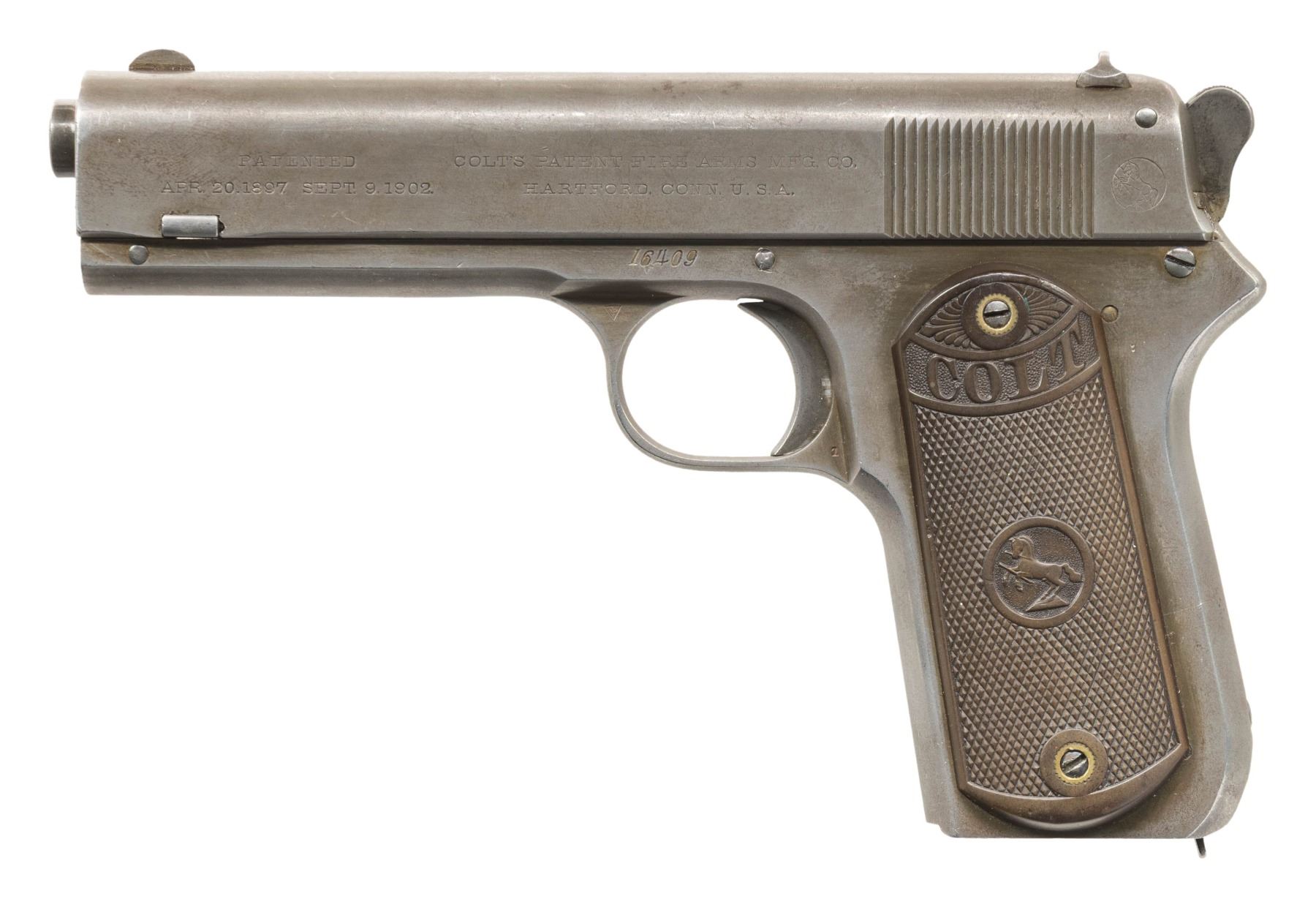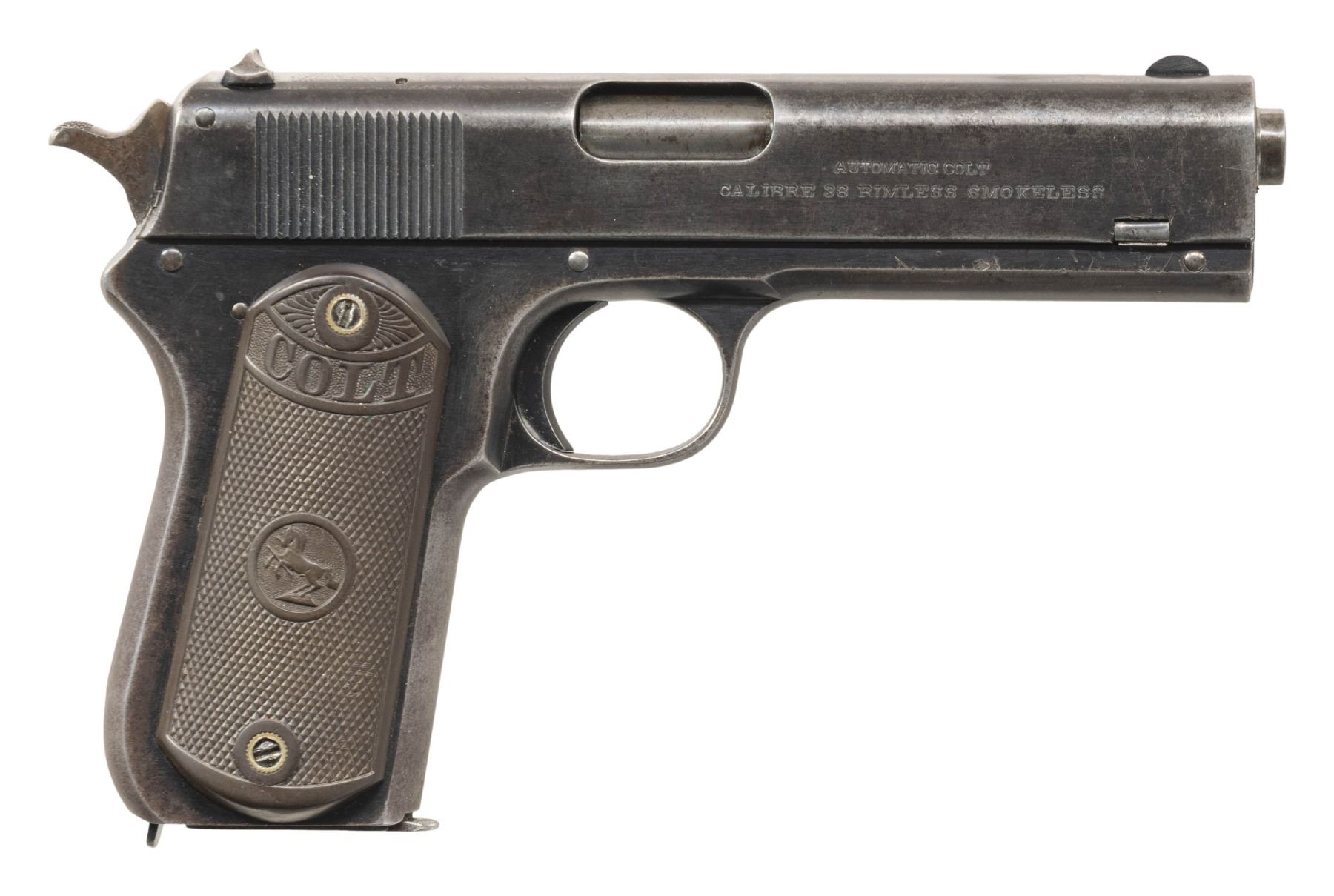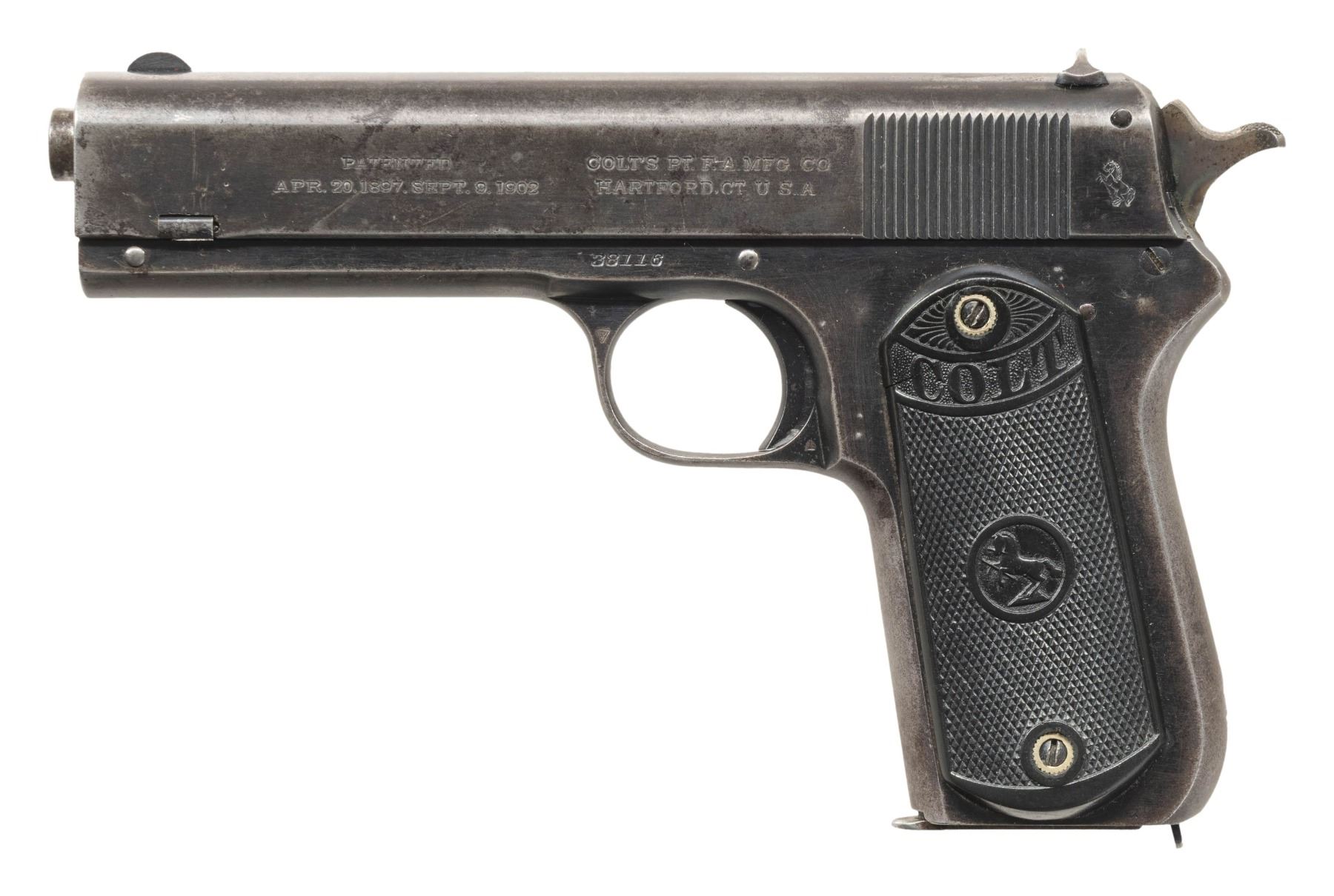 SEMI-AUTOMATIC PISTOLS. Cal. 38 Rimless. S# 16409. Bbl. 4 1/2". Model 1903 Pocket Hammer semi-automatic pistol mfg. by Colt during the first year of production (1903). Left side of the slide is marked with Colt's patent and mfg. information, followed by the encircled Rampant Colt logo, with "AUTOMATIC COLT/ CALIBRE 38 RIMLESS SMOKELESS" marked on the right. Bbl. exhibits a blue finish overall, save for on the muzzle and chamber areas of the bbl., which are polished in-the-white. Frame is mounted with 2-piece "COLT" checkered brown hard rubber grips. Standard fixed half-moon blade front sight and dovetailed U-notch rear sight. Slide is unnumbered. Mag. is absent. CONDITION: metal components have faded to a mottled gray patina, exhibiting consistent light to mild pitting overall, with some spots of light surface oxidation. Bbl. retains the majority of its original factory blue finish in protected areas, with in-the-white areas having faded to a gray patina. Bore is bright, exhibiting a consistent scattering of mild pitting, while retaining strong rifling throughout. Proper manual mechanics. Grips show light to mild smoothing, as well as some scattered handling marks, with the right grip exhibiting a crack that runs through the bottom screw slot and along the underside of the panel. (25-5402/MLW). 2) Cal. 38 Rimless. S# 38116. Bbl. 4 1/2". Model 1903 Pocket Hammer semi-automatic pistol mfg. by Colt in 1917. Left side of the slide is marked with Colt's patent and mfg. information, followed by the Rampant Colt logo, with "AUTOMATIC COLT/ CALIBRE 38 RIMLESS SMOKELESS" marked on the right. Metal components exhibit a blue finish overall, save for on the muzzle and chamber areas of the bbl., which are polished in-the-white. Hammer exhibits a case colored finish. Frame is mounted with 2-piece "COLT" checkered brown hard rubber grips. Standard fixed half-moon blade front sight and dovetailed U-notch rear sight. Slide is unnumbered. MAGS: 1 7-rd. CONDITION: metal components retain fair to good amounts of their original factory blue finish, exhibiting areas of wear and thinning fading to gray patina, with scattered spots of light to mild surface oxidation present overall. Hammer retains fair amounts of its original case colored finish. Bright bore, exhibiting consistent light to mild pitting, while retaining strong rifling throughout. Proper manual mechanics. Grips show some light smoothing and scattered marks from handling and storage, with the left grip exhibiting a crack on the left side of the panel along the upper left edge. (25-5424/MLW). BOTH CURIO. $900-1,300.