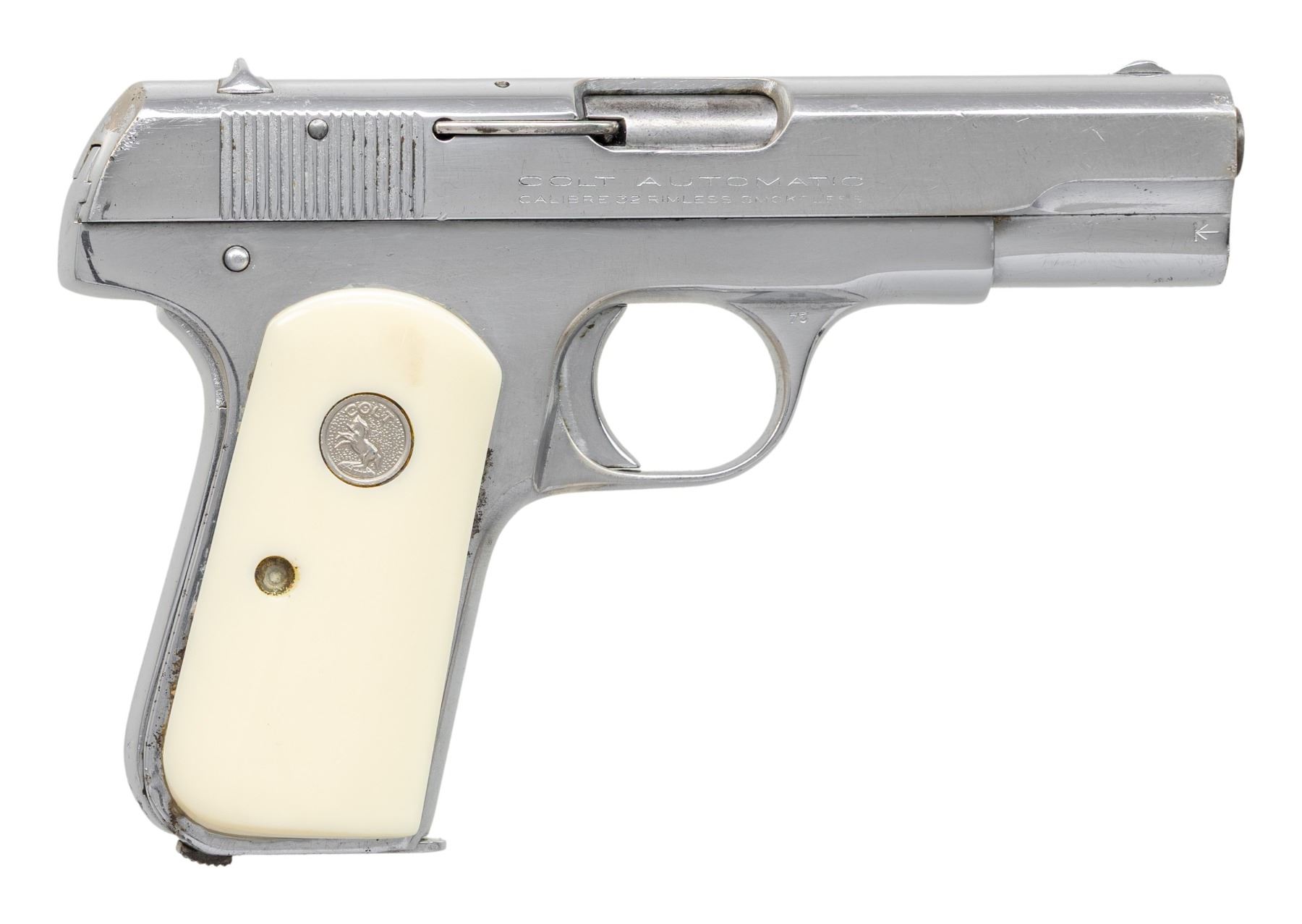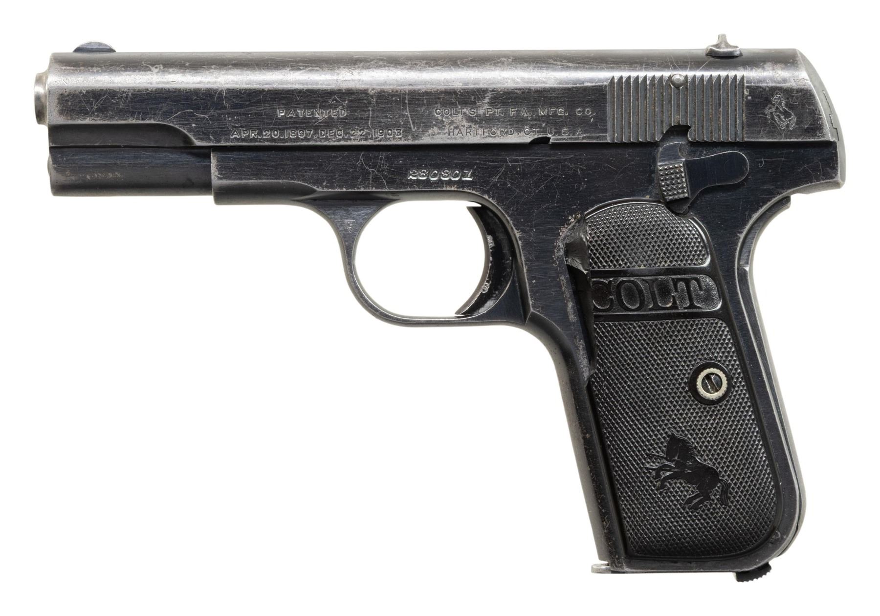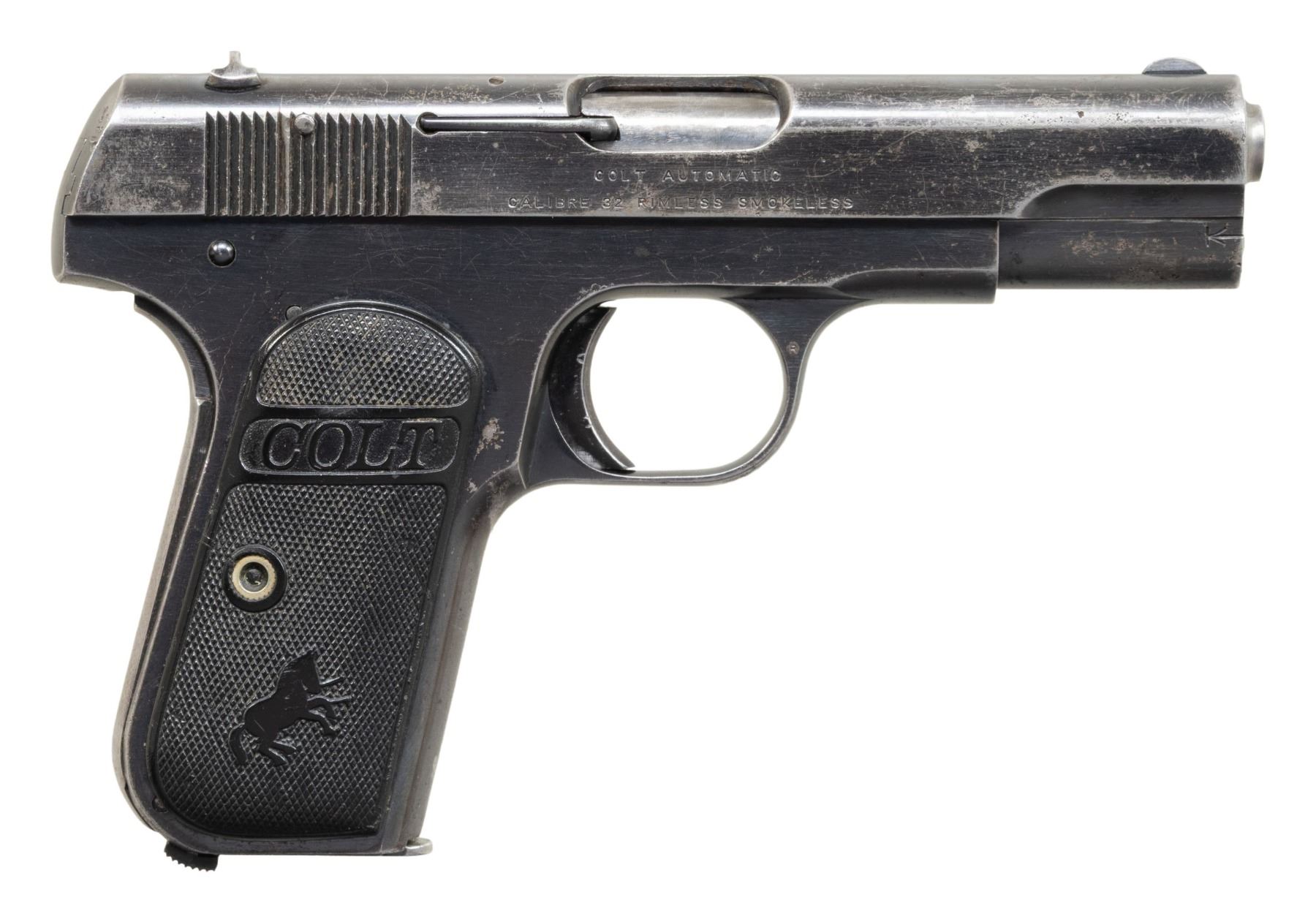 SEMI-AUTOMATIC PISTOLS. 1) COLT MODEL 1908 HAMMERLESS SEMI-AUTOMATIC PISTOL. Cal. 380 ACP. S# 91185. Bbl. 3 3/4". Model 1908 Hammerless semi-automatic pistol mfg. by Colt in 1928. Left side of the slide is marked with Colt's 2-line mfg. and patent information, followed by the Rampant Colt logo, with "COLT AUTOMATIC/ CALIBRE .380 HAMMERLESS" marked on the right. Metal components exhibit a blue finish overall, save for on the muzzle and chamber areas of the bbl., which are polished in-the-white. Frame is mounted with 2-piece Colt silver medallion checkered wood grips. Standard fixed half-moon blade front sight and dovetailed U-notch rear sight. Slide matches the frame via the full S# on the interior. MAGS: x1 dual-tone 7-rd. CONDITION: metal components retain large amounts of their original factory blue finish, exhibiting areas of wear and thinning that have faded to gray patina, with scattered spots and small patches of light surface oxidation and pitting overall. Bore is bright, exhibiting a consistent scattering of light to mild surface oxidation and pitting, while retaining good rifling throughout. Proper manual mechanics. Grips show heavy smoothing, as well as scattered marks and impressions from handling and storage, but otherwise remain sound. (25-5386/MLW). 2) COLT MODEL 1903 HAMMERLESS SEMI-AUTOMATIC PISTOL. Cal. 32 Rimless. S# 280801. Bbl. 3 3/4". Model 1903 Hammerless semi-automatic pistol mfg. by Colt in 1918. Left side of the slide is marked with Colt's patent and mfg. information, followed by the Rampant Colt logo, with "COLT AUTOMATIC/ CALIBRE 32 RIMLESS SMOKELESS" marked on the right. Metal components exhibit a blue finish overall, save for on the bbl., which is polished in-the-white. Frame is mounted with 2-piece "COLT" checkered brown hard rubber grips. Standard fixed half-moon blade front sight and dovetailed U-notch rear sight. Slide matches the frame via "801" on the interior. MAGS: x1 dual-tone 8-rd. CONDITION: metal components retain large amounts of their original factory blue finish, exhibiting areas and patches of wear fading to gray patina, with scattered spots of mild pitting present overall. Very bright bore, exhibiting consistent light pitting, while retaining good rifling throughout. Proper manual mechanics. Grips show light to mild smoothing and some superficial handling marks, with the left grip exhibiting a large chip at the upper left section of the panel. (25-5396/MLW). 3) COLT MODEL 1903 HAMMERLESS SEMI-AUTOMATIC PISTOL. Cal. 32 Rimless. S# 540693. Bbl. 3 3/4". Model 1903 Hammerless semi-automatic pistol mfg. by Colt in 1940. Left side of the slide is marked with Colt's 2-line mfg. and patent information (Rampant Colt logo obliterated), with "COLT AUTOMATIC/ CALIBRE 32 RIMLESS SMOKELESS" marked on the right. Metal components exhibit a reapplied nickel plated finish overall, save for on the bbl., which is blued, as well as polished in-the-white at the muzzle and chamber areas. Frame is mounted with 2-piece Ajax aftermarket Colt silver medallion faux ivory grips. Standard fixed blade front sight and dovetailed square notch rear sight. Slide matches the frame via the full S# on the interior. MAGS: x1 reapplied nickel plated 8-rd. CONDITION: metal components retain the majority of their reapplied nickel finish, showing scattered spots and patches of flaking that show through to gray patina, with scattered patches of mild to moderate pitting. Relatively bright bore, exhibiting consistent light to mild pitting, while retaining good rifling throughout. Proper manual mechanics. Grips show some superficial handling marks, but otherwise remain sound. Interior of right grip panel is chipped around the screw slot, with a previous glued repair having broken free. (25-5410/MLW). ALL CURIO. $850-1,300.