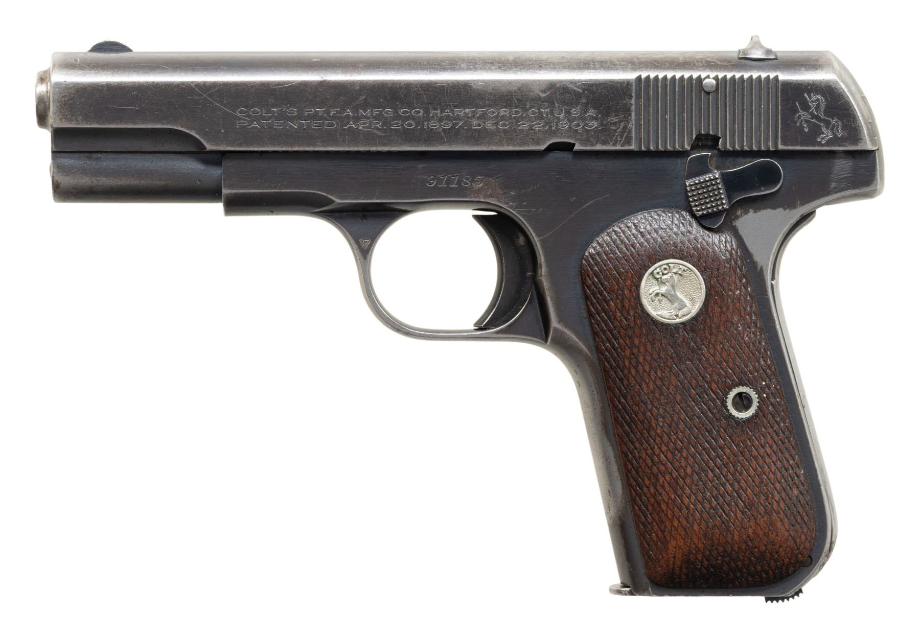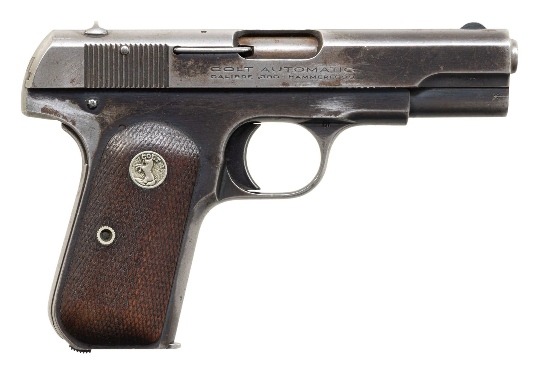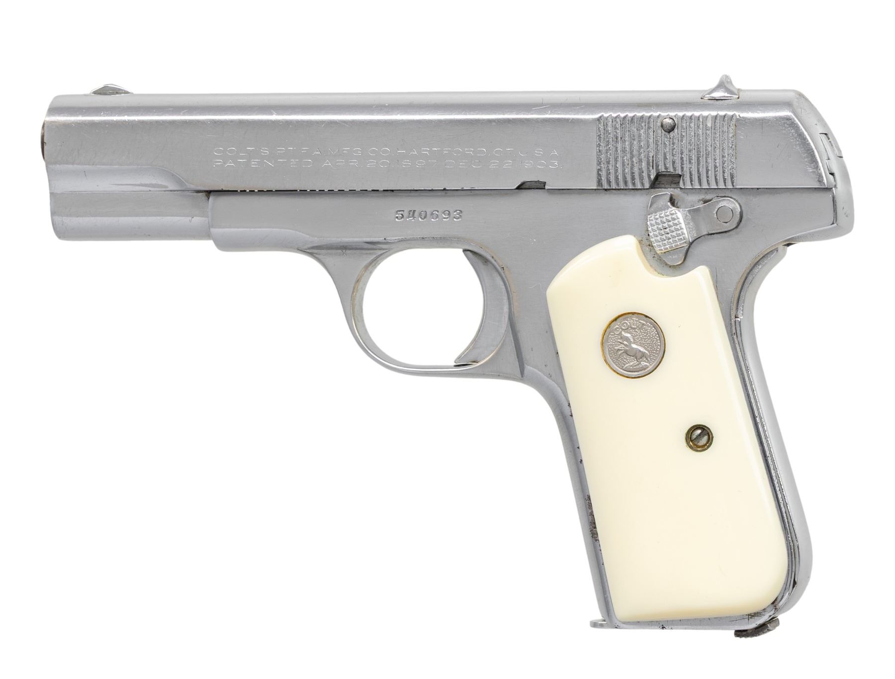 SEMI-AUTOMATIC PISTOLS. 1) COLT MODEL 1908 HAMMERLESS SEMI-AUTOMATIC PISTOL. Cal. 380 ACP. S# 91185. Bbl. 3 3/4". Model 1908 Hammerless semi-automatic pistol mfg. by Colt in 1928. Left side of the slide is marked with Colt's 2-line mfg. and patent information, followed by the Rampant Colt logo, with "COLT AUTOMATIC/ CALIBRE .380 HAMMERLESS" marked on the right. Metal components exhibit a blue finish overall, save for on the muzzle and chamber areas of the bbl., which are polished in-the-white. Frame is mounted with 2-piece Colt silver medallion checkered wood grips. Standard fixed half-moon blade front sight and dovetailed U-notch rear sight. Slide matches the frame via the full S# on the interior. MAGS: x1 dual-tone 7-rd. CONDITION: metal components retain large amounts of their original factory blue finish, exhibiting areas of wear and thinning that have faded to gray patina, with scattered spots and small patches of light surface oxidation and pitting overall. Bore is bright, exhibiting a consistent scattering of light to mild surface oxidation and pitting, while retaining good rifling throughout. Proper manual mechanics. Grips show heavy smoothing, as well as scattered marks and impressions from handling and storage, but otherwise remain sound. (25-5386/MLW). 2) COLT MODEL 1903 HAMMERLESS SEMI-AUTOMATIC PISTOL. Cal. 32 Rimless. S# 280801. Bbl. 3 3/4". Model 1903 Hammerless semi-automatic pistol mfg. by Colt in 1918. Left side of the slide is marked with Colt's patent and mfg. information, followed by the Rampant Colt logo, with "COLT AUTOMATIC/ CALIBRE 32 RIMLESS SMOKELESS" marked on the right. Metal components exhibit a blue finish overall, save for on the bbl., which is polished in-the-white. Frame is mounted with 2-piece "COLT" checkered brown hard rubber grips. Standard fixed half-moon blade front sight and dovetailed U-notch rear sight. Slide matches the frame via "801" on the interior. MAGS: x1 dual-tone 8-rd. CONDITION: metal components retain large amounts of their original factory blue finish, exhibiting areas and patches of wear fading to gray patina, with scattered spots of mild pitting present overall. Very bright bore, exhibiting consistent light pitting, while retaining good rifling throughout. Proper manual mechanics. Grips show light to mild smoothing and some superficial handling marks, with the left grip exhibiting a large chip at the upper left section of the panel. (25-5396/MLW). 3) COLT MODEL 1903 HAMMERLESS SEMI-AUTOMATIC PISTOL. Cal. 32 Rimless. S# 540693. Bbl. 3 3/4". Model 1903 Hammerless semi-automatic pistol mfg. by Colt in 1940. Left side of the slide is marked with Colt's 2-line mfg. and patent information (Rampant Colt logo obliterated), with "COLT AUTOMATIC/ CALIBRE 32 RIMLESS SMOKELESS" marked on the right. Metal components exhibit a reapplied nickel plated finish overall, save for on the bbl., which is blued, as well as polished in-the-white at the muzzle and chamber areas. Frame is mounted with 2-piece Ajax aftermarket Colt silver medallion faux ivory grips. Standard fixed blade front sight and dovetailed square notch rear sight. Slide matches the frame via the full S# on the interior. MAGS: x1 reapplied nickel plated 8-rd. CONDITION: metal components retain the majority of their reapplied nickel finish, showing scattered spots and patches of flaking that show through to gray patina, with scattered patches of mild to moderate pitting. Relatively bright bore, exhibiting consistent light to mild pitting, while retaining good rifling throughout. Proper manual mechanics. Grips show some superficial handling marks, but otherwise remain sound. Interior of right grip panel is chipped around the screw slot, with a previous glued repair having broken free. (25-5410/MLW). ALL CURIO. $850-1,300.