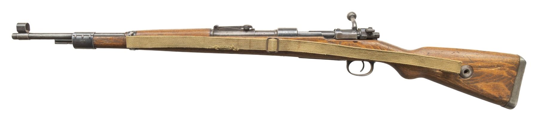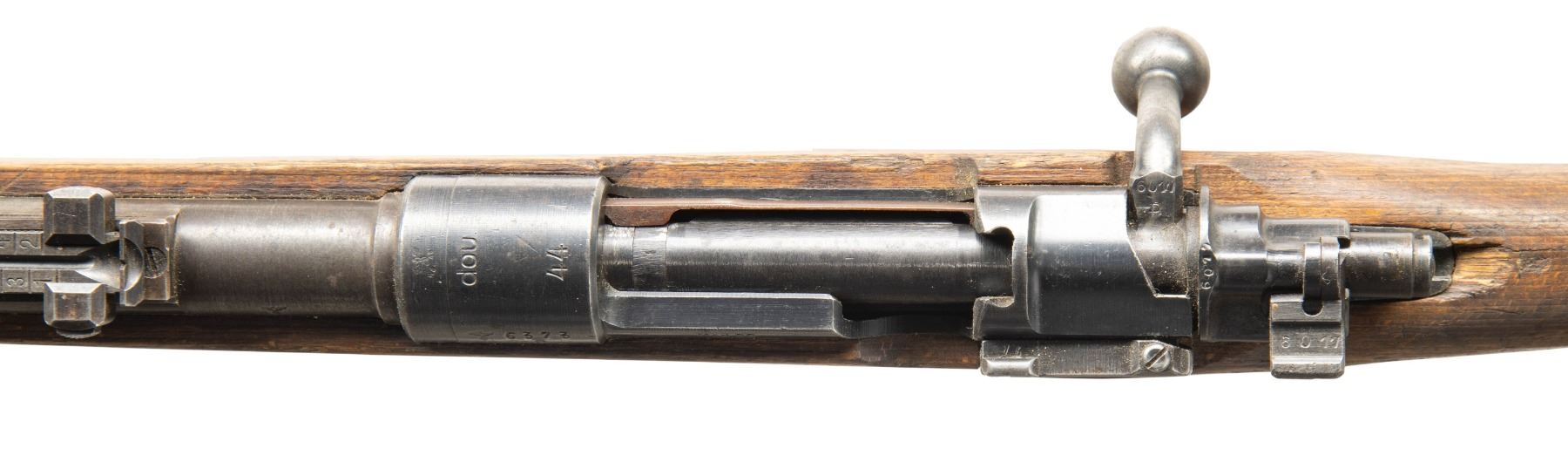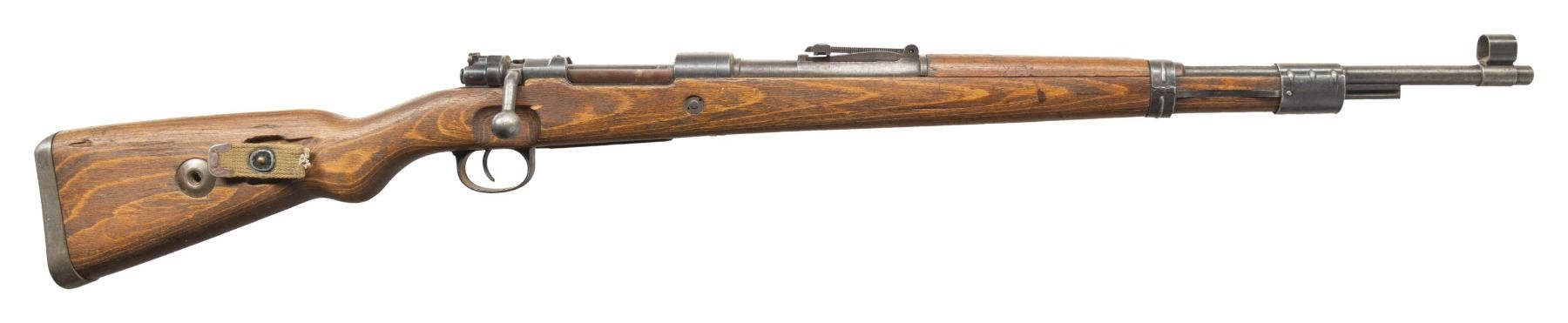 Cal. 8x57 (8mm Mauser). S# 6373c. Bbl. 23 1/2". K98k style sights with hooded front, Bolt parts & follower are mismatched but other visible parts are matching numbered to receiver. Dou44 coded receiver. Blued finish. Laminated stock set with left side sling provisions & USGI M1 Carbine sling. Stock is drilled for cleaning rod but no rod present. CONDITION: stock set appears sanded with a couple cracks & a chip behind upper tang, some improper band removal wear on forend, some laminate separations on butt, scattered dings, handling marks scratches. Handguard is loose & stock maybe duffel cut under rear band. Metal retains 30% original blue with overall fading to gray, some improper removal wear on bands, scattered oxidation, edge wear & handling marks. Action functions properly when hand cycled. Bore shows some light oxidation but strong rifling. (25-6172/MJC). CURIO. $800-1,200.