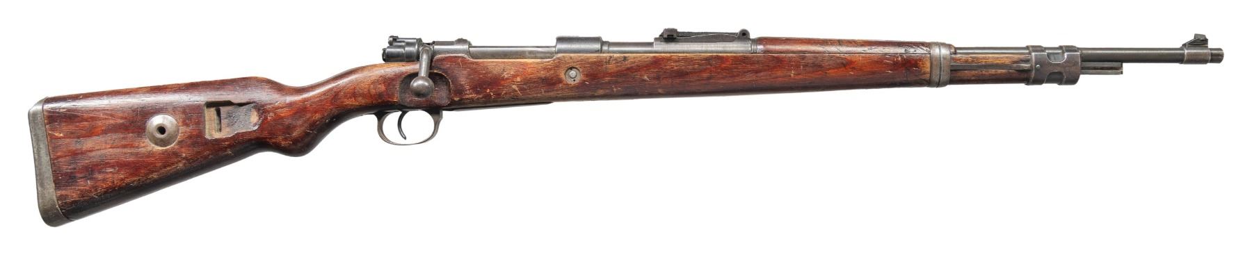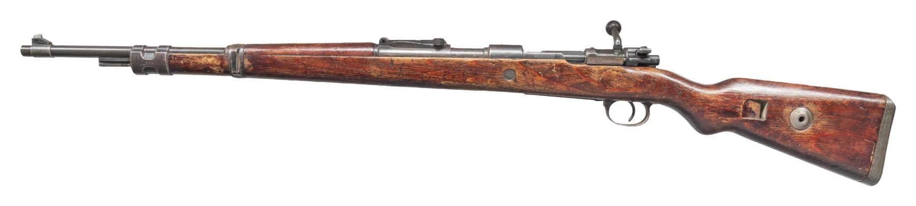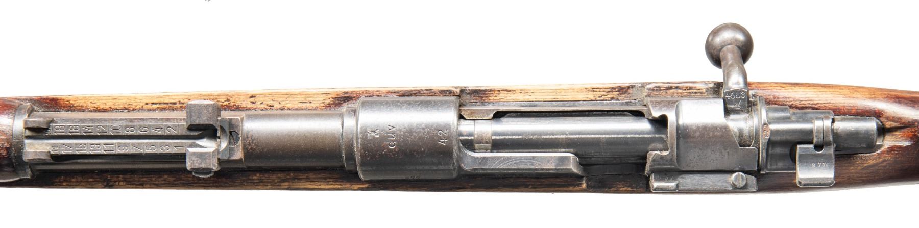 Cal. 8x57 (8mm Mauser). S# 677a. Bbl. 23 1/2". Standard K98k style sights without front sight hood. Bolt handle & extractor are mismatched but other visible numbered parts are matching including rear half of bolt . Receiver has duv 42 markings with eagle "214" inspection stamp denoting 1942 mfr. by Berliner Lubecker. Blued finish. Laminated stock set with left side sling provisions. No Cleaning rod present. CONDITION: refinished stock has added varnish with scattered flaking, scratches dings & handling marks. Metal is turning gray with strong traces of original blue, edge wear, handling marks & scattered oxidation. Action functions properly when hand cycled. Bore shows scattered oxidation & some pitting but strong rifling. (25-6179/MJC). CURIO. $700-1,000.