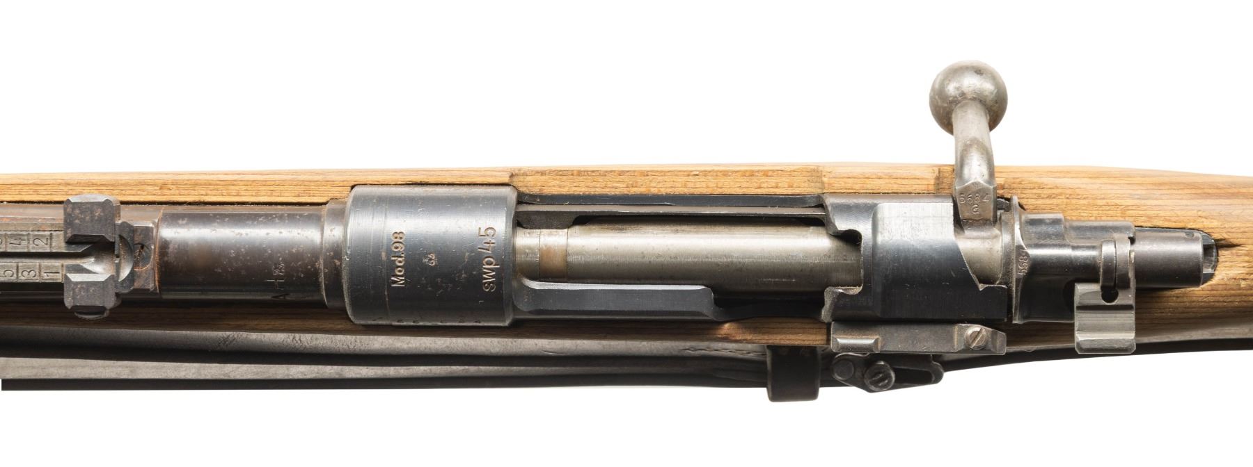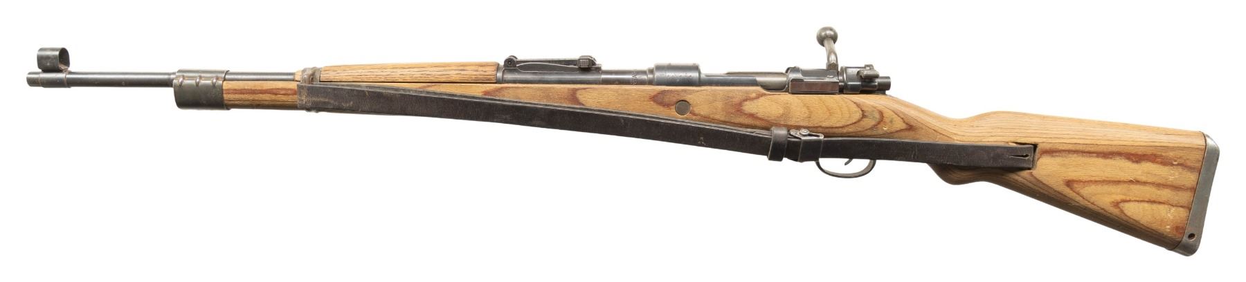 Cal. 8x57 (8mm Mauser). S# 55684a. Bbl. 23 1/2". Standard K98k style sights with hooded front. Bolt handle & shroud are matching but appear renumbered without "63" inspection stamps. Other visible parts are unnumbered. Late war assembled rifle with German "63" inspection stamps & "swp45" receiver code. Bottom metal appears to have a phosphate finish with "svw" coded trigger guard. Other parts are mostly blued. Laminated stock set with two hole front band, left side sling provisions & leather sling. CONDITION: stock has a cleaned appearance with a small crack at head of handguard, some dings & handling marks. Metal retains 80% blue with scattered oxidation, fading to gray, edge wear & handling marks. Bottom metal is proud of wood. Action is stiff but functional when hand cycled. Very good bright bore with some light frosting. (25-6165/MJC). CURIO. $700-1,000.