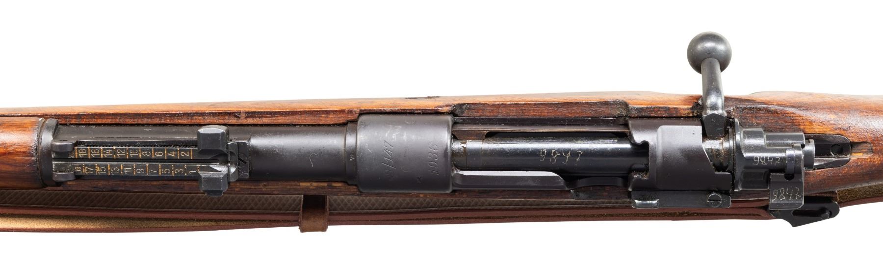 Cal. 8mm Mauser. S# 9847. Bbl. 23 1/2" with TGI import marking. Standard K98k sights. Original matching German numbers on receiver, bbl. & front sight. Soviet force matched numbers on stock, bolt parts, bottom metal & rear sight. 1938 S/147 (JP Sauer) K98k rifle captured by the Soviets & overhauled post war. Receiver has Russian "X" marking. Arsenal rework dull blue finish. Laminated stock set with cupped buttplate, left side sling provisions & repro sling Cleaning rod present that appears to be newer. CONDITION: stock set has arsenal rework finish with an armorer patch repair on handguard, some chipping on butt, some finish loss, chipping around recoil lug, a small crack at handguard tip, some dings & handling marks. Metal retains 90% dull Soviet arsenal blue with some blued over pitting, scattered edge wear & handling marks. Action functions properly when hand cycled. Bore shows scattered frosting & pitting but good rifling. (25-5494/MJC). CURIO. $500-800.