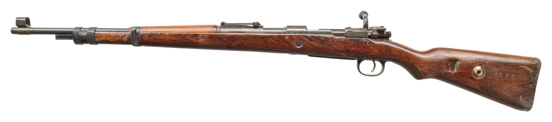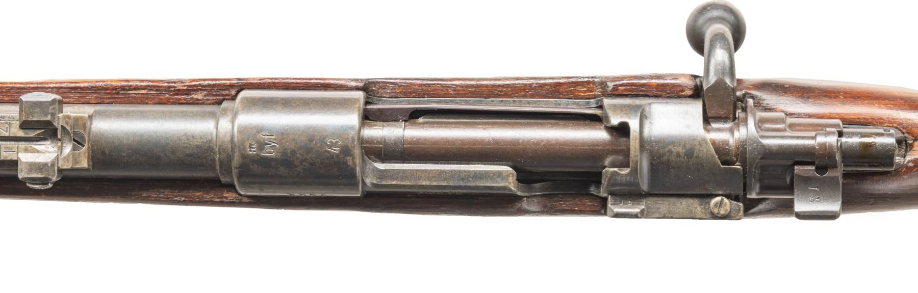 Cal. 8x57 (8mm Mauser). S# 8005a. Bbl. 23 1/2". Standard K98k style sights with replacement front sight hood. Matching numbers on receiver, bolt release & rear sight parts. Other visible parts are mismatched or unnumbered. Bolt appears to be an unnumbered Czech replacement. BYF43 coded receiver. Reblue finish. Replacement Russian capture stock with left side sling provisions. Base rifle lacks import markings & does not appear to be Russian Capture. No cleaning rod present. CONDITION: stock has Soviet added finish with scattered flaking, improper band removal wear, handling marks, dings & some sticker wear. Metal has a mix of old touch up that is fading to gray & Soviet arsenal rework blue on bands, scattered oxidation, handling marks, light oxidation & edge wear. Action functions properly when hand cycled. Bore shows pitting & oxidation along its length with strong rifling. (25-4787/MJC). CURIO. $400-600.