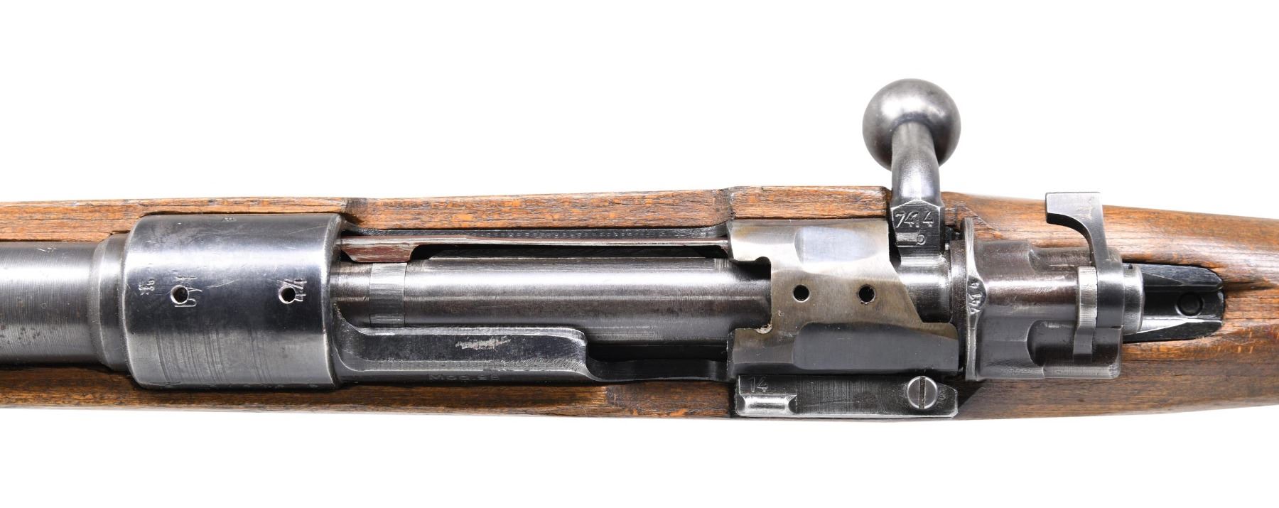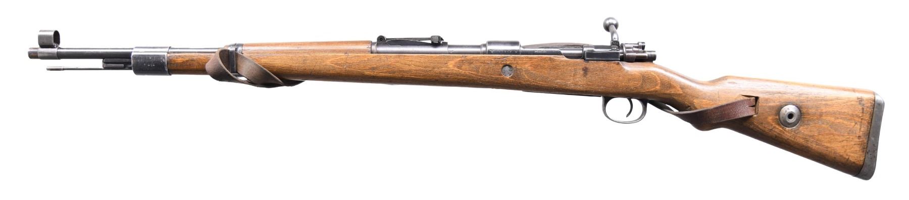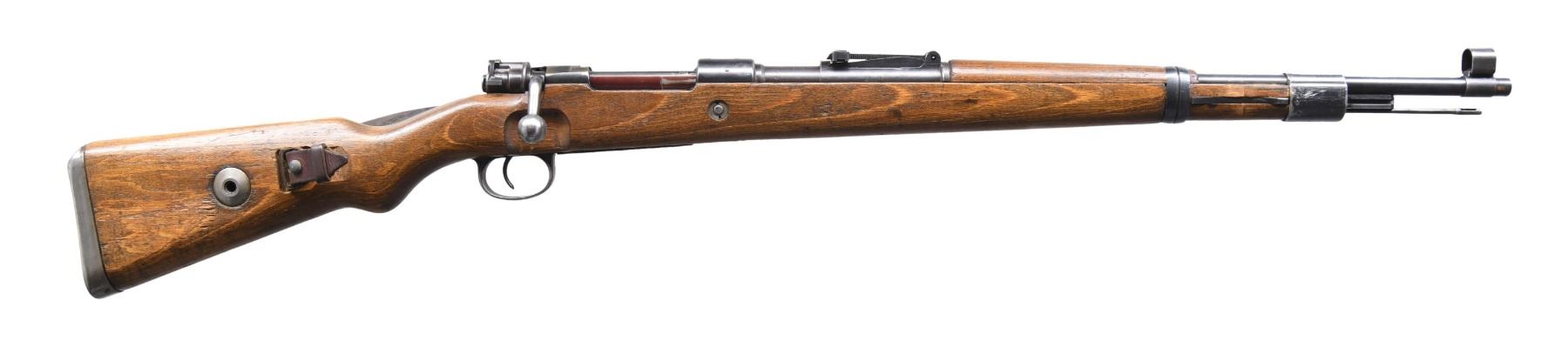 MILITARY RIFLE.Cal. 8MM Mauser. S# 37414b. All visible numbers match. Bbl. 23 3/4". Barrel marked on right side over chamber with German "eagle" proof. Tangent rear sight graduated to 2000 meters. Inverted V front sight with protective hood. Receiver is marked on top "byf" and "44". Marked on left side with German eagle and Mod. 98. Rifle has been modified with hobbiest gunsmith type workmanship to include drilling top of the receiver for scope mounting. The receiver bridge has been ground to remove the clip guides. The safety has been replaced by a Mark II low scope type. Bolt handle is unaltered. Solid upper band shows grinding marks around the rear edge. Stamped trigger guard and floorplate. Cleaning rod is present. Laminated stock set with cup type buttplate. Buttstock has faint acceptance mark at belly. Bayonet bar is present. Original brown leather sling with period repair. UNNATTACHED ACCESSORIES: one lower half of see-through scope ring. CONDITION: Stock set has moderate wear, staining and handling marks with added inked initials in bolt recess and sling cut. Metal retains 60% of its original finish with wear, handling marks and several small areas of light oxidation. Extractor has notable plum hue. Feed ramp has been modified by grinding. Very good shiny bore. (24-4166/RW). MODERN. $300-500.
