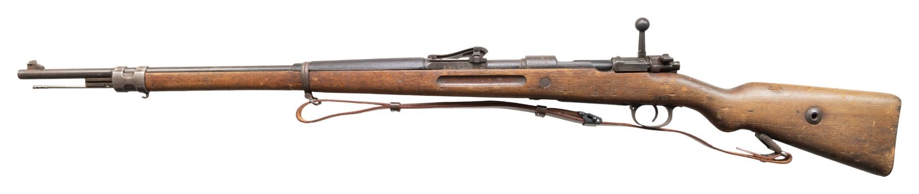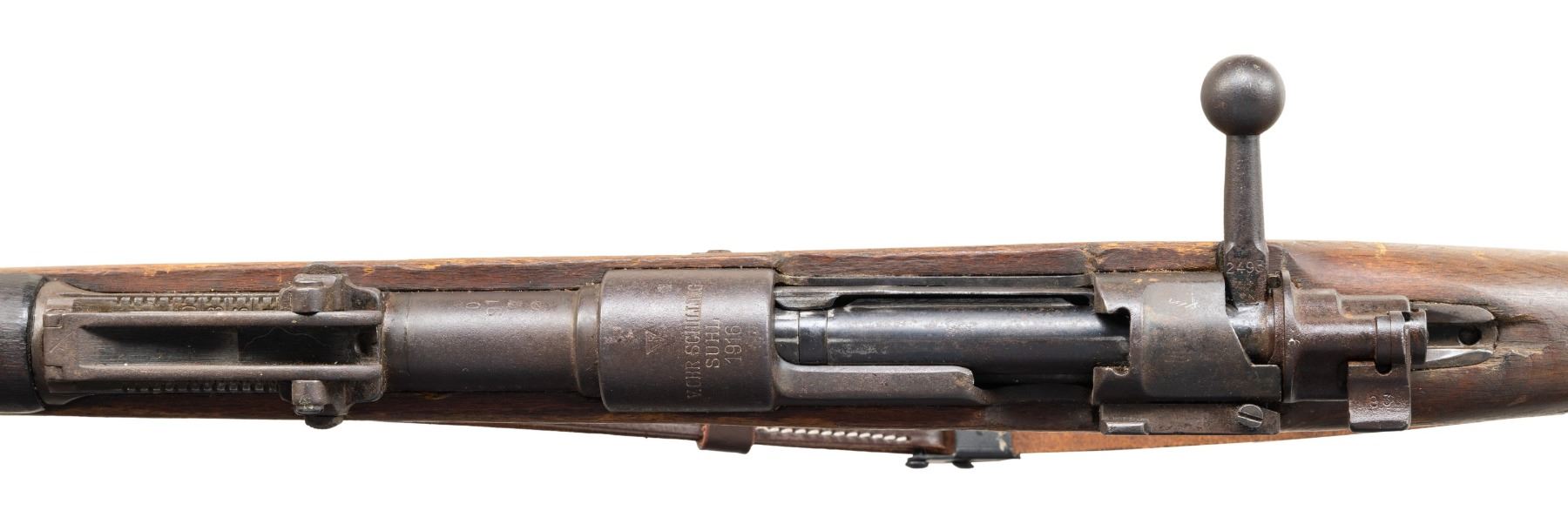 Cal. 8mm Mauser. S# 2493g. Bbl. 29" marked with circled "Z" & Polish eagle. Gew 98 style sights with roller coaster rear. Matching numbers on receiver, bbl., bolt parts, rear sight, floorplate & trigger guard. Stock, bands & cleaning rod are all mismatched. Rear locking screw missing. WW1 1916 VC Schilling Gew 98 reworked by Radom in Poland. Receiver ring has Radom triangle "FB", Polish Eagle & VCS markings. Arsenal rework blue finish. Beech stock set with darker handguard, bottom mounted sling swivels & repro sling. Replacement cleaning rod present that appears to be from a South American Mauser. CONDITION: stock set shows a few gouges, scattered finish loss, dings, heavy handling wear, scratches, dings & staining. Metal is proud of wood & has an overall dull faded appearance with improper band removal dings on bbl., scattered fading to gray, edge wear, blued over pitting & oxidation. Action functions properly when hand cycled. Poor bore with several patches of oxidation & pitting. (25-5333/MJC). CURIO. $500-800.