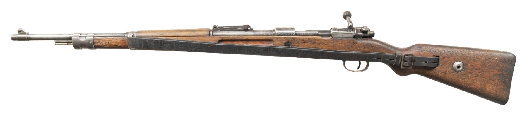 Cal. 8x57 (8mm Mauser). S# 89433. Bbl. 23 5/8". Blade front sight with base slotted for hood but no hood present. Tangent rear sight graduated to 2000m. All visible matching numbers. 1934 production Banner K rifle without any organizational stamps. It is believed these later rifles were used by German police & other agencies. Receiver ring has 1934 date & Mauser Banner. Left side of receiver has BUGN proofs. Walnut stock set with left side sling provisions & leather sling that shows heavy wear. No cleaning rod present. CONDITION; stock set has a cleaned appearance with the name "HIRT" lightly carved on underside of butt, a crack behind upper tang, a small crack at handguard tip, some light chips, dings, moderate abrasions & handling marks. Metal has a silvery-cleaned appearance with scattered oxidation, some light pitting, traces of original bluing, handling marks & some light scratches. Action functions properly when hand cycled. Bore shows some pitting & frosting but good rifling. (25-6167/MJC). CURIO. $700-1,000.