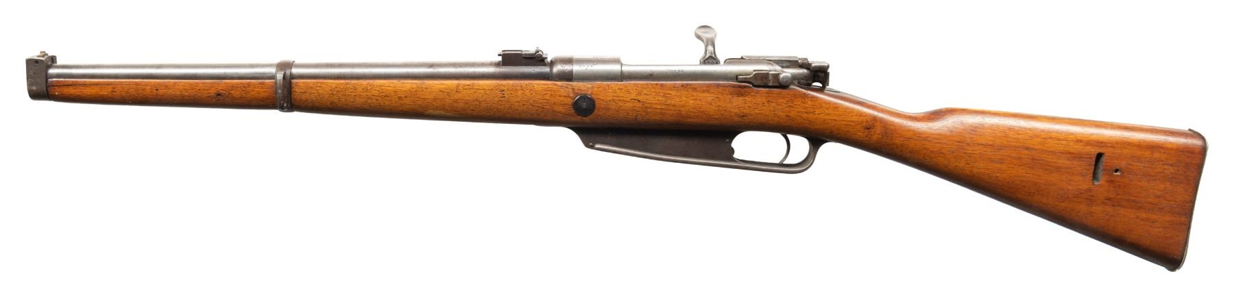 Cal. 8x57. S# 8704f. Bbl. 18". Replacement brass bead front sight with ground ears. Ladder rear sight graduated to 1200m. Bolt head is unnumbered & action screws are later replacements but all other visible numbers are matching to receiver. Receiver ring has "VC SCHILLING" & "S" markings with 1892 date. Nosecap has Bavarian Chevauleger "B.2.Ch.25" unit marking. Receiver, bolt & buttplate are all "In-the-white". Balance of other parts are blued. Walnut stock set with left side sling provisions. CONDITION: sanded stock has added finish with recoil lug & buttplate being proud of wood, small hole on left of butt behind sling cut, a flexing 3" crack on left front of forend, a couple repaired cracks, a 4" chip on right front of forend, scattered staining, dings & handling marks. Metal has an overall cleaned appearance with edge wear, traces of bluing, oxidation, areas turning gray, handling marks & some dings. Action functions properly when hand cycled. Bore has some frosting but strong rifling. (01-26324/MJC). ANTIQUE. $300-500.