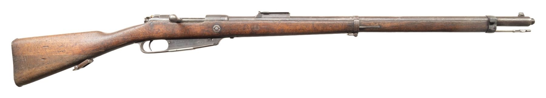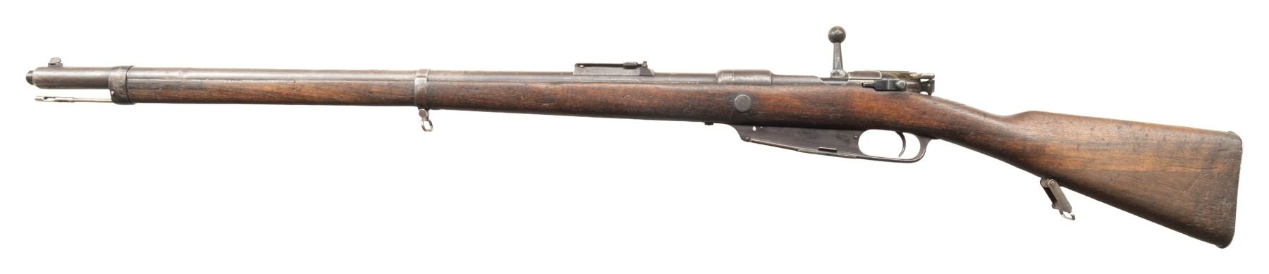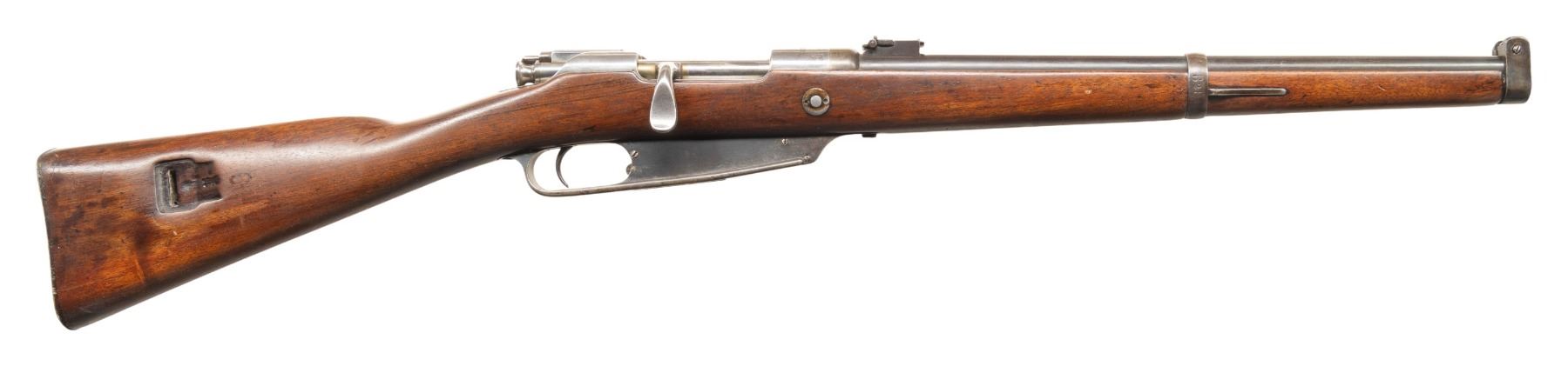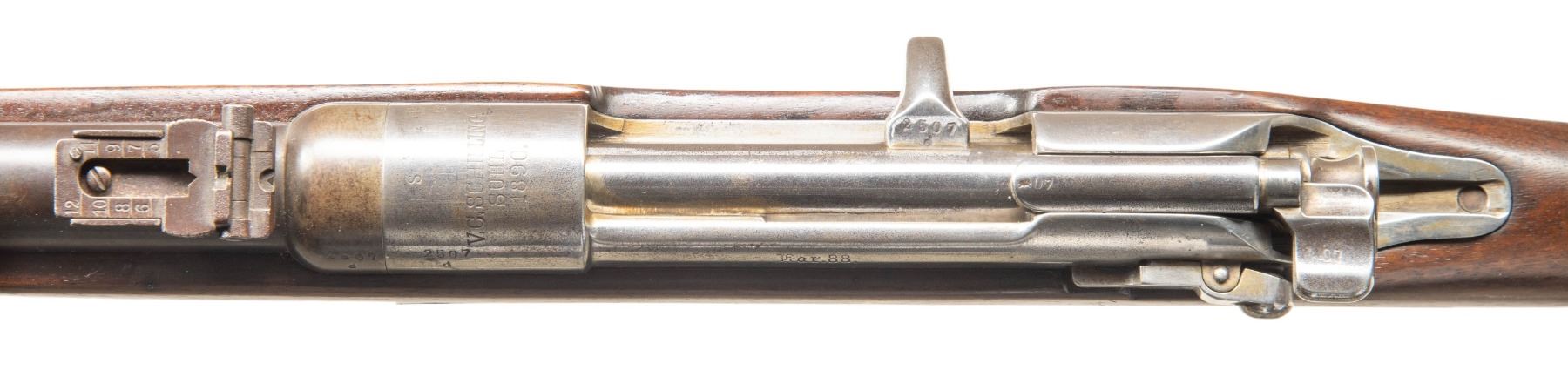 1) VC Schilling KAR 88 Bolt Action Carbine. S# 2507d. Bbl. 18". Standard Kar 88 sights. Action screws are unnumbered later Bavarian type but all other visible numbers are matching to receiver. Rear band has "B.2.U.4.49." Bavarian Ulan unit marking. Front band has additional "B.R. (Reserve) B.5.45" cavalry marking. Receiver ring has standard VCS & "S" markings with 1890 date. Receiver & bolt assembly are "In-the-white". Balance of other parts are blued. Walnut stock with faint Imperial cartouches on right side of butt & left side sling bar. CONDITION: refinished stock has added finish with some dings, finish wear & handling marks. Receiver & bolt are polished bright with scattered oxidation staining & some light pitting. Balance of metal retains 40% arsenal blue with a small bbl. jacket dent, overall fading to gray, some light pitting, scattered oxidation, edge wear & handling marks. Action functions properly when hand cycled. Bore shows scattered oxidation, dried grease & worn rifling. (01-28391/MJC).