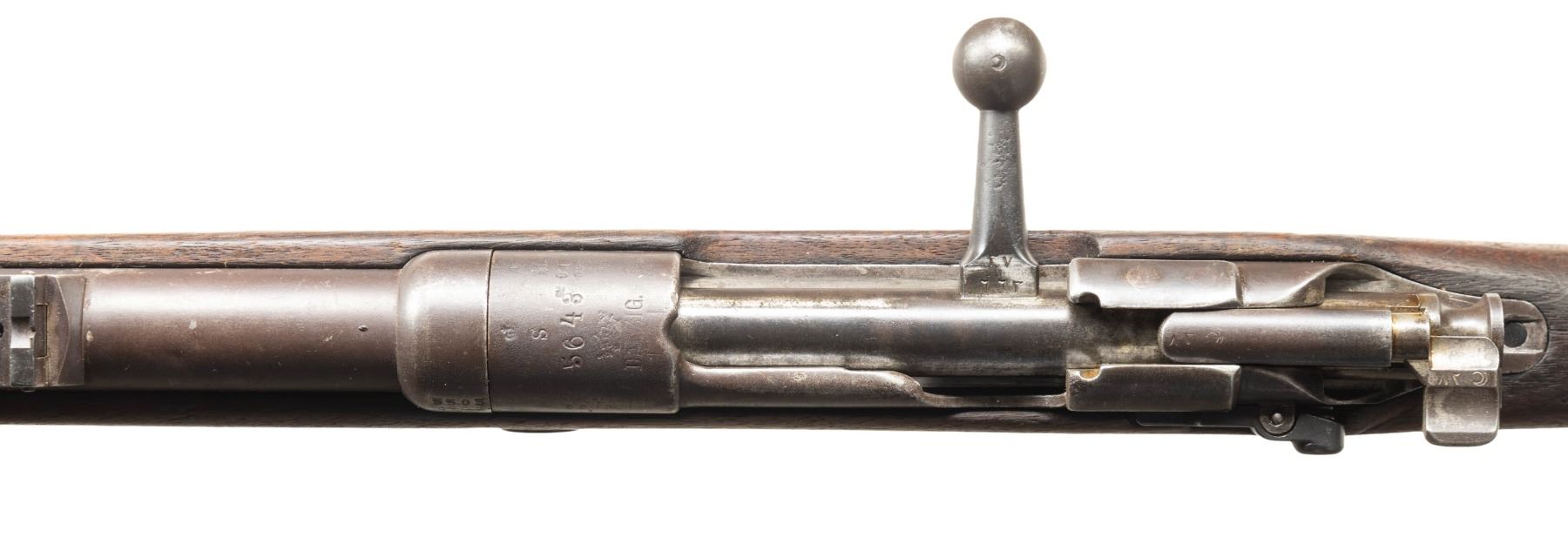 2) Danzig GEW88/05 Bolt Action Rifle. S# 5503l. Bbl. 29". Standard Gew 88 sights with rear having Arabic graduations & missing its elevator. Bbl. jacket has been arsenal force matched but other visible parts are mismatched. Receiver ring has Danzig, "S" & Turkish "5645" markings with faint 1891 date. German 88 updated for 98 stripper clips & later provided to Turks as war aid. Bolt has Turkish numbers. Arsenal rework blue finish. Hardwood stock set with bottom mounted sling swivels. Cleaning rod present. CONDITION: butt has a large splice running through it & appears to be made that way. Stock otherwise has arsenal rework appearance with a couple small cracks, some abrasions, a couple plugged holes, scattered dings, light chips & handling marks. Metal retains 50% Turk arsenal rework blue with scattered pitting, edge wear, oxidation, handling marks, oxidation & some dents on jacket. Action functions properly when hand cycled. Good bright bore with some frosting & light pitting. PROVENANCE: From the PMRB Collection. (01-28397/MJC). BOTH ANTIQUE. $700-1,100 for pair.