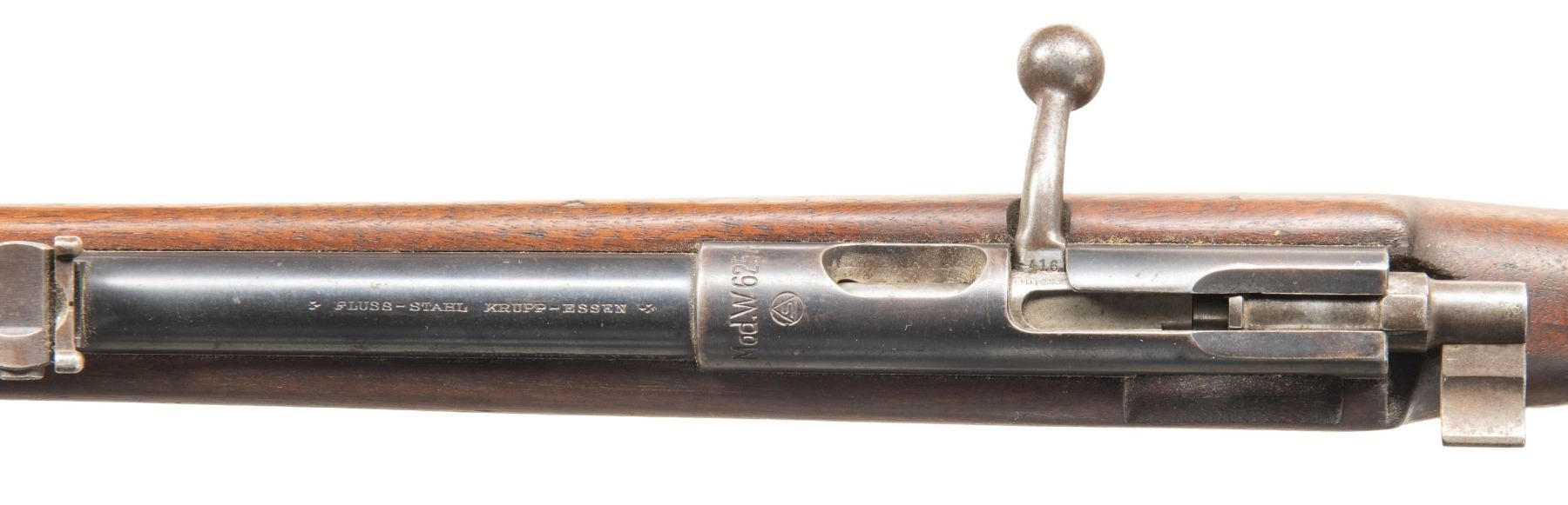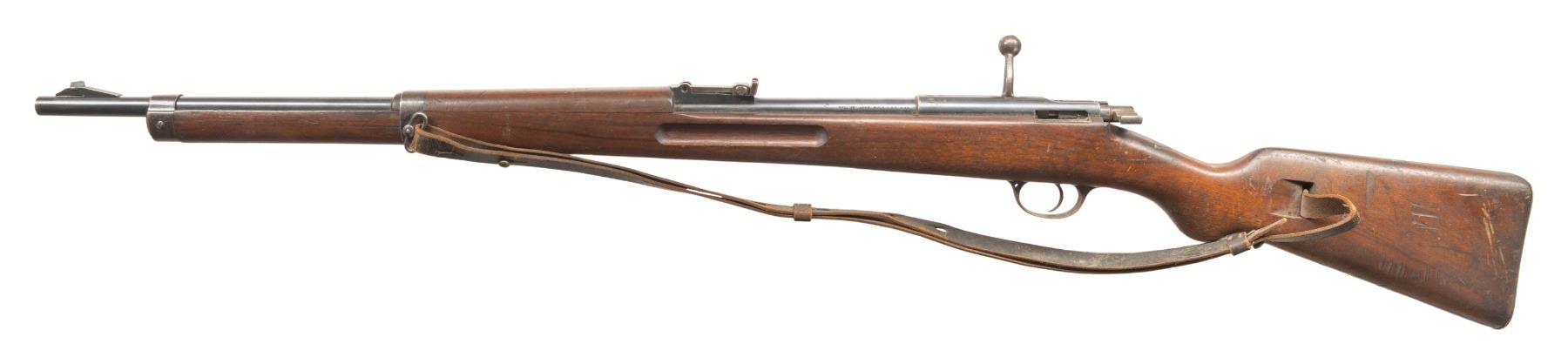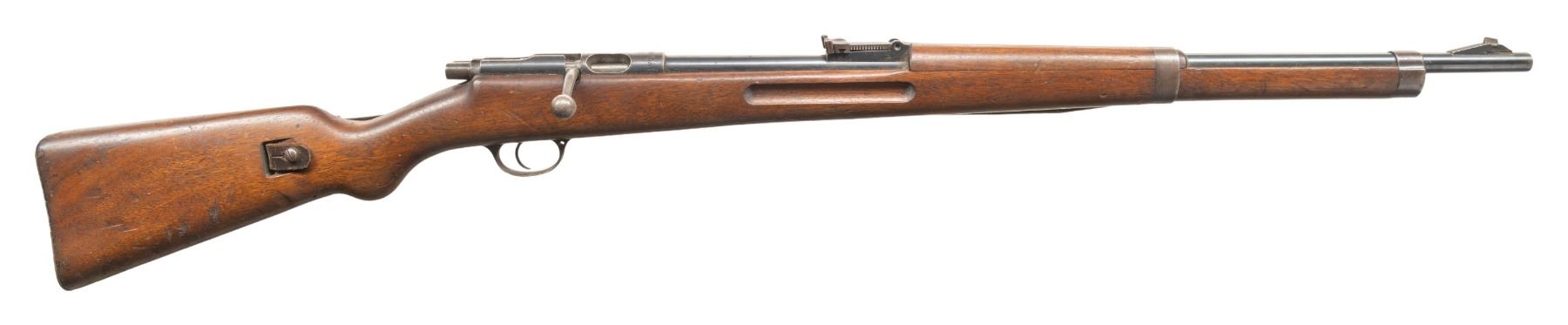 Cal. 22 LR. S# 119416. Bbl. 26". Blade front sight. Tangent rear sight graduated to 200m. Matching numbers on bolt handle & bbl. 1930's German single shot bolt action training rifle. Bolt release assembly is missing allowing bolt to fall out to rear. Receiver ring has Simson triangle logo & 625A marking. Blued finish. Walnut pistol grip stock with sling provisions & leather sling. CONDITION: stock shows a few abrasions, scattered dings, staining & handling marks. Metal retains 60% original blue with bands & triggerguard being gray, scattered oxidation, edge wear & handling marks. Action appears functional when hand cycled but bolt release assembly is needed to be sure. Very good bore with strong rifling. (25-6180/MJC). CURIO. $200-300.