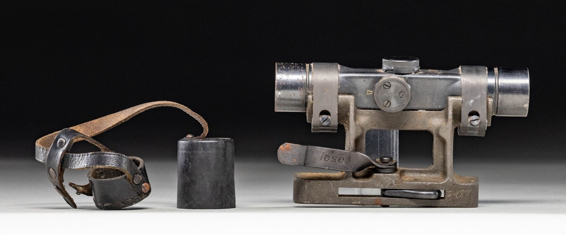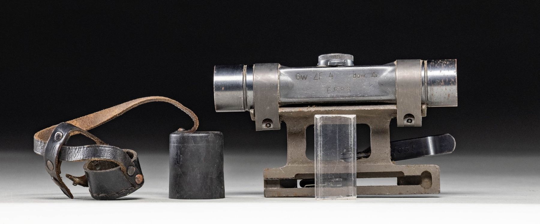 WW2 German ZF4 "dow" coded scope with mount. Mount appears original with "359" inspection stamp & is numbered "2477". Leather scope caps present. Scope has post reticle with cloudy optics. CONDITION: scope & mount show scattered edge wear & oxidation but retain most of their blued & phosphate finishes. (02-25996/MJC). $1,000-1,500.