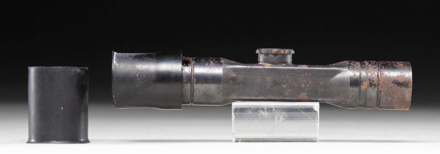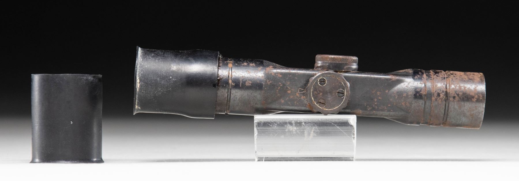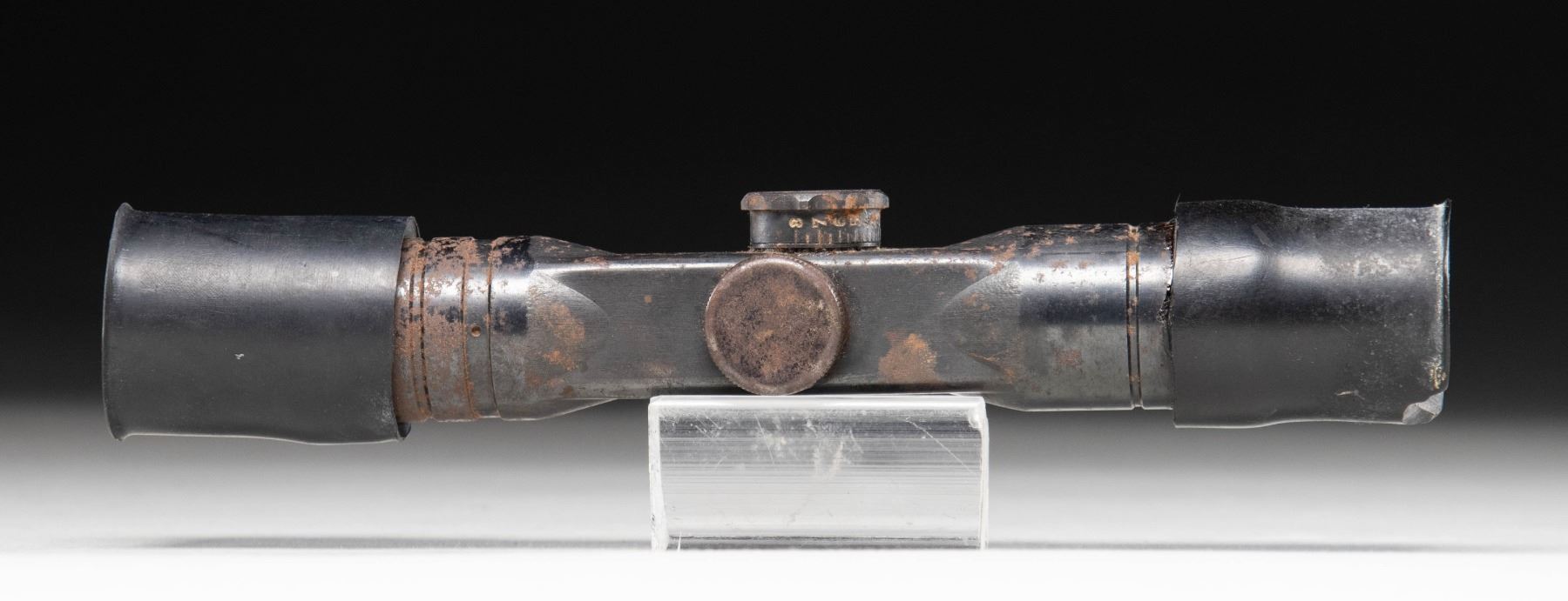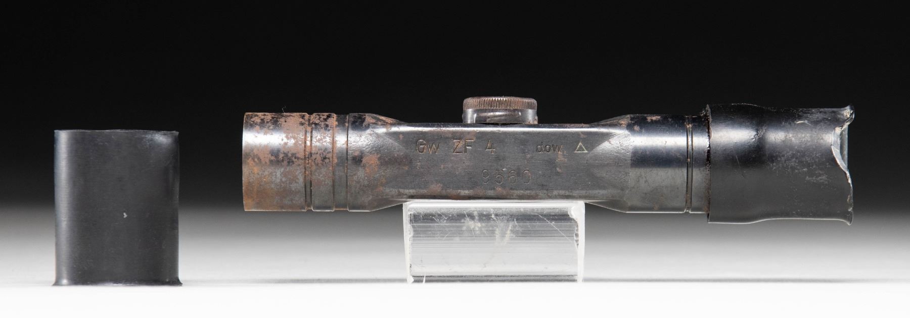 dow coded ZF4 scope serial # 9560. Rubber eyepieces present but no mount. Scope has post reticle & poor cloudy optics. CONDITION: rubber covers show notable white staining mostly on inside, discoloration & some chipping. Scope tube shows heavy oxidation & some edge wear. Rear eye cover not moving & maybe glued on. (02-25992/MJC). $300-500.