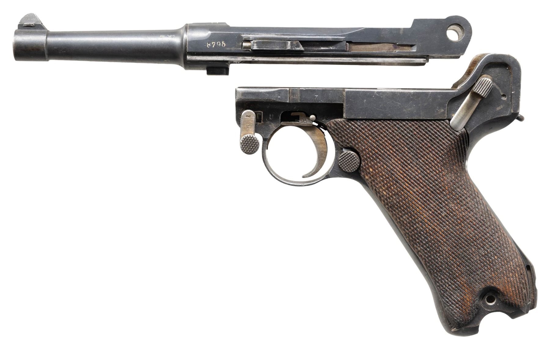 FRAME & PARTS. Cal. 9mm Luger. S# 8795c. Bbl. 4". P.08 Luger semi-automatic frame and parts originally mfg. by Erfurt in 1917 for the Imperial German military. The top of the bbl. extension is marked "1917", with Erfurt arsenal proofs marked on the right. Underside of the bbl. is marked with a British import proofs. Frame and other small parts exhibit Erfurt proofs. Metal components exhibit a blue finish overall, save for on some small parts, which exhibit a straw finish. Frame is mounted with 2-piece checkered wood grips. Nearly all numbers are matching, and include the frame, takedown lever, trigger, safety lever & bar, hold-open latch, bbl., bbl. extension, as well as the trigger bar. Grips are mis-matched, but match themselves. Toggle assembly and sideplate are absent. CONDITION: metal components retain the majority of their period blue finish, exhibiting some areas of light to mild wear and thinning, scattered superficial handling marks, as well as scattered spots of light to mild surface oxidation and pitting. Strawed parts retain large amounts of their finish, exhibiting areas of wear and thinning that show through to gray patina. Bore is bright, exhibiting consistent mild pitting, while retaining strong rifling throughout. Grips show smoothing, as well as some scattered marks from handling and storage, but otherwise remain sturdy and serviceable. (25-470/MLW). MODERN. $300-500.