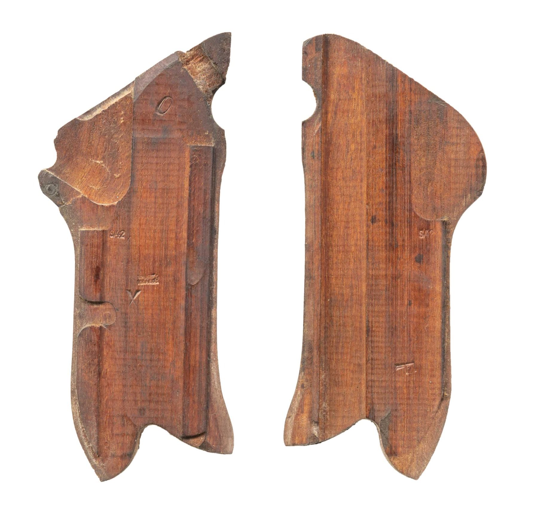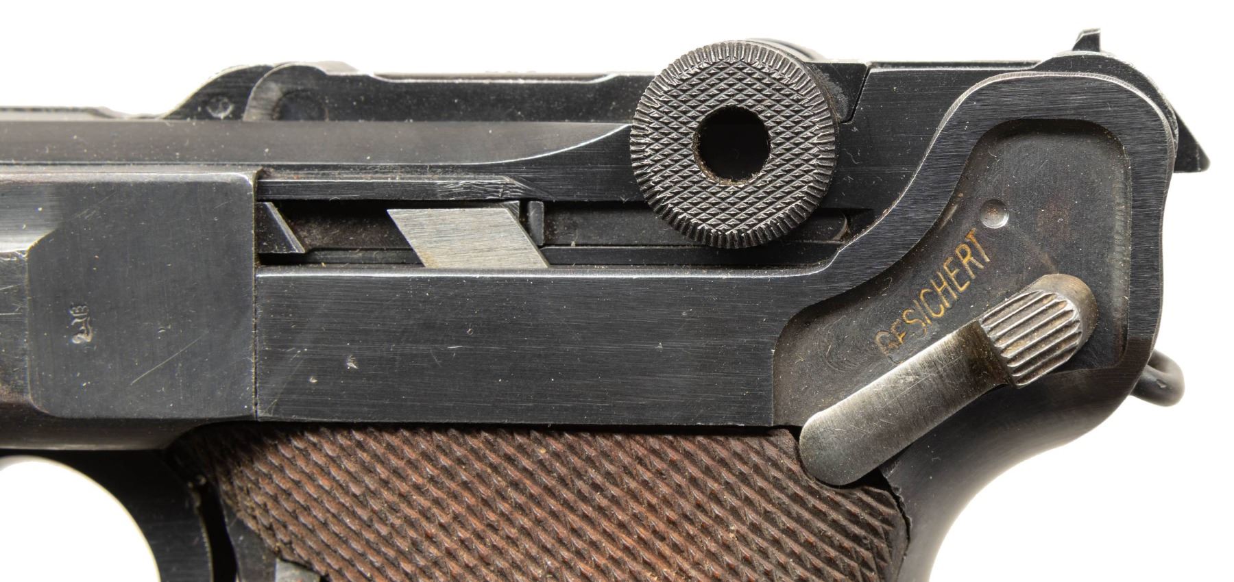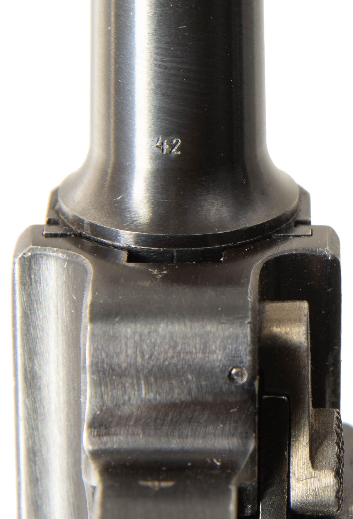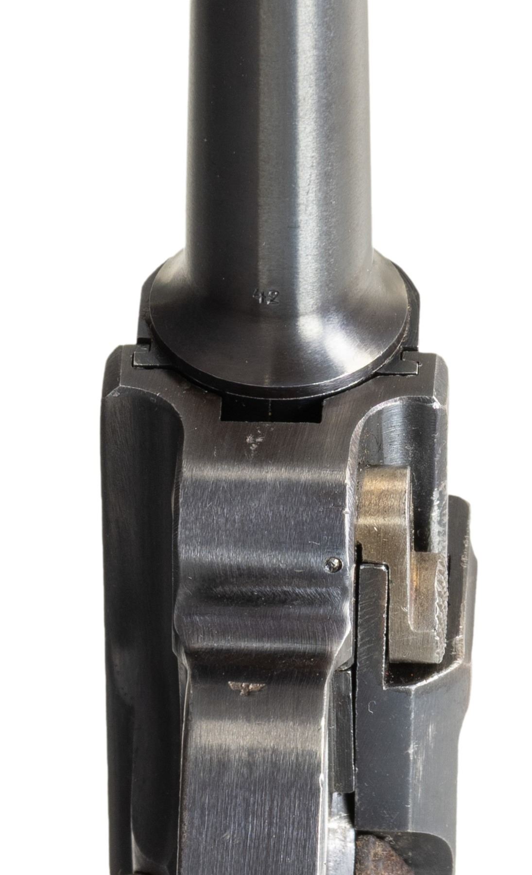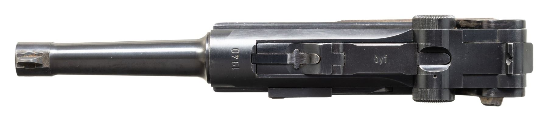 CODE "1940" DATE P.08 LUGER SEMI-AUTOMATIC PISTOL. Cal. 9mm Luger. NSN. Bbl. 3 15/16". P.08 Luger semi-automatic pistol mfg. by Mauser in 1940. The top of the bbl. extension is marked with the 4-digit year of mfg. "1940", with no Mauser arsenal proofs marked on the right. Toggle is marked with Mauser's "byf" mfg. code. Bbl. is marked with a Mauser Eagle/655 acceptance proof, with a Mauser "42" code proof (indicating Mauser mfg. armorer's spare part/component) marked on the underside. Front of trigger guard bow is unusually marked with a German military eagle firing proof, with a German military droop eagle firing proof marked on the left side of the breechblock. Takedown lever, sideplate, and hold-open latch exhibit an Imperial German Erfurt arsenal crowned proof, indicating mfg. as an armorer's spare part/component. Firing pin is marked "HZaJt18" indicating origin from Heeres-Zeugamter Ingolstadt (Ordnance Depot Ingolstadt). Additionally, and most unusual about this example is the lack of a S# on any part, including major components like the frame and bbl. extension, with the only S# present being "78" on the safety lever. Thorough inspection indicates no signs of any markings, numbers, or proofs having been removed, nor any parts having been refinished. Frame, trigger, bbl./bbl. extension, ejector, breechblock, toggles, and grip screws exhibit a salt blue finish, with the ejector having acquired a plum coloration. Takedown lever and safety lever exhibit a straw finish. Sideplate appears to exhibit a rust blue finish, with the entire hold-open latch assembly being polished in-the-white. Firing pin exhibits areas of straw-like coloration from apparent heat treatment. Frame is mounted with 2-piece checkered wood grips, each marked with a Mauser "S/42" proof on the interior, the left panel also marked with a Mauser Eagle/WaA655 proof. Standard P.08 dovetailed blade front sight and fixed V-notch rear sight. Conclusively, based off of proofing (or lack there of), this example appears to be a P.08 that was assembled from spare on hand parts at a repair depot, possibly Ingolstadt. MAGS: 1 plated 8-rd. mag., with unnumbered wood plug marked with an Erfurt crown proof. CONDITION: excellent, with metal components retaining the vast majority of their original factory finishes, exhibiting some light edge wear that is fading to gray patina, as well as some scattered superficial handling marks overall. Grip straps exhibit light wear thinning that is lightly showing through to a gray patina. Brilliant mirror bore, retaining sharp and well defined rifling throughout. Proper manual mechanics. Grips are very good to excellent overall. A extremely unusual, intriguing, and high condition Mauser P.08 Luger that warrants additional research. (25-5036/MLW). CURIO. $1,000-1,500.